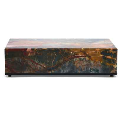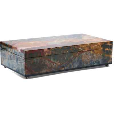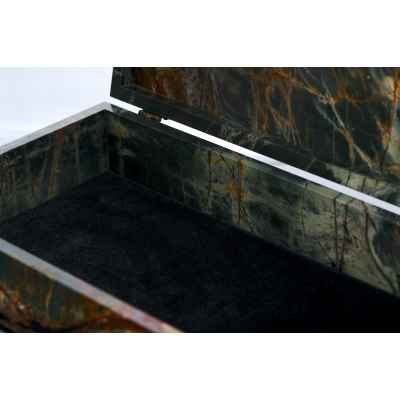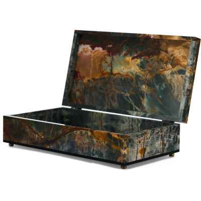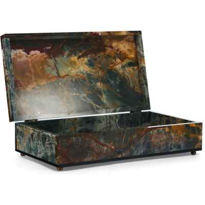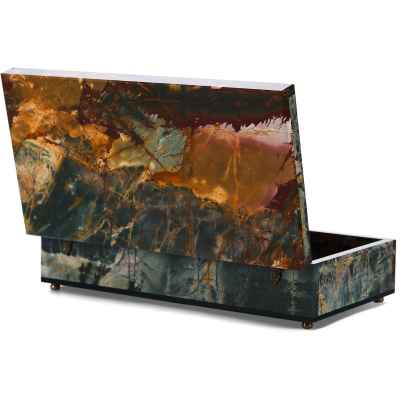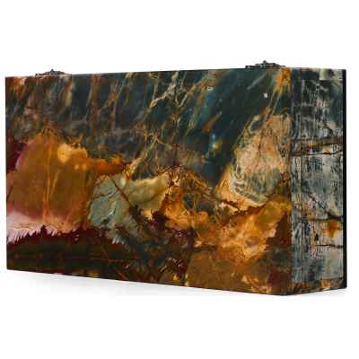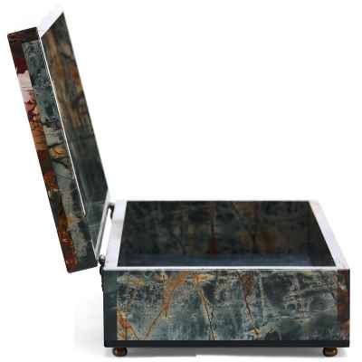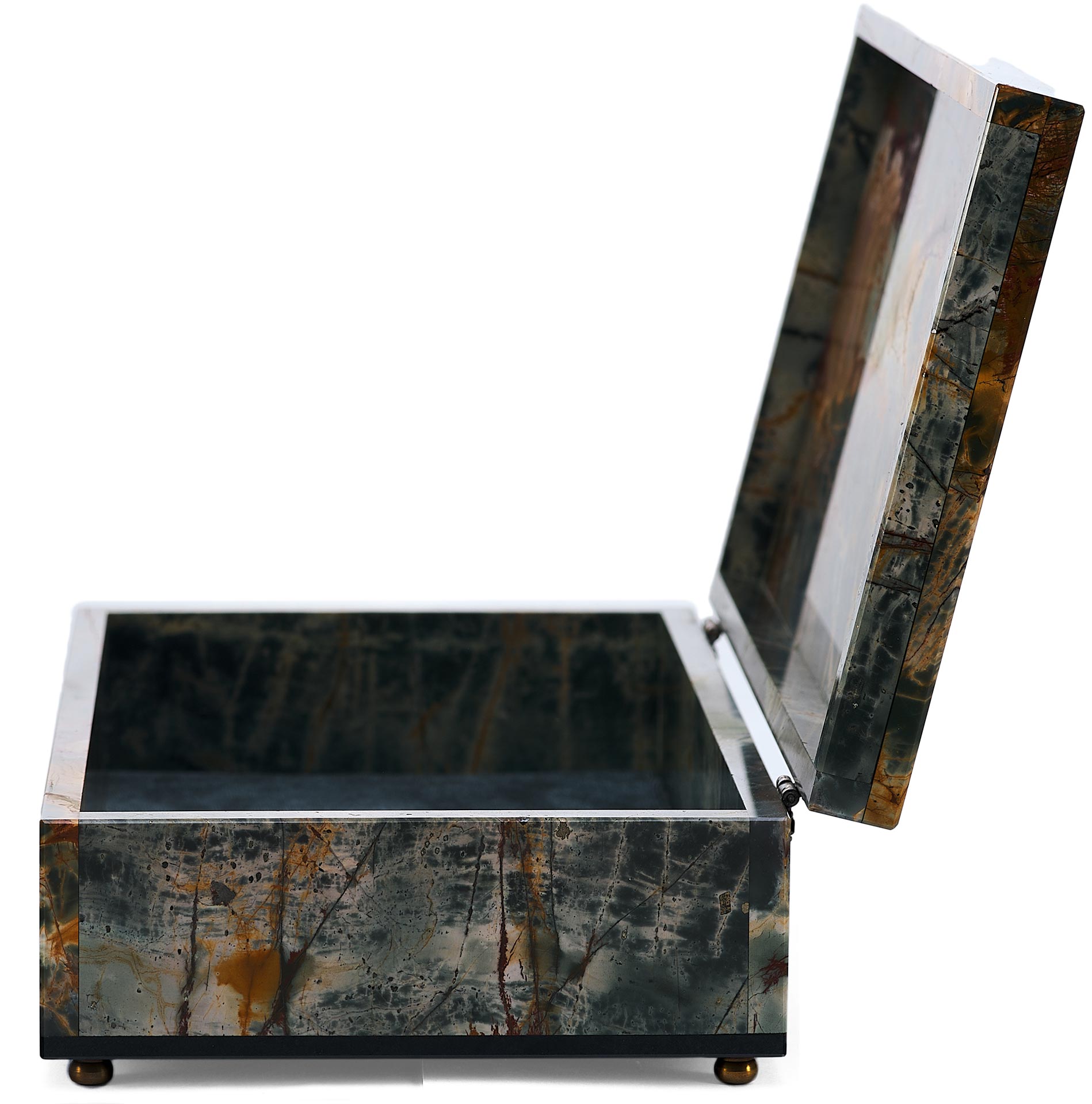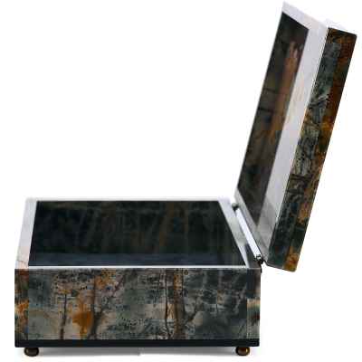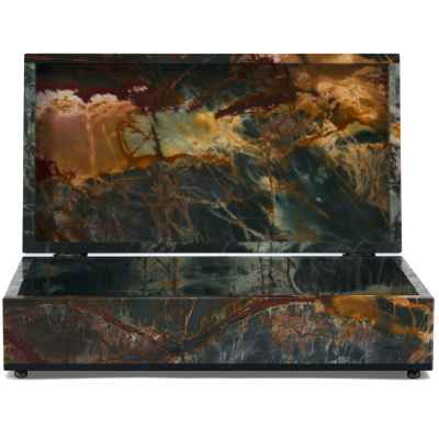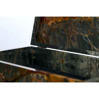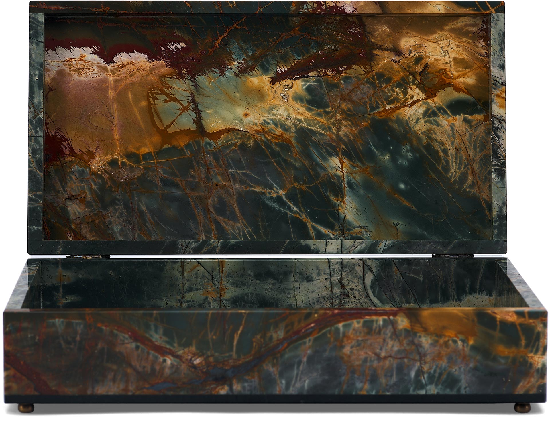 Представленный предмет — шкатулка из яшмы Пикассо, выполненная российским мастером Александром Антоновым. Шкатулка имеет строгую прямоугольную форму, корпус установлен на четырех металлических ножках, что придает ей устойчивость и завершенность. Изделие состоит из основного корпуса и крышки с аккуратной фурнитурой из металла с декоративным тиснением. Поверхность камня тщательно отполирована, что позволяет в полной мере раскрыть природный рисунок яшмы.