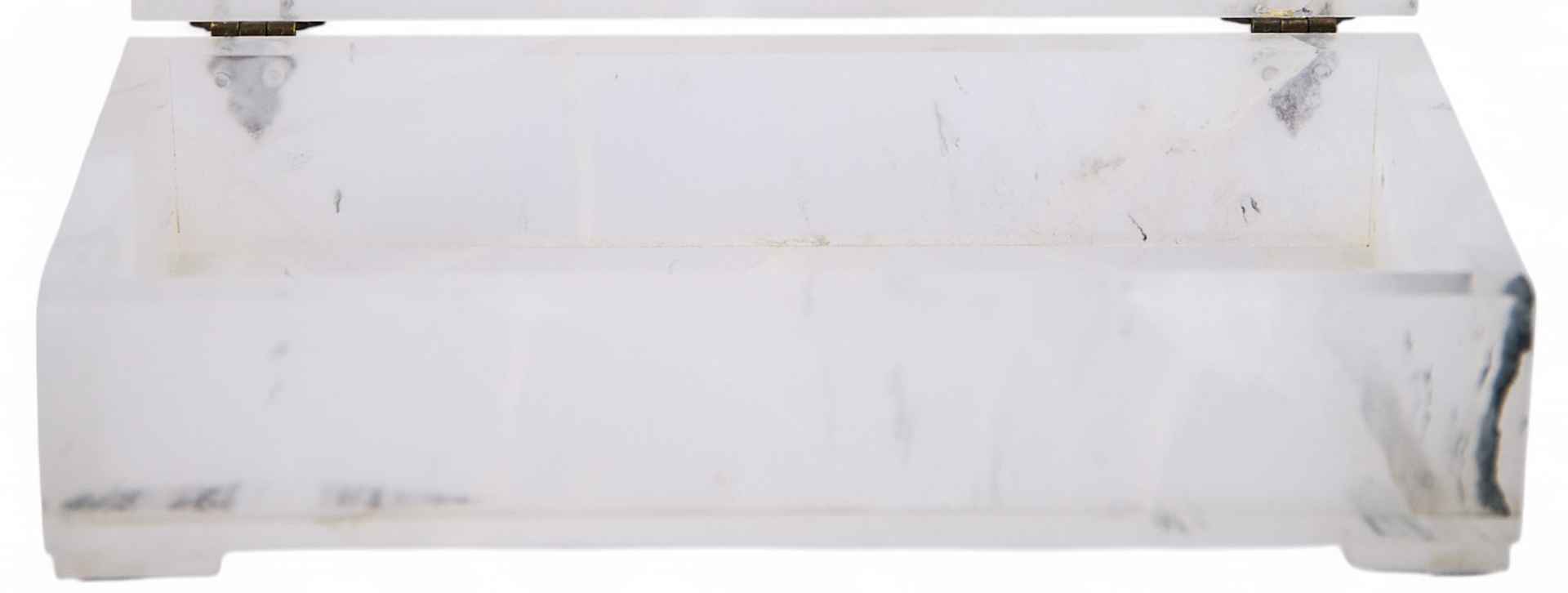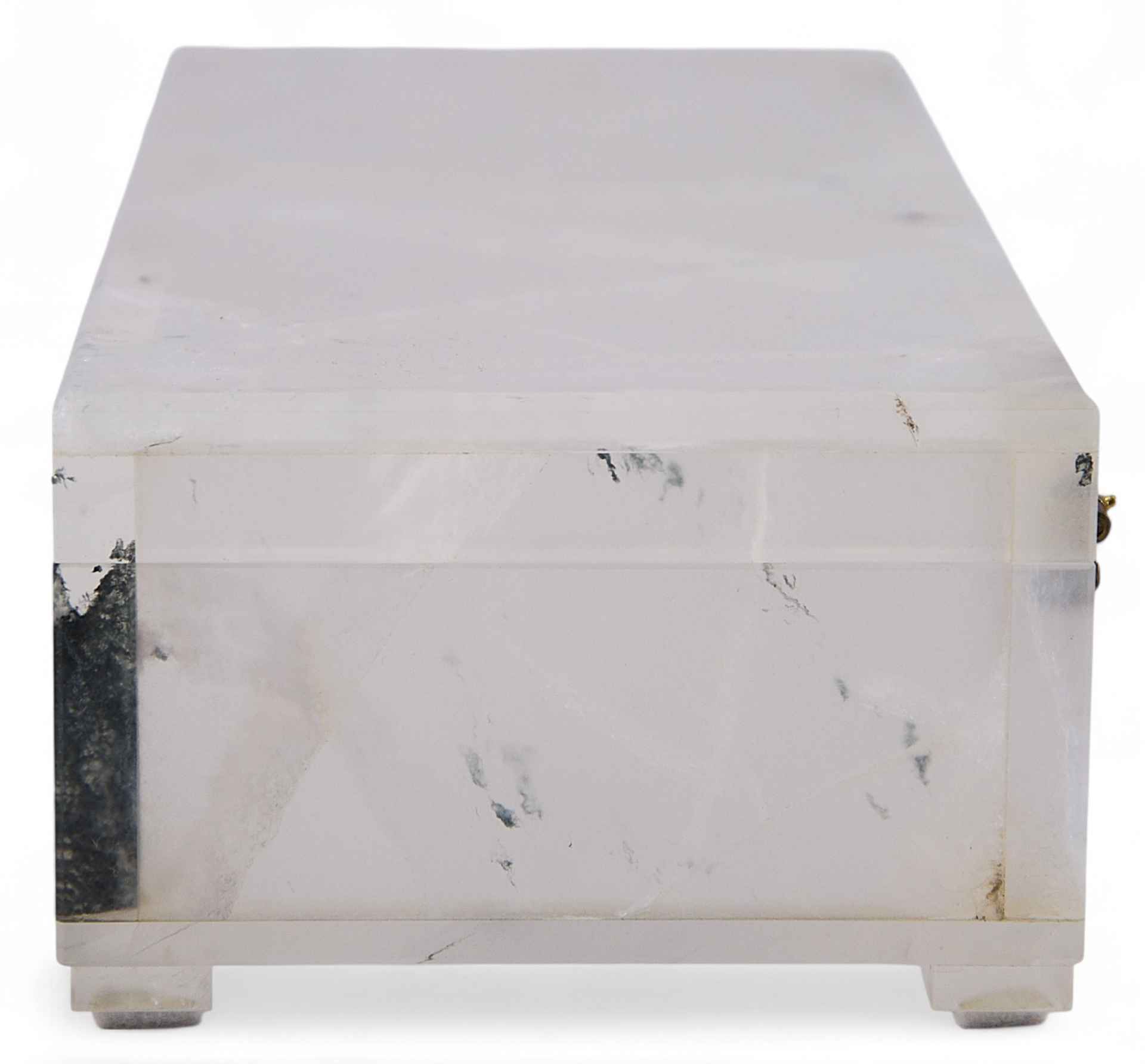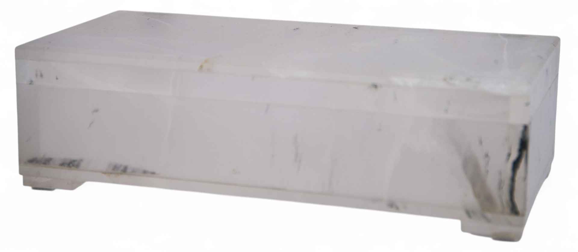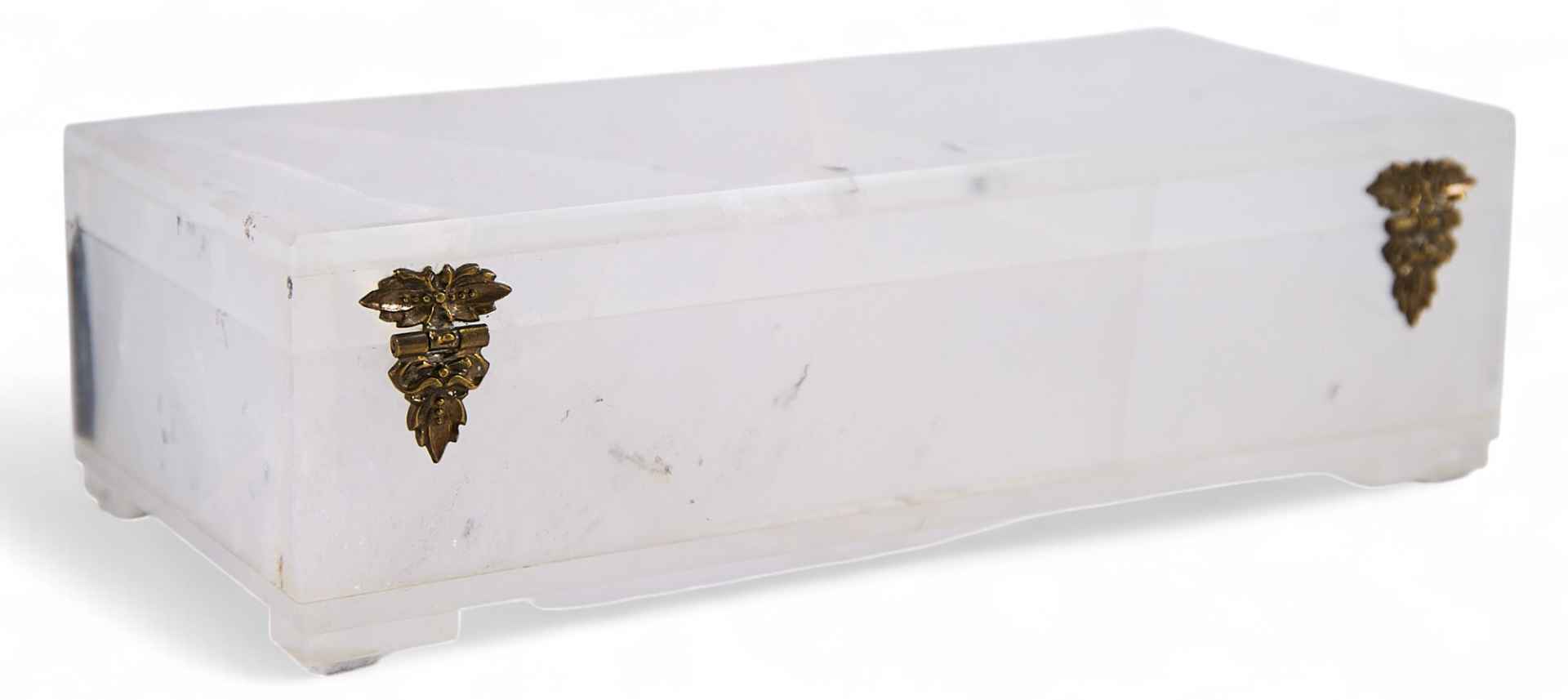 Шкатулка прямоугольной формы состоит из корпуса и крышки. Основание плоское. Предмет изготовлен из горного хрусталя. Минерал встречается в природе: в Крыму, Карпатах, во Французских и Швейцарских Альпах, на Урале, Памире, Мадагаскаре, Бразилии, Китае и Южной Якутии. Он характеризуется прозрачностью, после полировки приобретает хороший блеск. Это его