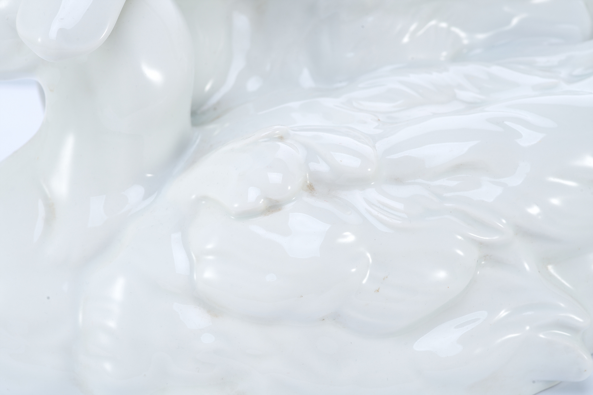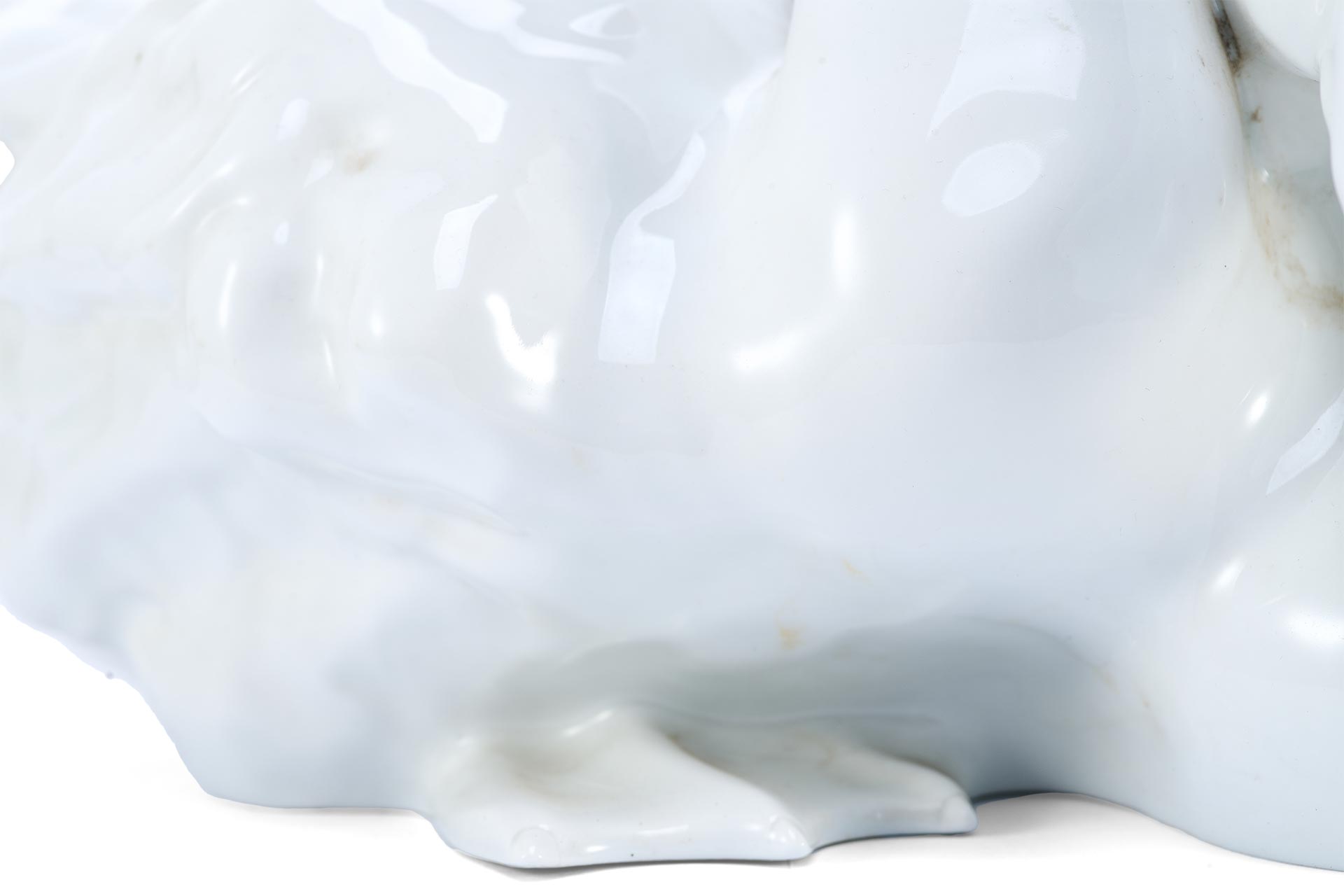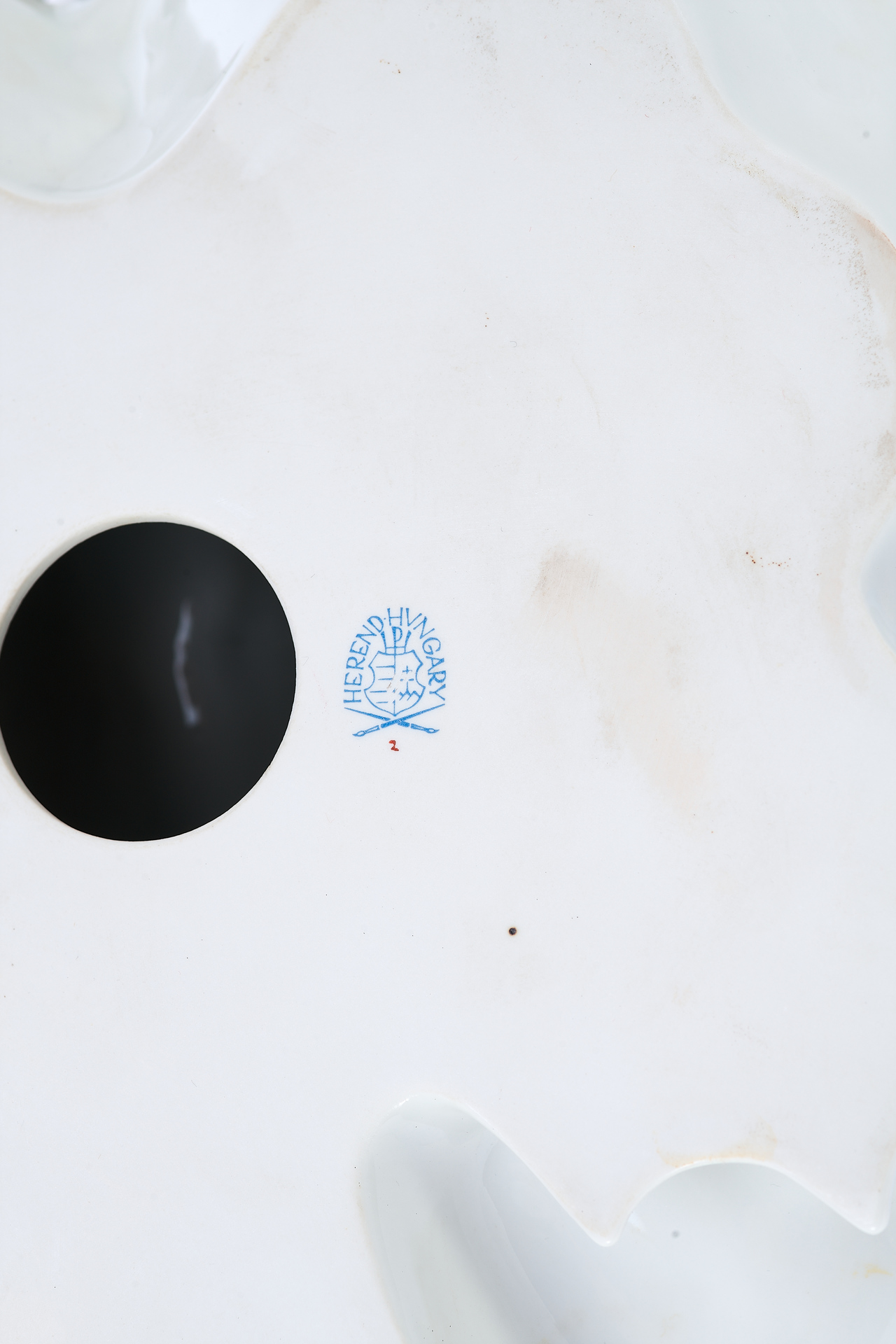 Скульптура выполнена из фарфора методом литья, с характерной тонкостью проработки деталей, присущей продукции Herend. Несмотря на отсутствие росписи в данном экземпляре, существуют и расписные версии этой модели, что указывает на разнообразие исполнений. Глянцевая глазурь подчеркивает выразительные изгибы форм, делая композицию живой и пластичной. На основании предмета имеется клеймо Herend, подтверждающее его происхождение, а также оттиск номера формы в массе.