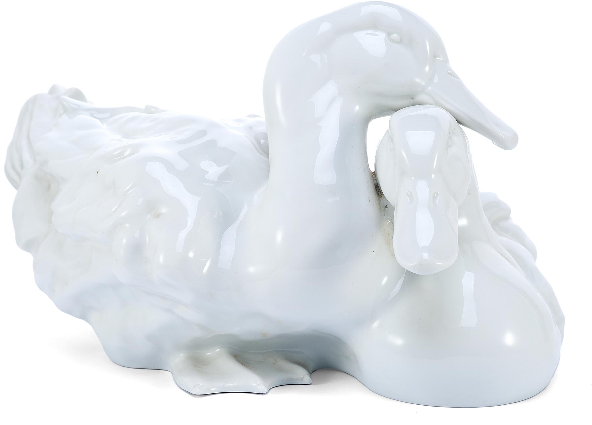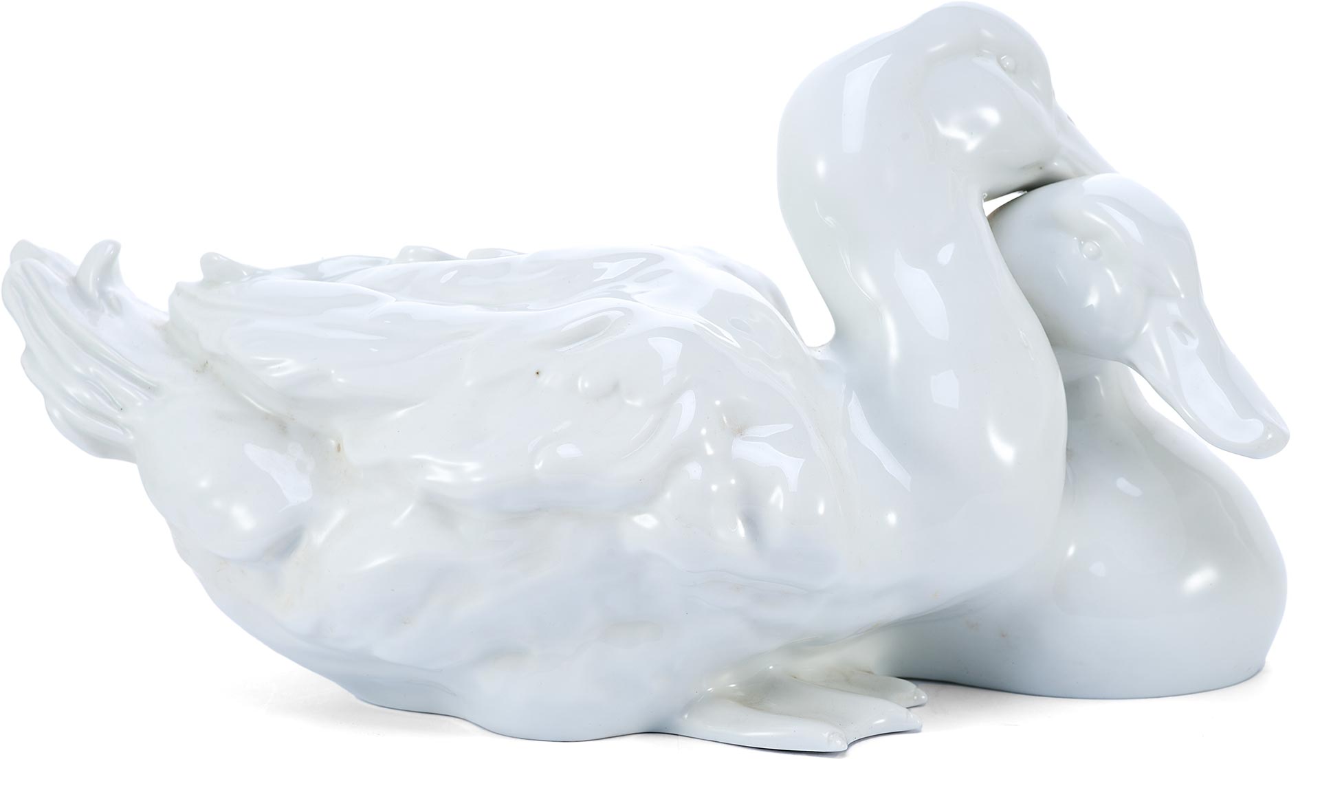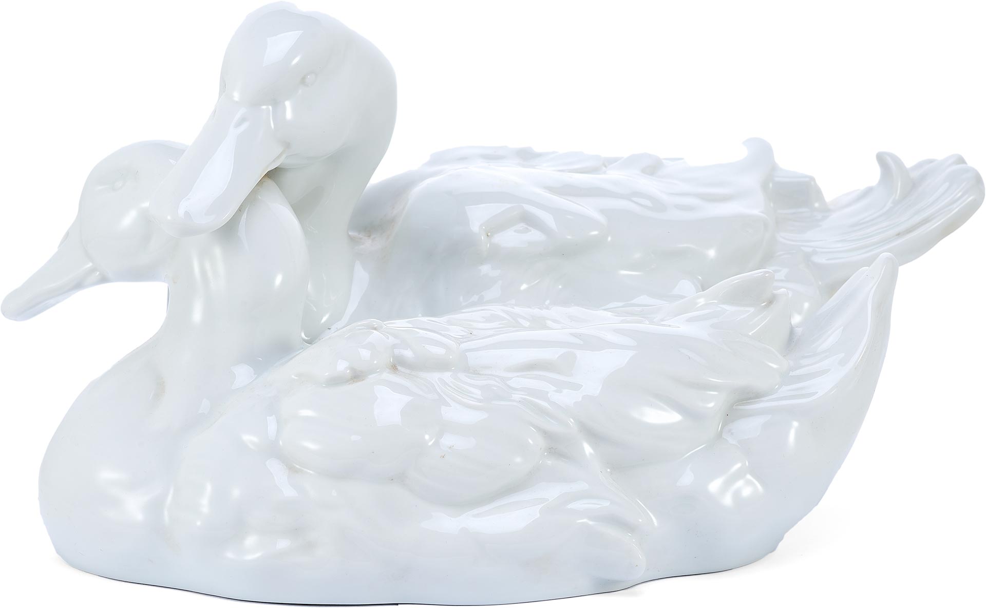 Представленная фарфоровая скульптура «Утки» является изящным примером декоративной пластики, созданной на известной фарфоровой мануфактуре Herend в Венгрии в период 1960-х — 1986 годов. Композиция изображает двух уток, расположившихся рядом в спокойной и нежной позе, что символизирует супружескую гармонию и верность. Мягкое моделирование форм подчёркивает текучесть линий и гладкую структуру поверхности.