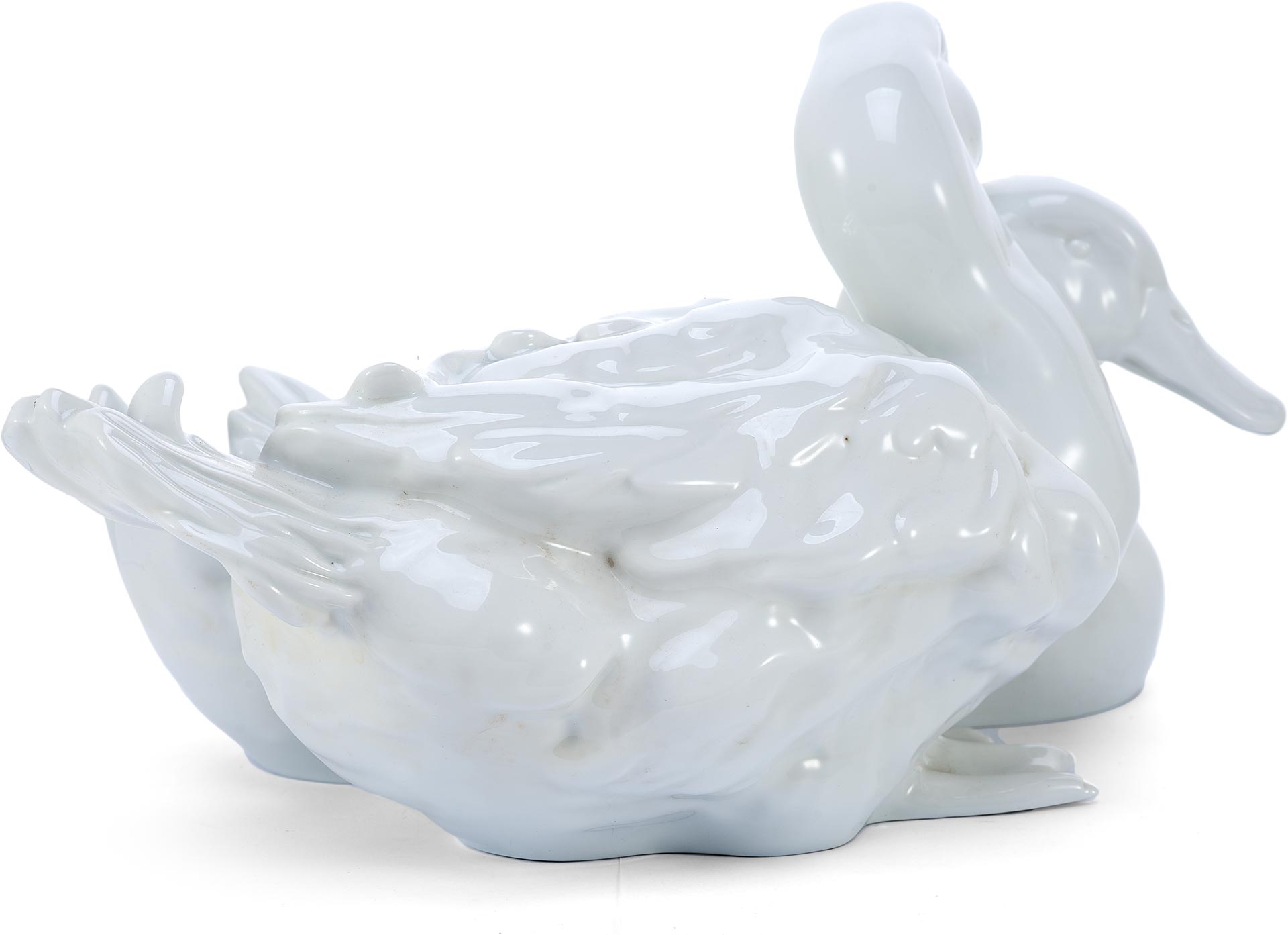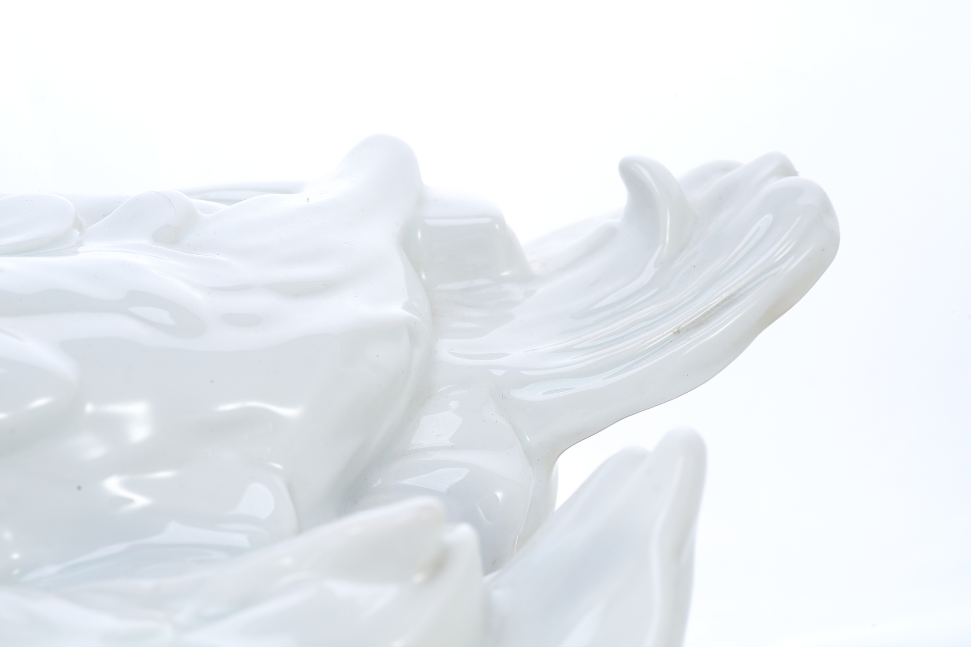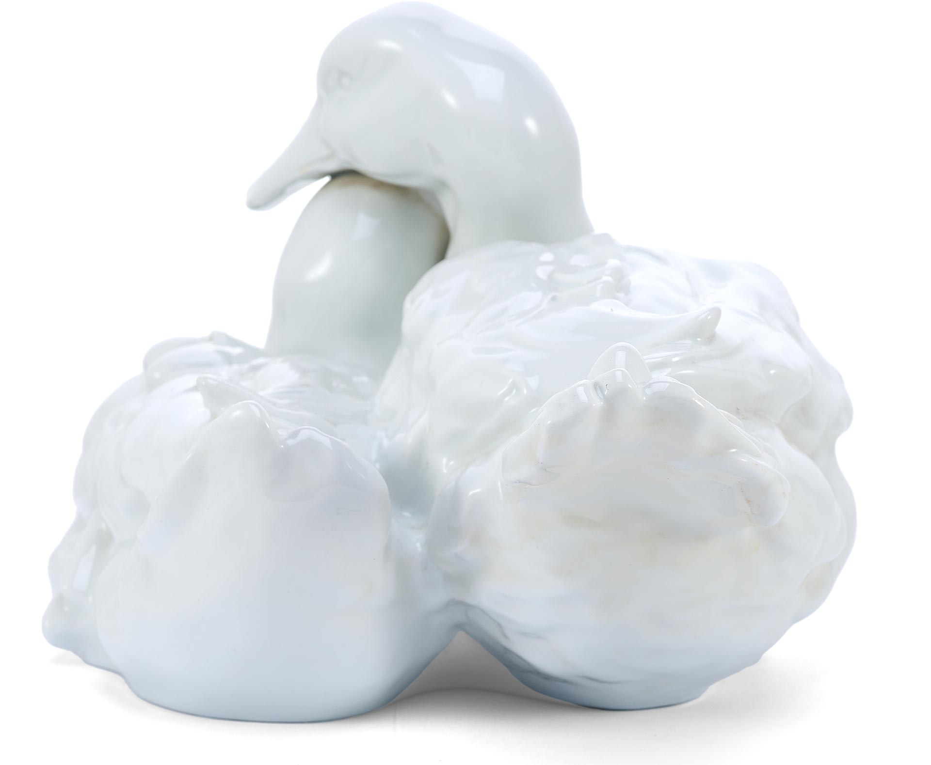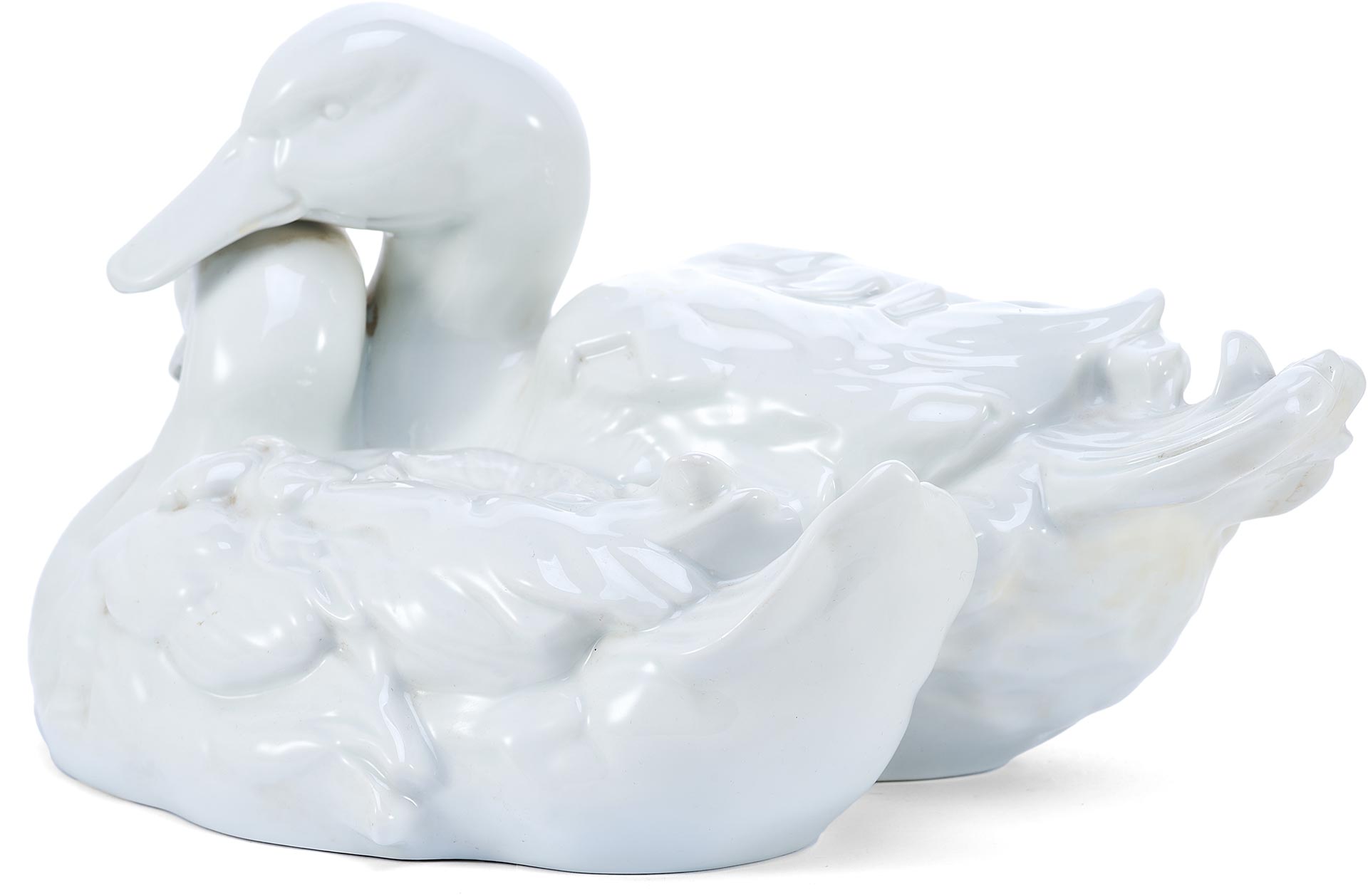 Представленная фарфоровая скульптура «Утки» является изящным примером декоративной пластики, созданной на известной фарфоровой мануфактуре Herend в Венгрии в период 1960-х — 1986 годов. Композиция изображает двух уток, расположившихся рядом в спокойной и нежной позе, что символизирует супружескую гармонию и верность. Мягкое моделирование форм подчёркивает текучесть линий и гладкую структуру поверхности.