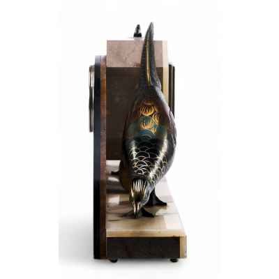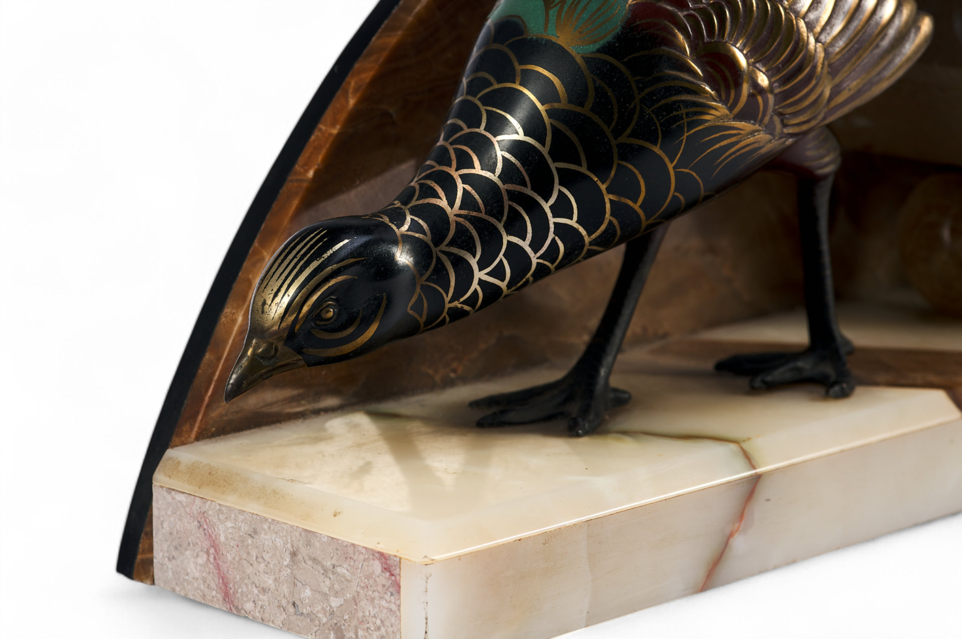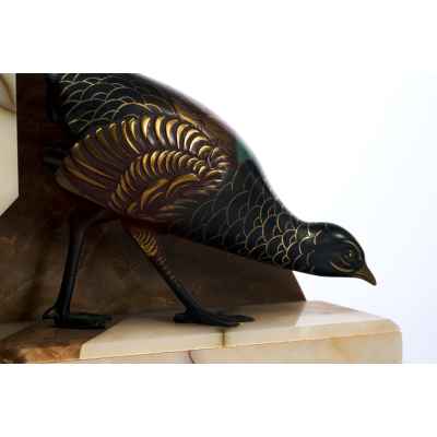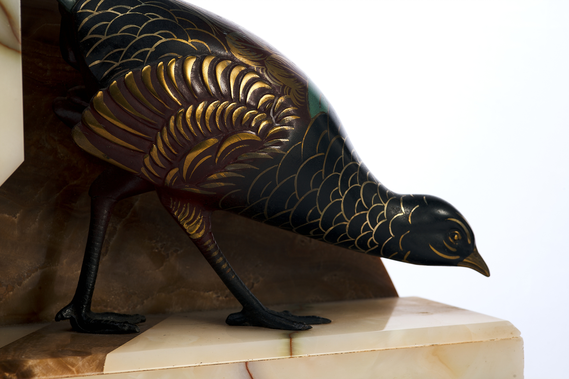 Настольные часы «Два фазана» представляют собой выразительный образец декоративно-прикладного искусства во второй четверти XX века, выполненный в стиле ар-деко. Композиция объединяет функциональность часового механизма и декоративность скульптуры, образуя цельное художественное произведение. Центральная часть — восьмигранный корпус часов из светлого мрамора, обрамлённый симметричной композицией из двух фигур фазанов, отлитых из металла с патинированием и позолоченными деталями, установленной на многоцветном основании из агата и мрамора.