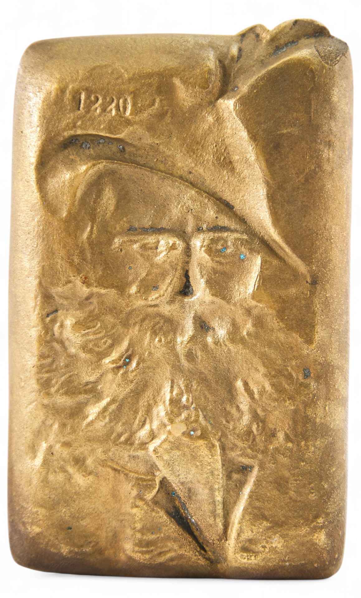 Основным материалом изделия является бронза, выполненная методом литья. Лоток имеет прямоугольную форму и украшен рельефным изображением старика-баварца в традиционной охотничьей шляпе с перышком, что придает предмету характерную этнографическую выразительность.