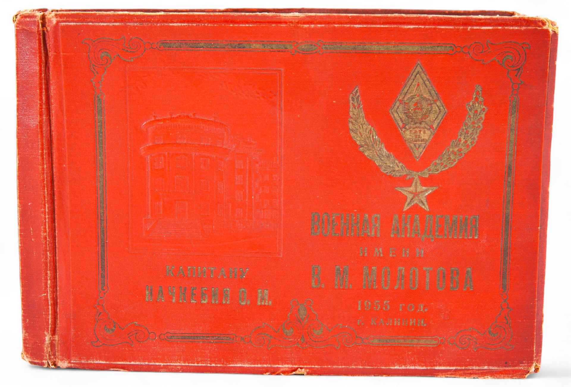 Альбом, состоящий из 24 листов и принадлежавший выпу скнику Военной академии имени В.М. Молотова, капитану О.М. Начкебия, о чем свидетельствуетименная дарственная надпись на верхней крышке обложки альбома.
