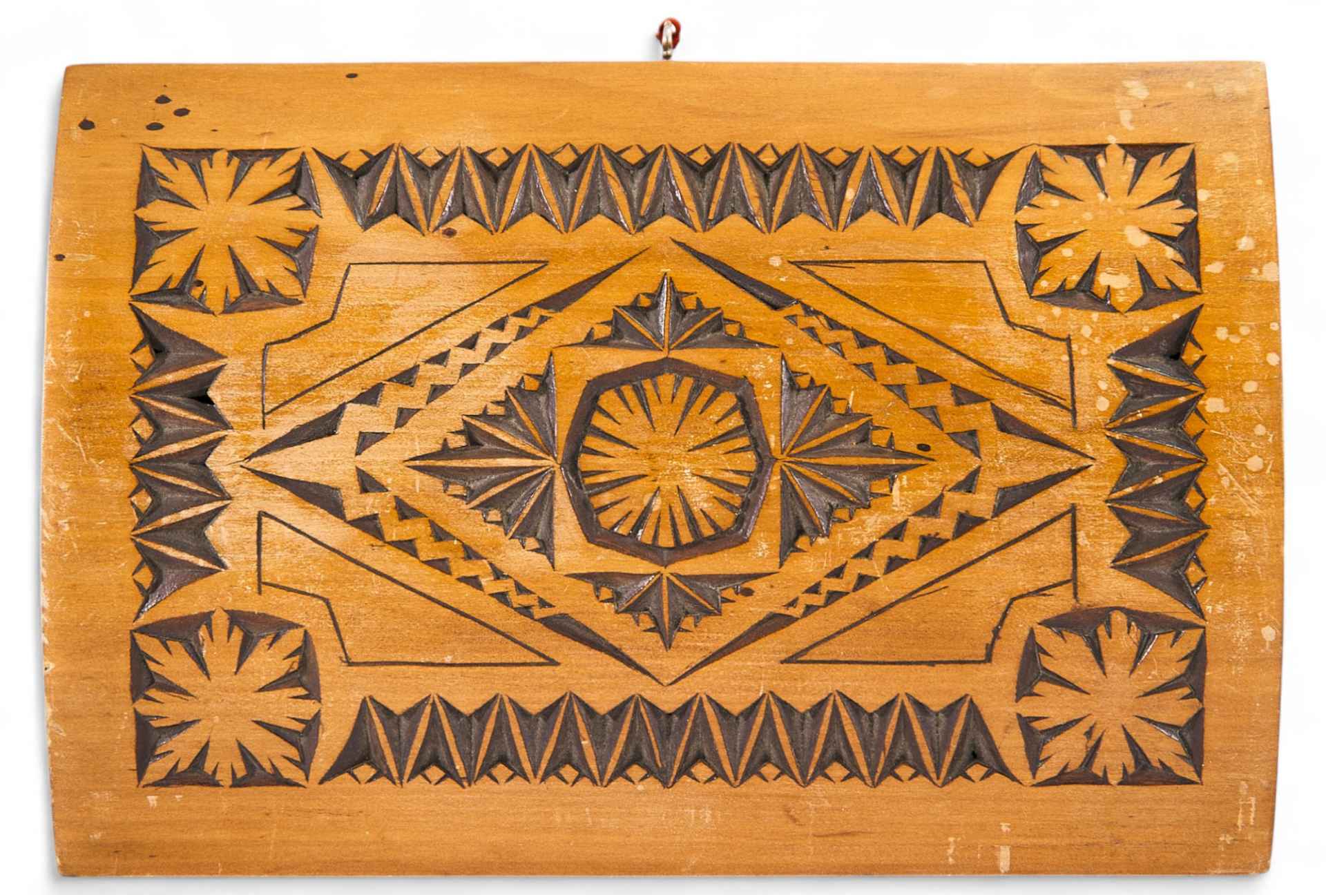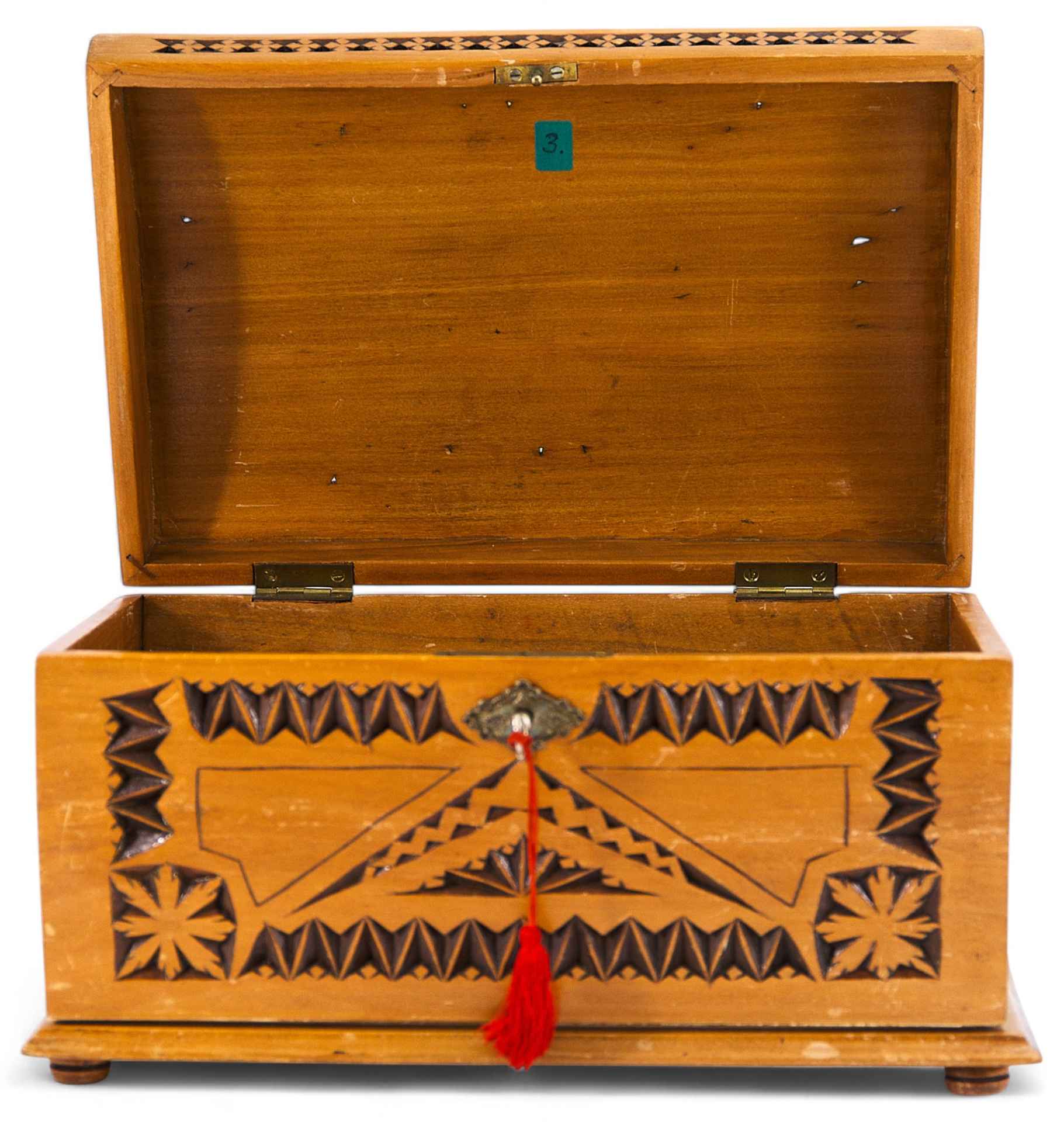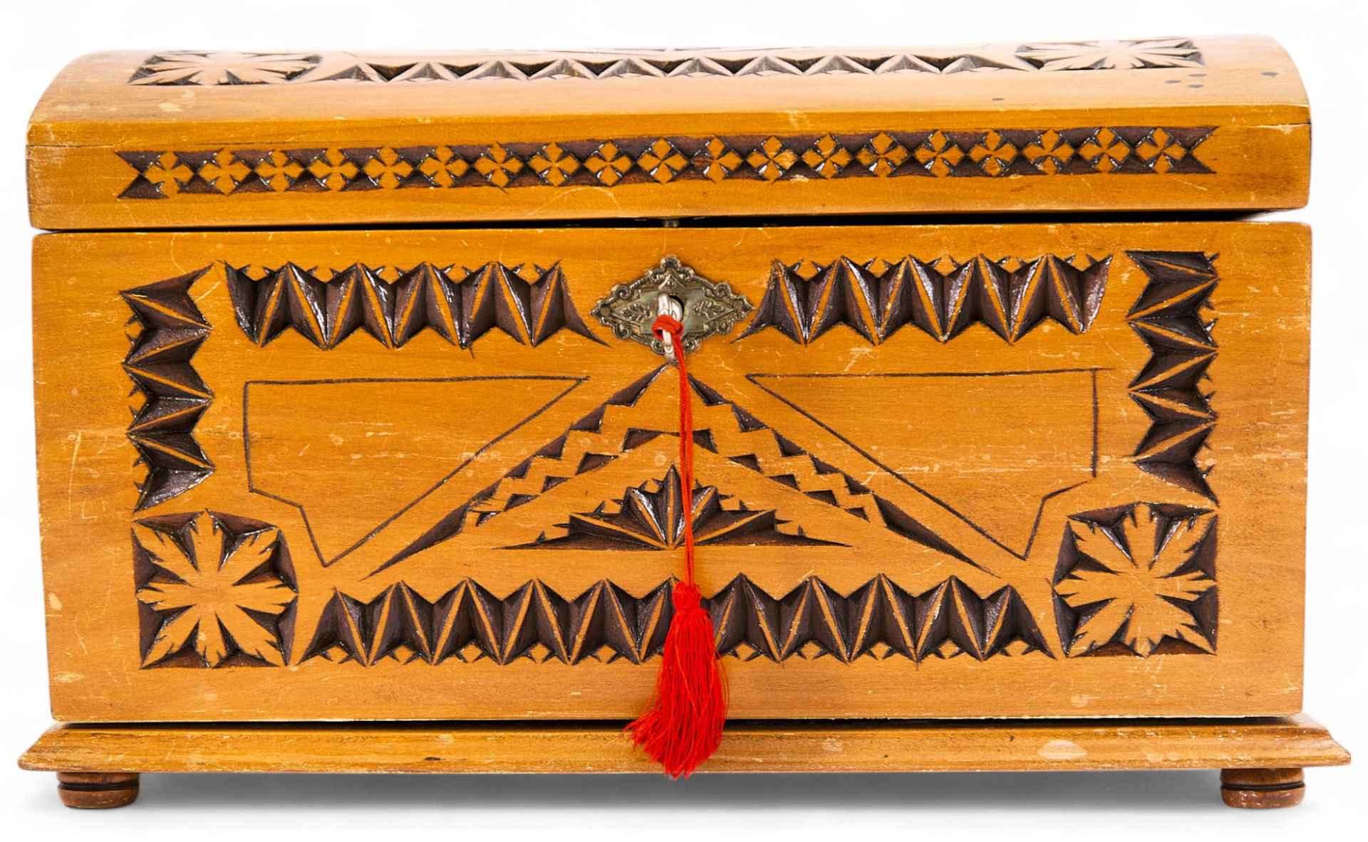 симметрии и приемы различных повторов одного или нескольких элементов.Геометрическая резьба на шкагулке состоит из различных комбинаций нескольких основных элементов, выполняемых ножом-косячком и полукруглыми стамесками. Наибольшее распространение в геометрической резьбе получили трехгранные выемки (треугольники), разнообразные по форме и размеру. Комбинации из этих треугольников создают узоры: витейка, змейка и сияния. Геометрическая резьба с узорами из уголков и сияния дает хорошую игру светотени и очень декоративна. Украшают поверхность шкатулки лучи розетки, представляющие собой вытянутые трехгранные выемки. Узор таких трехгранных порезок очень выразителен. Мастеру резчику удалось добиться гармоничного сочетания резного узора с плоскостью фона. Этот контраст и создал подлинную красоту резного декора. По своим художественным признакам шкатулка относится к продукции мастерских