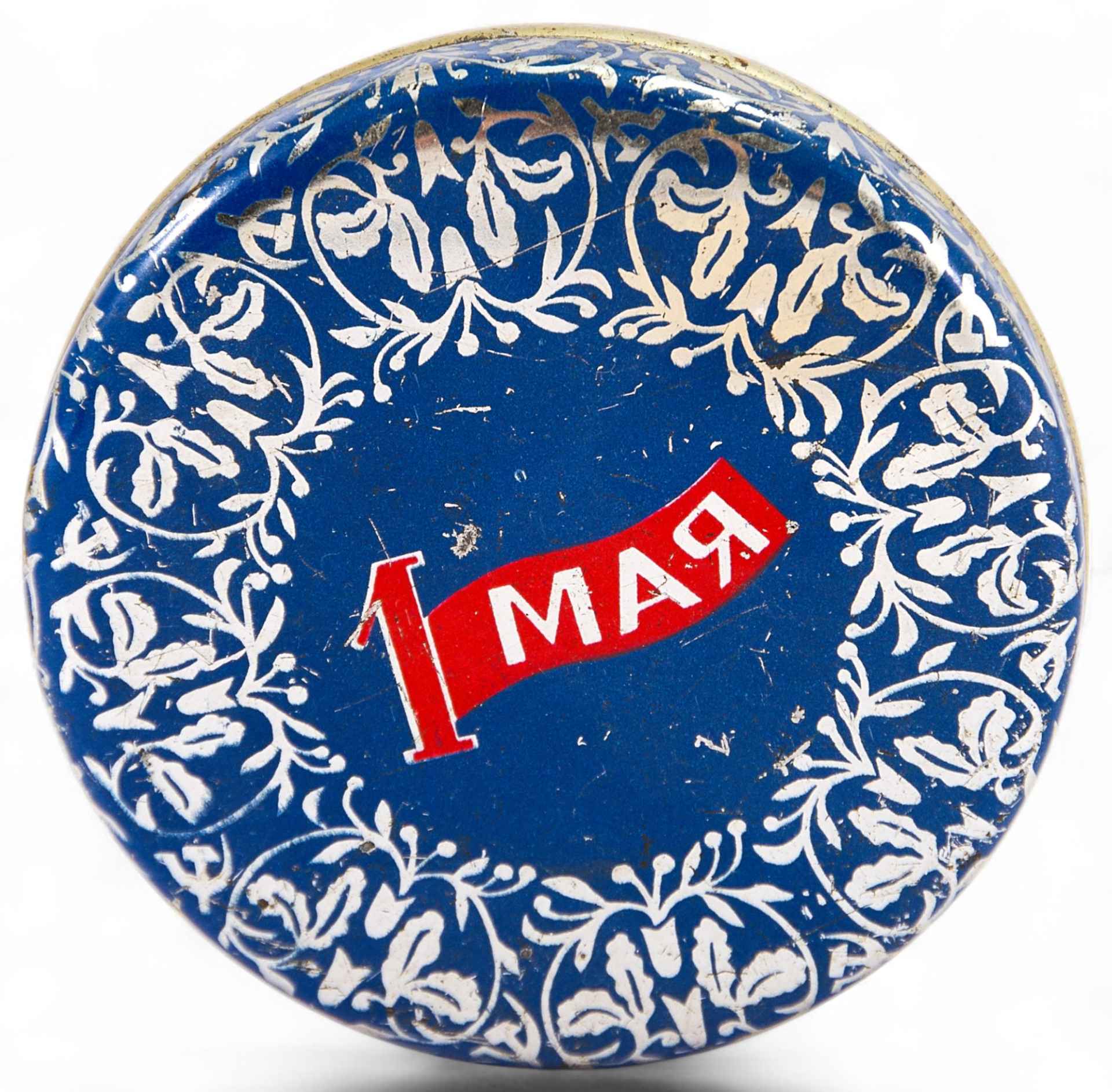 Круглая жестяная коробочка для леденцов “монпасье”. На крышке коробочки изображен красный флаг с надписью “1 мая”. По краям коробочки золотой растительный орнамент. Кондитерская упаковка всех видов и форм едва ли не с самого момента своего появления превратилась в востребованную и доступную площадку для массовой рекламы — в том числе и социальнополитической. Яркая обертка с броским названием горазда сильнее привлекает покупателя нежели простая