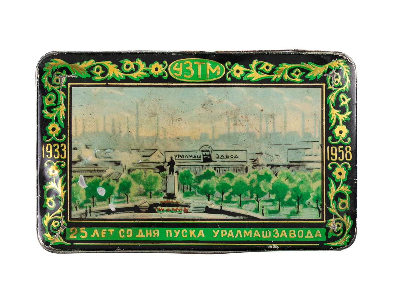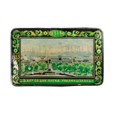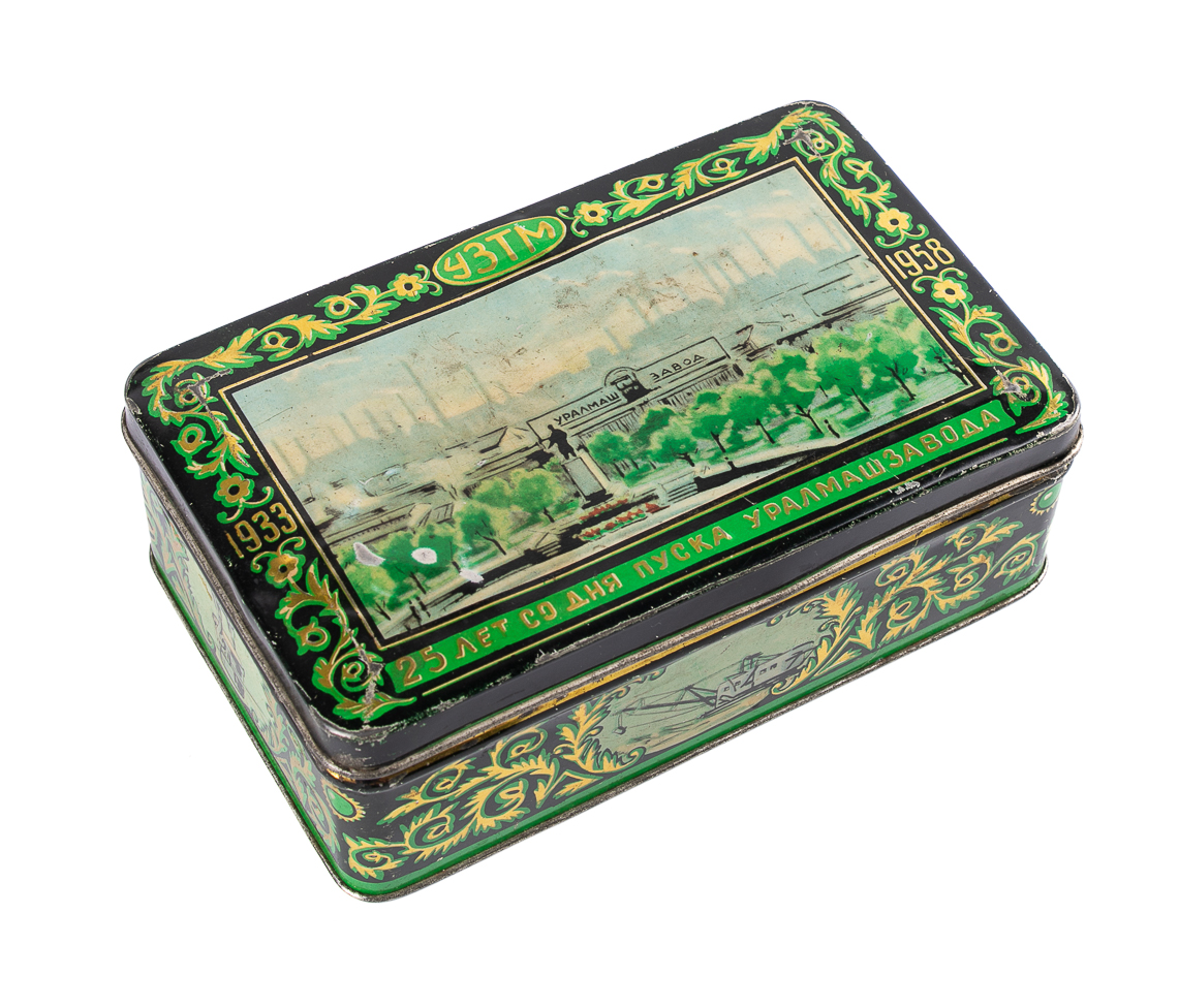 Предмет — жестяная шкатулка, изготовленная в 1958 году в честь 25-летия со дня запуска Уралмашзавода (УЗТМ). Изделие выполнено из жести с применением штамповки и хромолитографии, популярной технологии нанесения красочного изображения на металлические поверхности, получившей широкое распространение в декоративной и упаковочной продукции с конца XIX века.