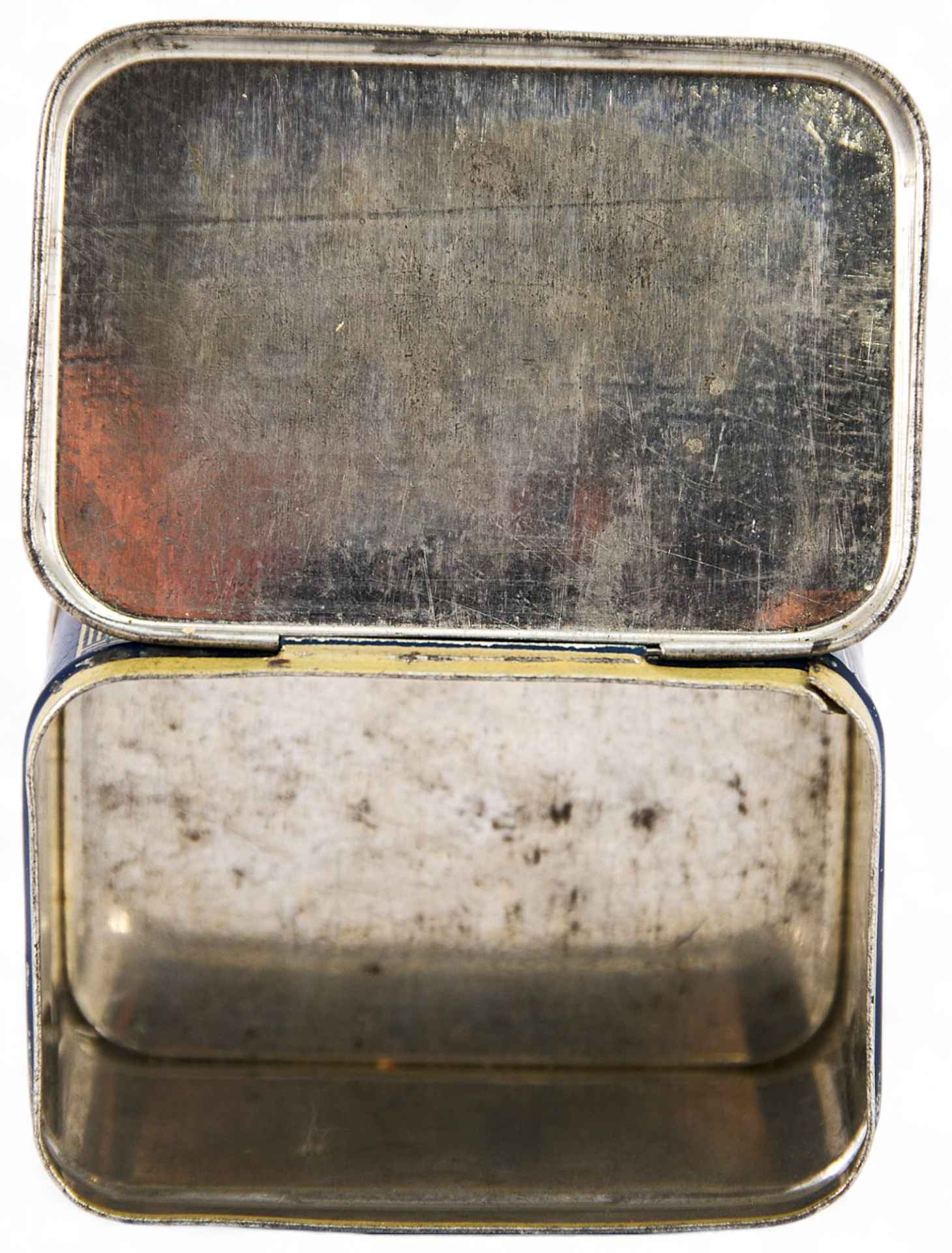 Прямоугольная, с закругленными углами, жестяная коробочка. На крышке коробочки изображена чайная плантация, надпись: ЧАЙ / первый сорт. На бортиках коробочки фабричный знак с налписью: «Министерство промышленности и продовольсвенных товаров СССР Главчай». С другой стороны: «чистый вес 50 грамм ГОСТ - 1938-46». Состояние использованных материалов не противоречит указанной датировке.