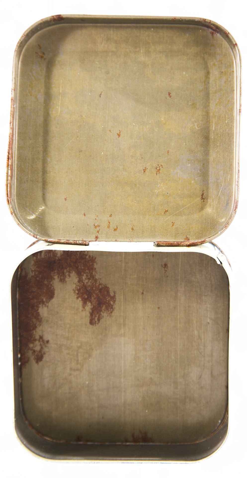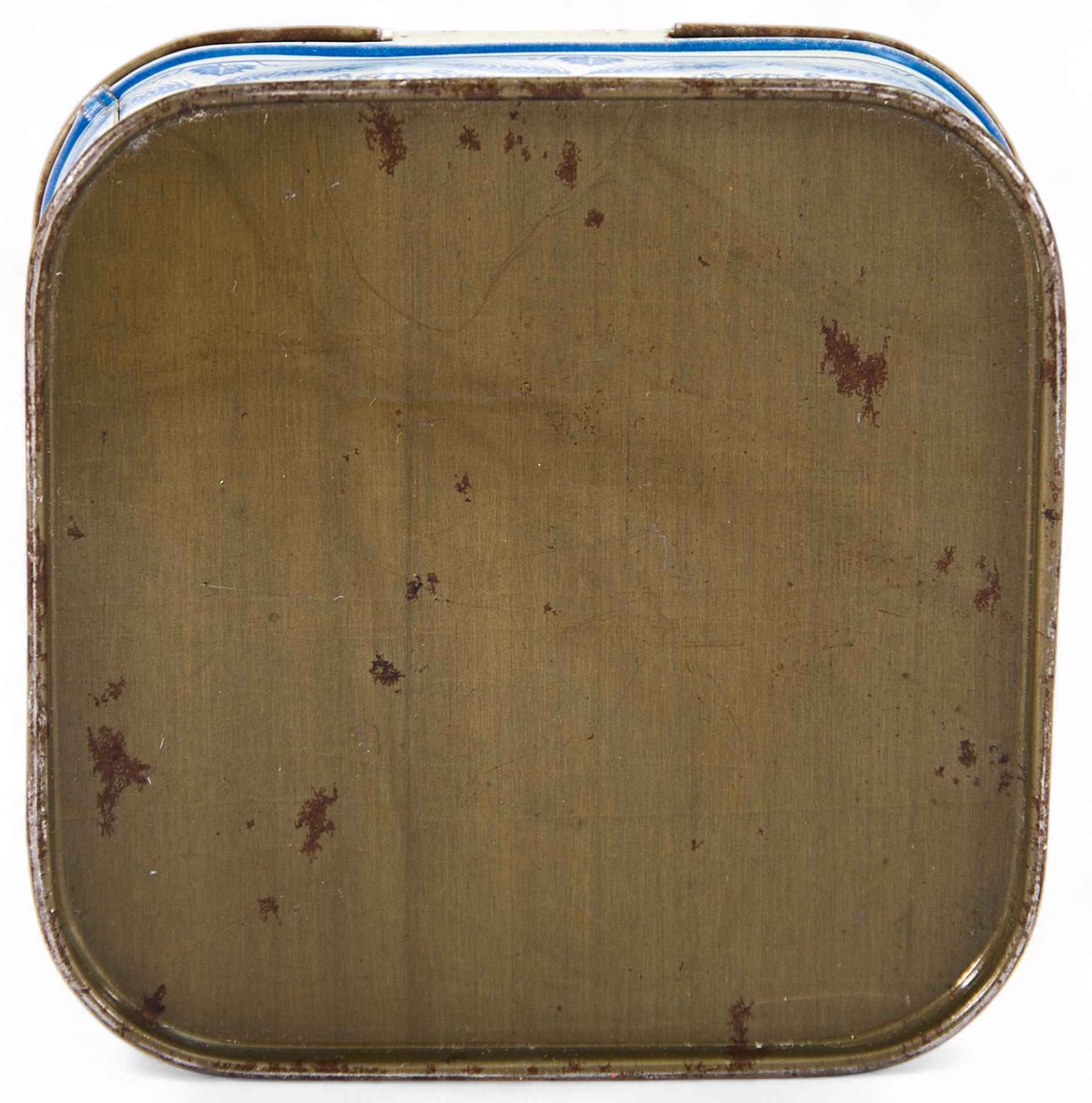 Квадратная, с закругленными углами, жестяная коробочка. На крышке коробочки изображён павильон Выставки