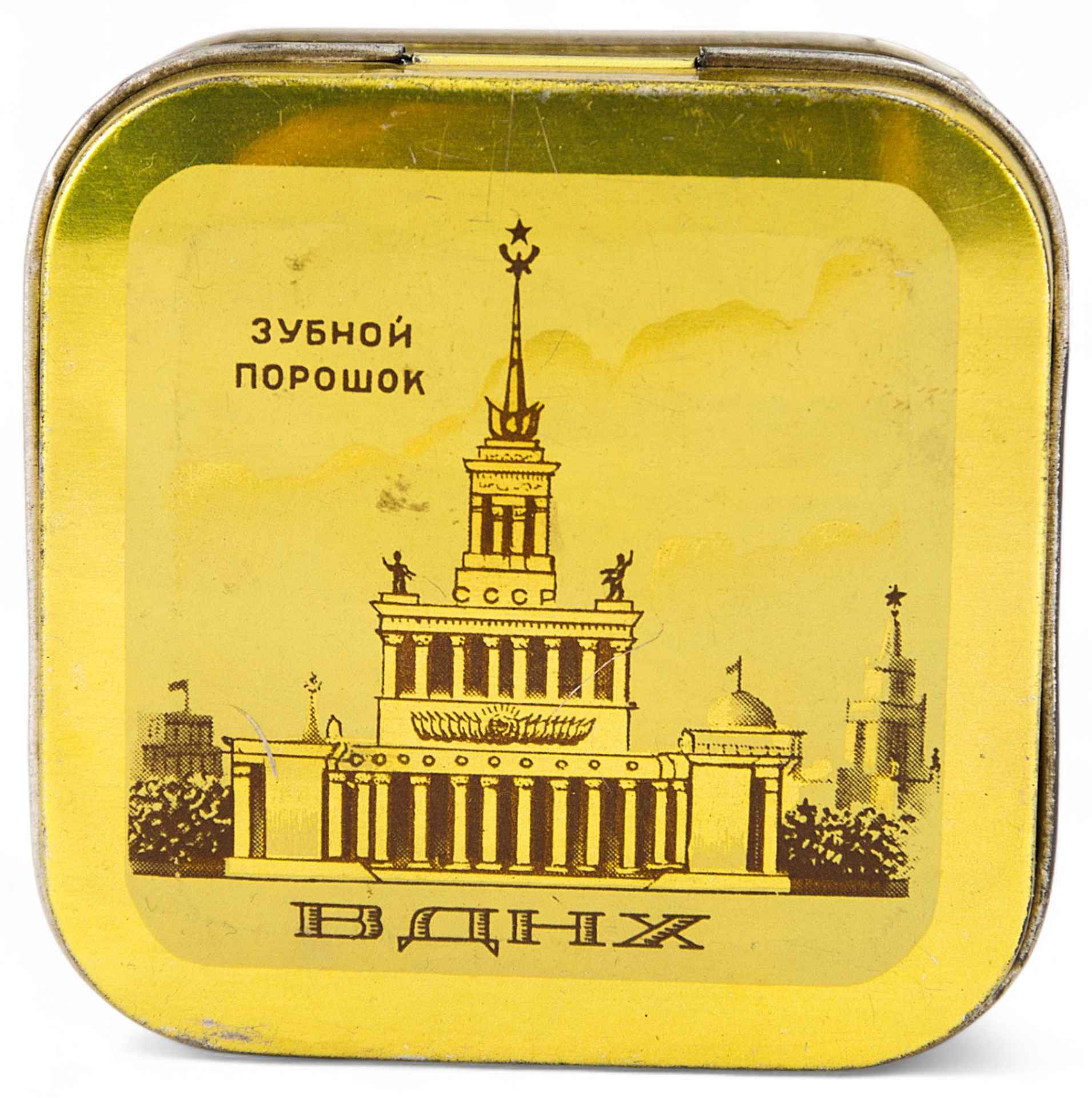Квадратная, с закругленными углами, жестяная коробочка. На крышке коробочки изображен павильон Выставки Достижений Народного Хозяйства на голубом фоне. Под ним надпись «ВДНХ», в левом верхнем углу надпись «Зубной порошок»