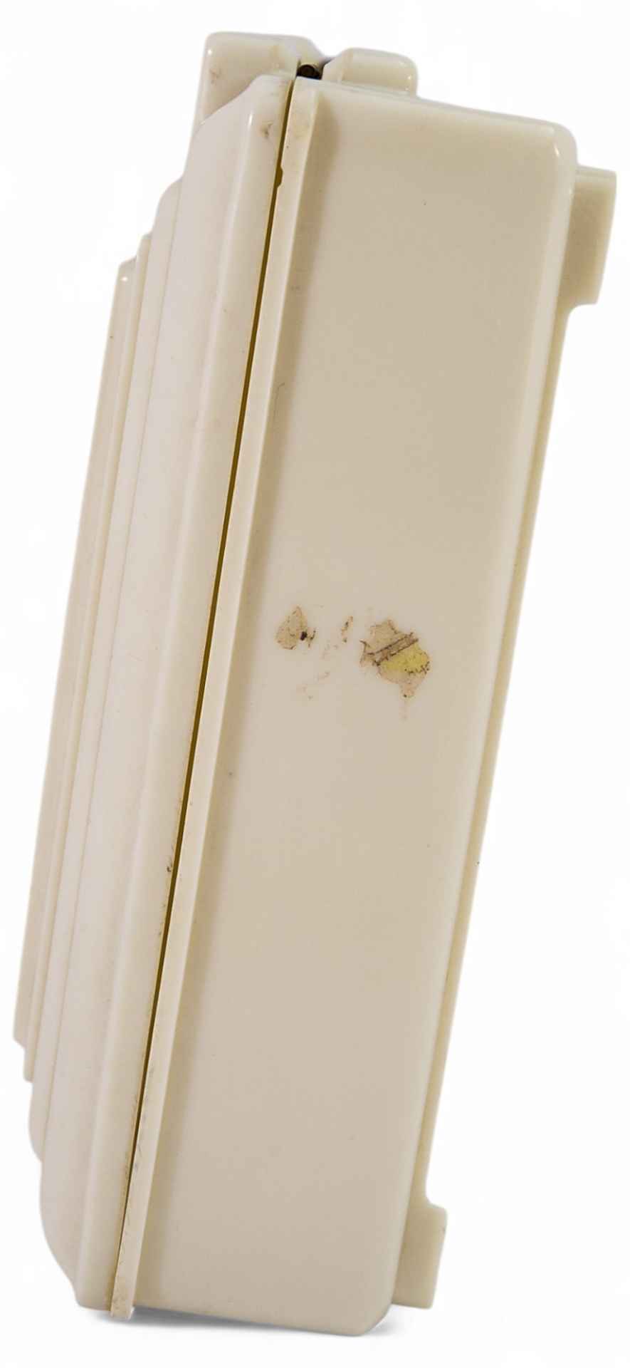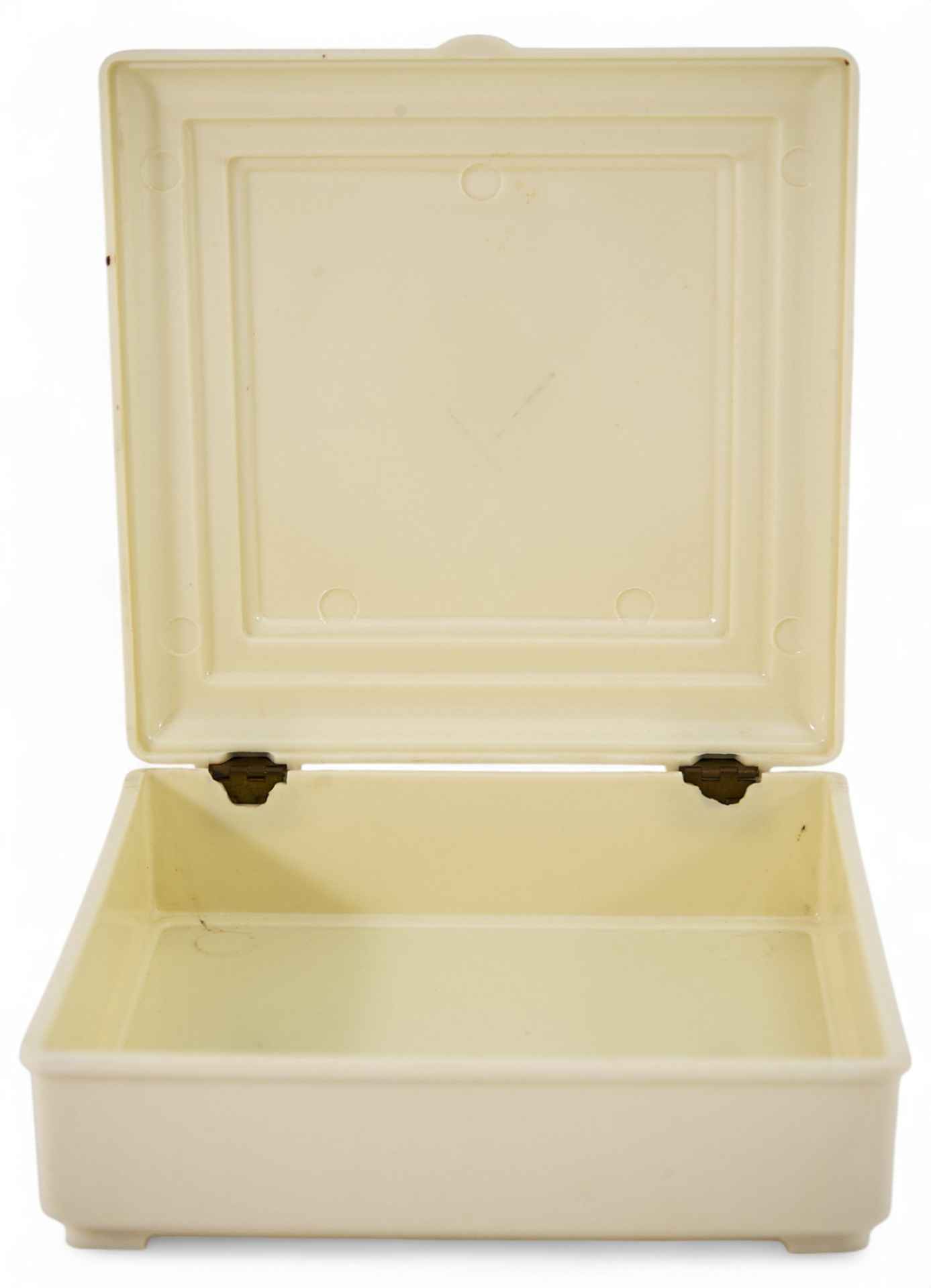 На шкатулке имеется клеймо: “Завод Карболит Орехово-Зуево.” В 1914 году трое ученых В.И.Лисев, К.И. Тарасов и Г.С. Петров создали первую отечественную пластмассу, назвав ее карболитом (название от применяемой в производстве “карболки”, так в просторечии именовали фенол). Полимер оказался прекрасным диэлектриком, не боялся действия воды, воздуха, многих кислот, легко поддавался механической обработке. В 1914 году в лаборатории получили первый пуд