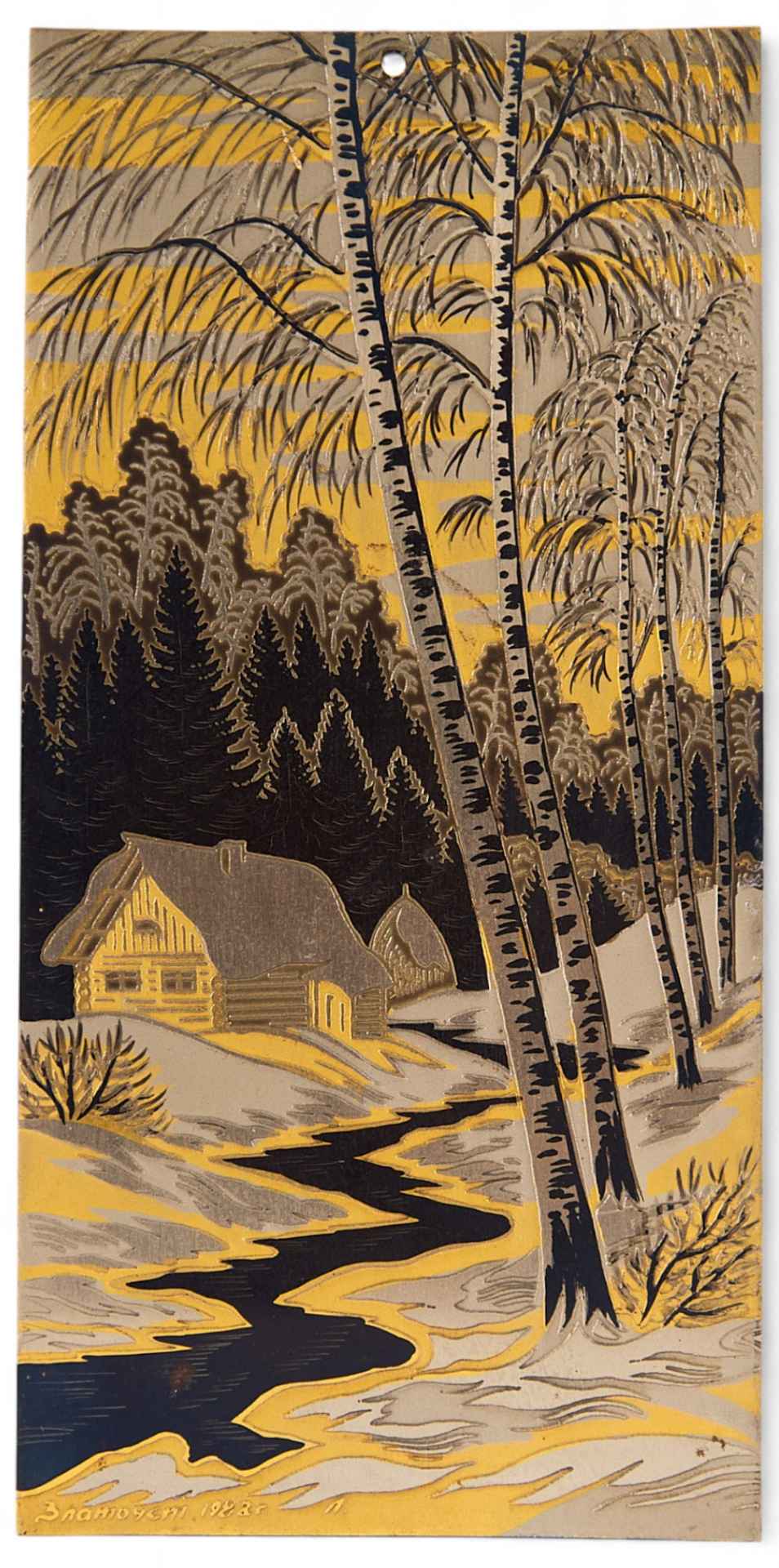 На стальной пластине изображен весенний пейзаж. На переднем плане узкая извилистая темная река. Справа от нее высокие березки с тонкими изогнутыми стволами и ажурными нитями склонившихся ветвей. Слева деревянный домик за которым, словно гора, возвышается темный еловый лес. На земле, а также на крыше домика лежат шапки еще нерастаявшего снега.