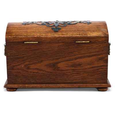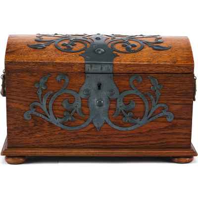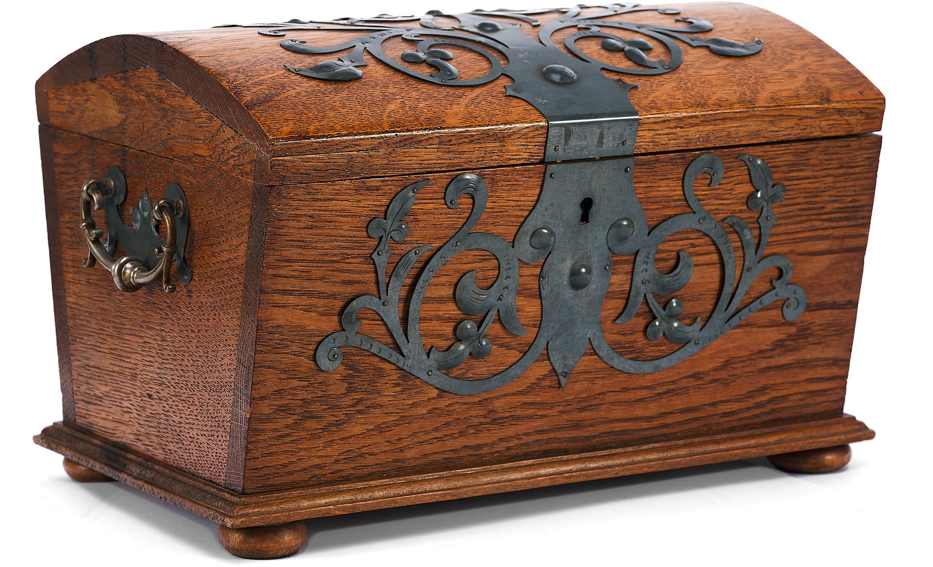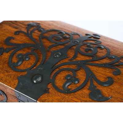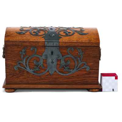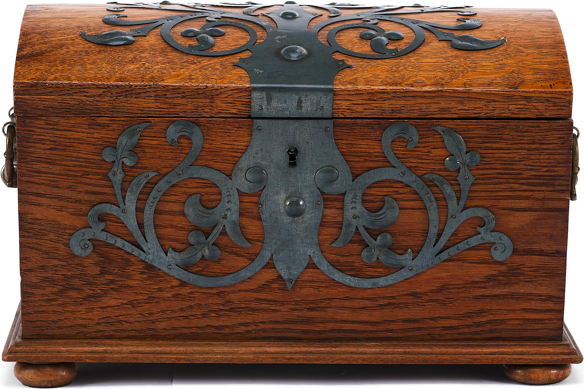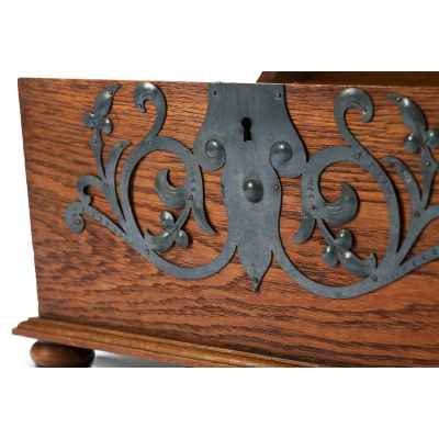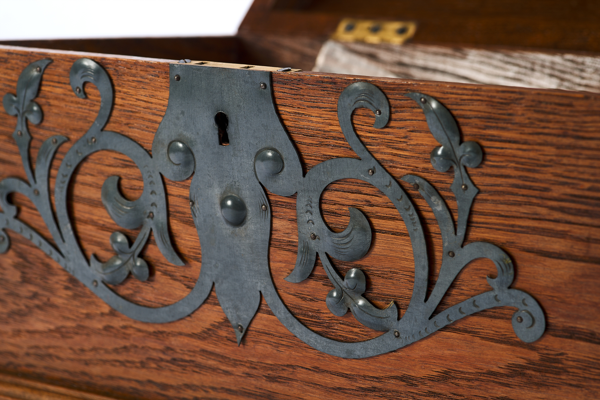 Шкатулка изготовлена вручную с использованием классических столярных приёмов и методов художественной отделки — вероятно, это морение, шлифовка и защитное масляное покрытие. Металлические элементы выполнены методом ковки и тиснения, что подчёркивает декоративность объекта. Орнамент в виде стилизованных растительных завитков отсылает к элементам неоготики и ар-нуво, придавая предмету историзирующее звучание. Исторически подобные сундуки служили для хранения ювелирных украшений, аксессуаров для волос, косметики и других ценных мелочей, и были важной частью меблировки женского будуара. Шкатулка с замком также играла роль показателя достатка и статуса владельца.