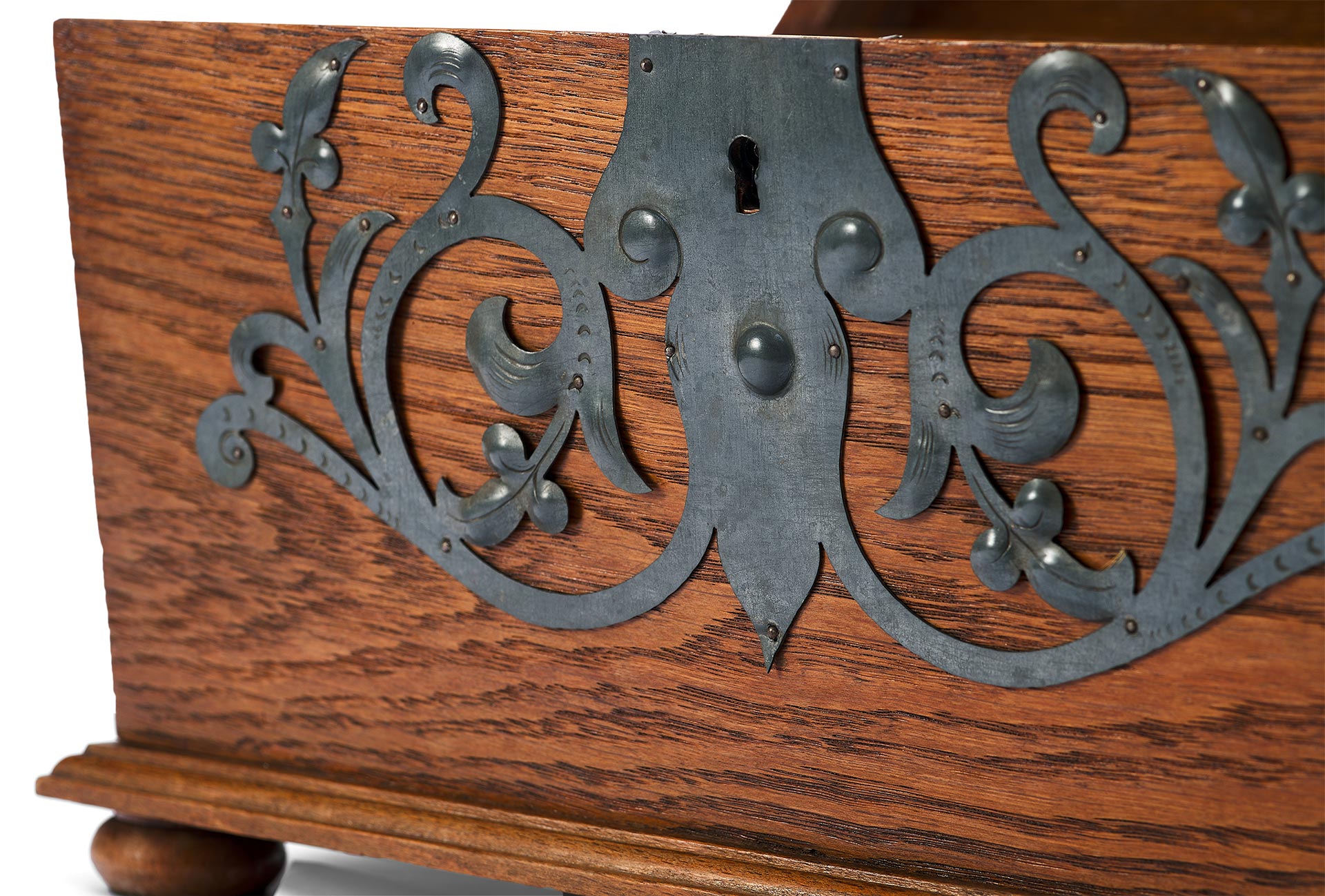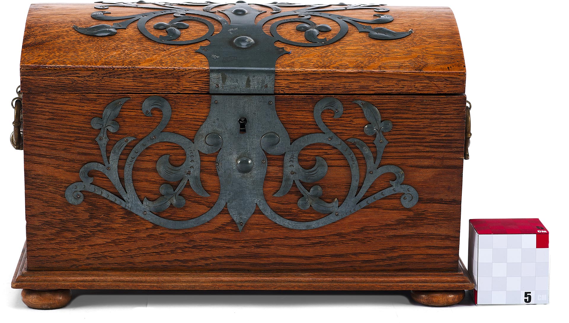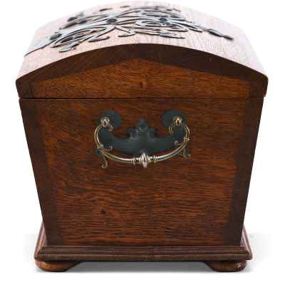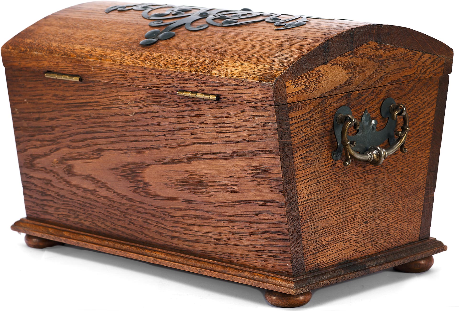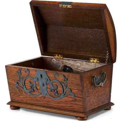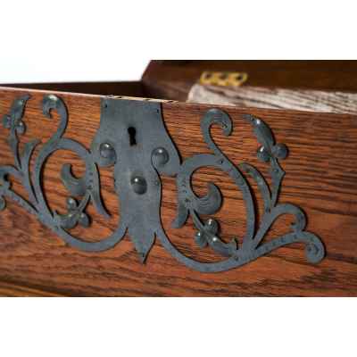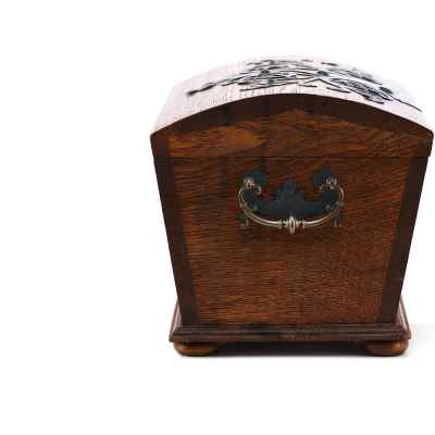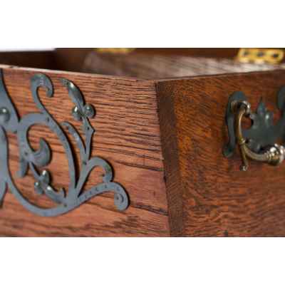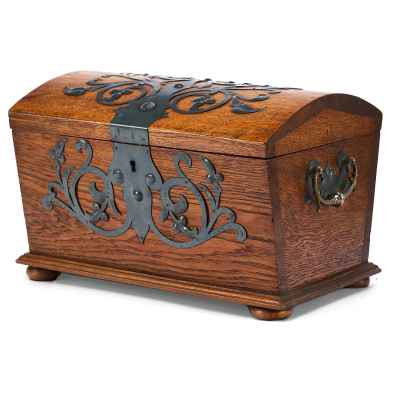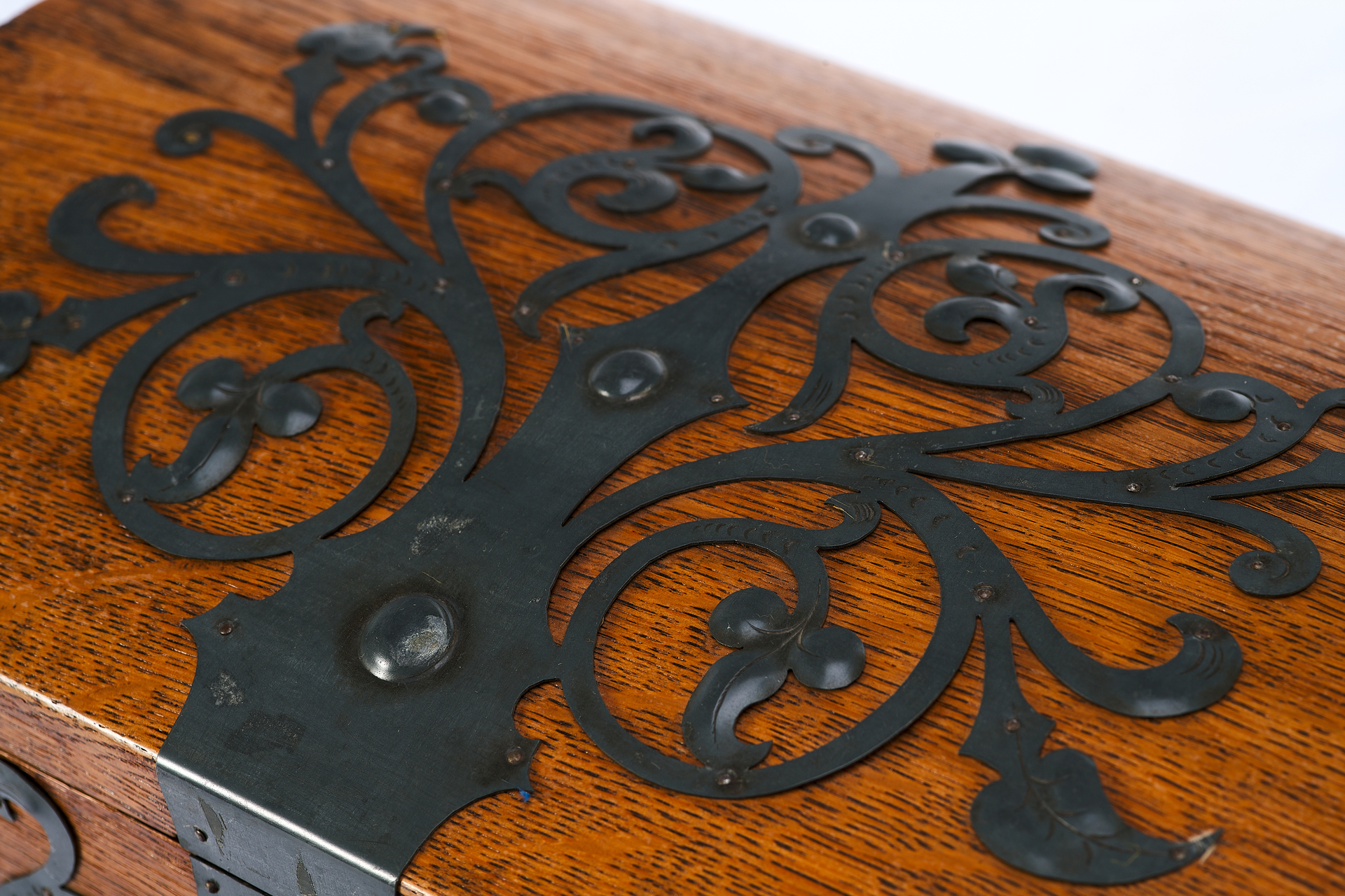 Шкатулка изготовлена вручную с использованием классических столярных приёмов и методов художественной отделки — вероятно, это морение, шлифовка и защитное масляное покрытие. Металлические элементы выполнены методом ковки и тиснения, что подчёркивает декоративность объекта. Орнамент в виде стилизованных растительных завитков отсылает к элементам неоготики и ар-нуво, придавая предмету историзирующее звучание. Исторически подобные сундуки служили для хранения ювелирных украшений, аксессуаров для волос, косметики и других ценных мелочей, и были важной частью меблировки женского будуара. Шкатулка с замком также играла роль показателя достатка и статуса владельца.