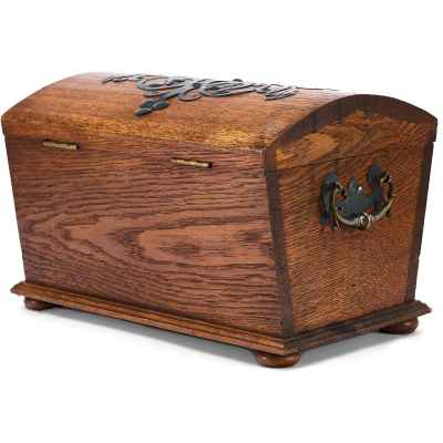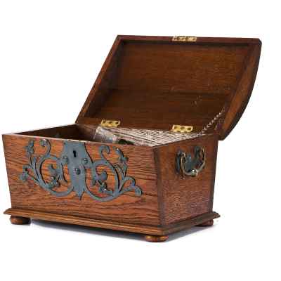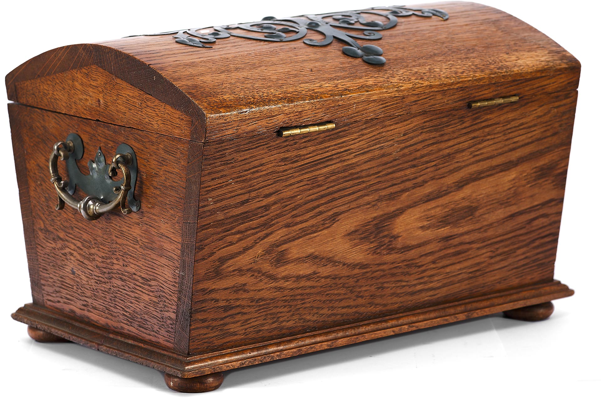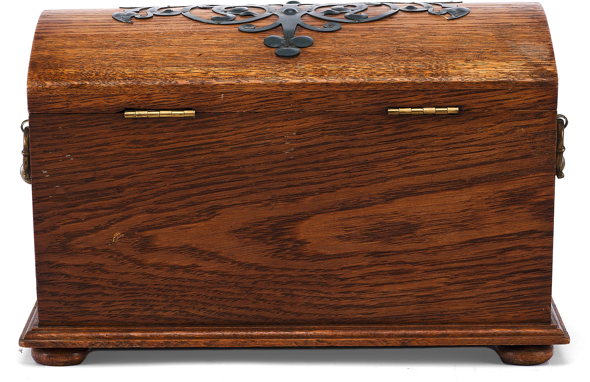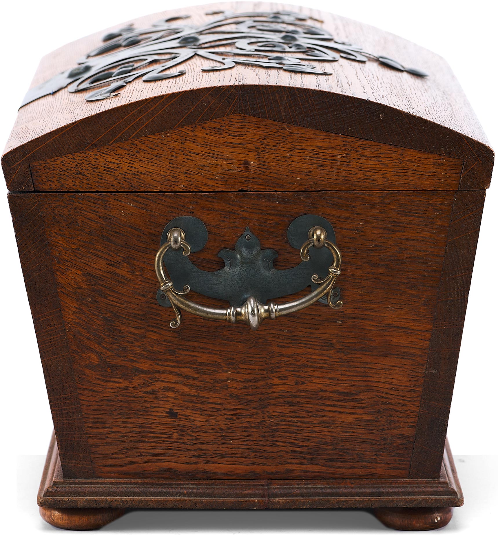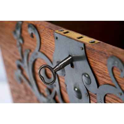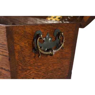 Шкатулка изготовлена вручную с использованием классических столярных приёмов и методов художественной отделки — вероятно, это морение, шлифовка и защитное масляное покрытие. Металлические элементы выполнены методом ковки и тиснения, что подчёркивает декоративность объекта. Орнамент в виде стилизованных растительных завитков отсылает к элементам неоготики и ар-нуво, придавая предмету историзирующее звучание. Исторически подобные сундуки служили для хранения ювелирных украшений, аксессуаров для волос, косметики и других ценных мелочей, и были важной частью меблировки женского будуара. Шкатулка с замком также играла роль показателя достатка и статуса владельца.