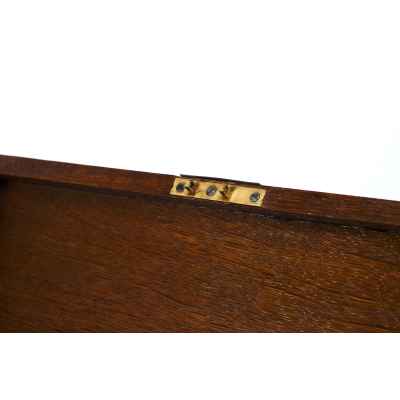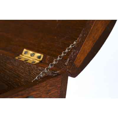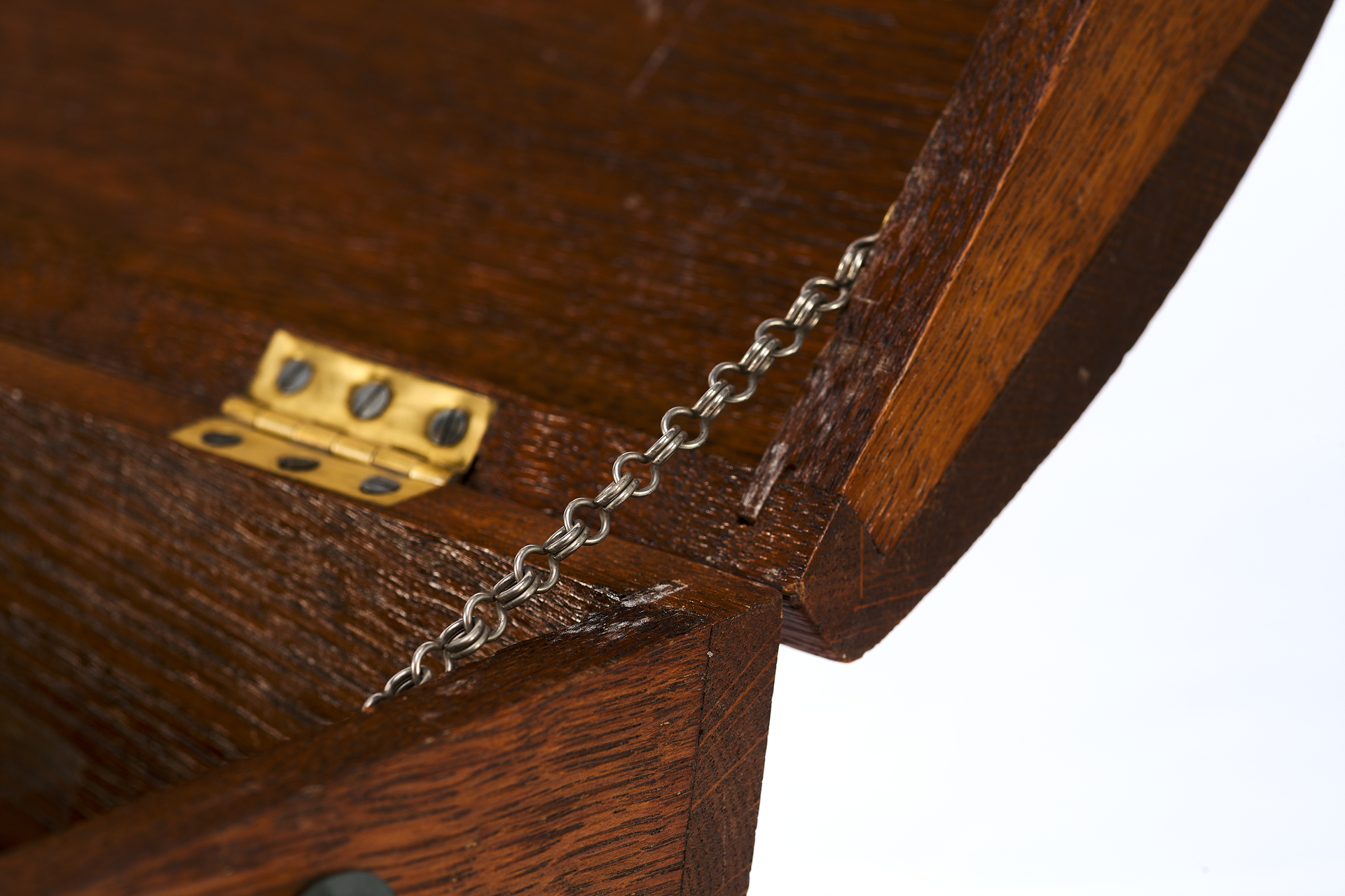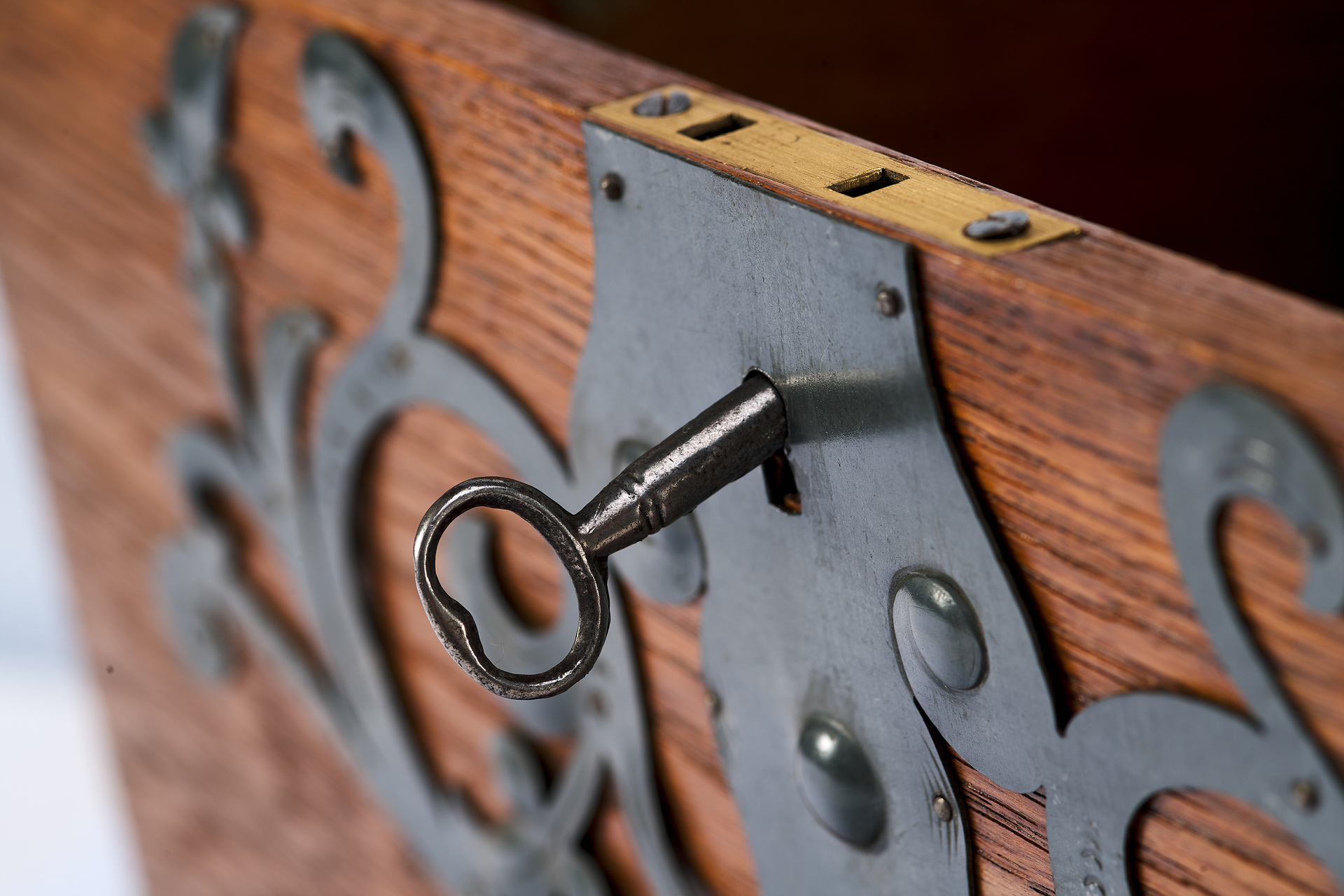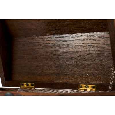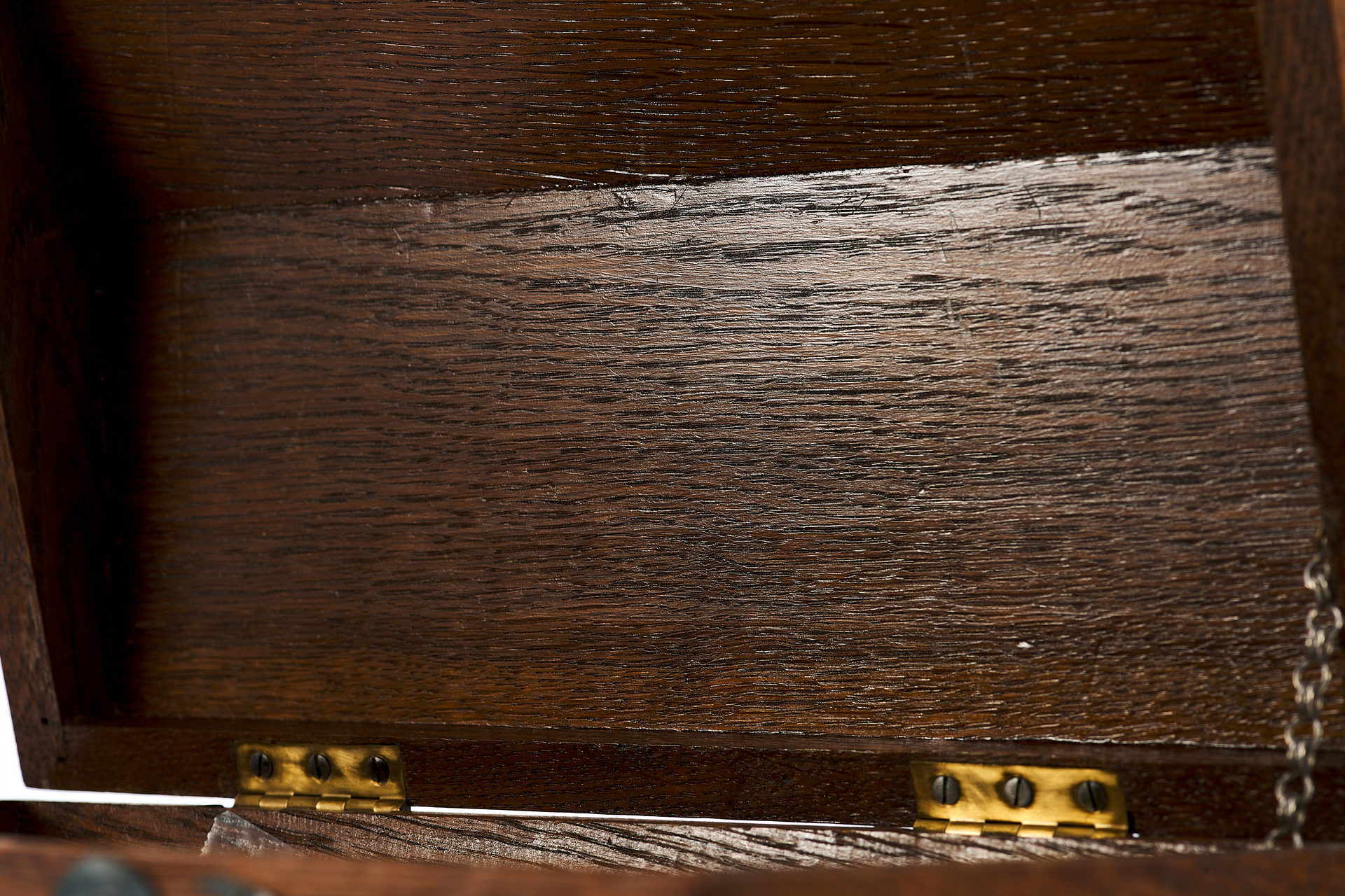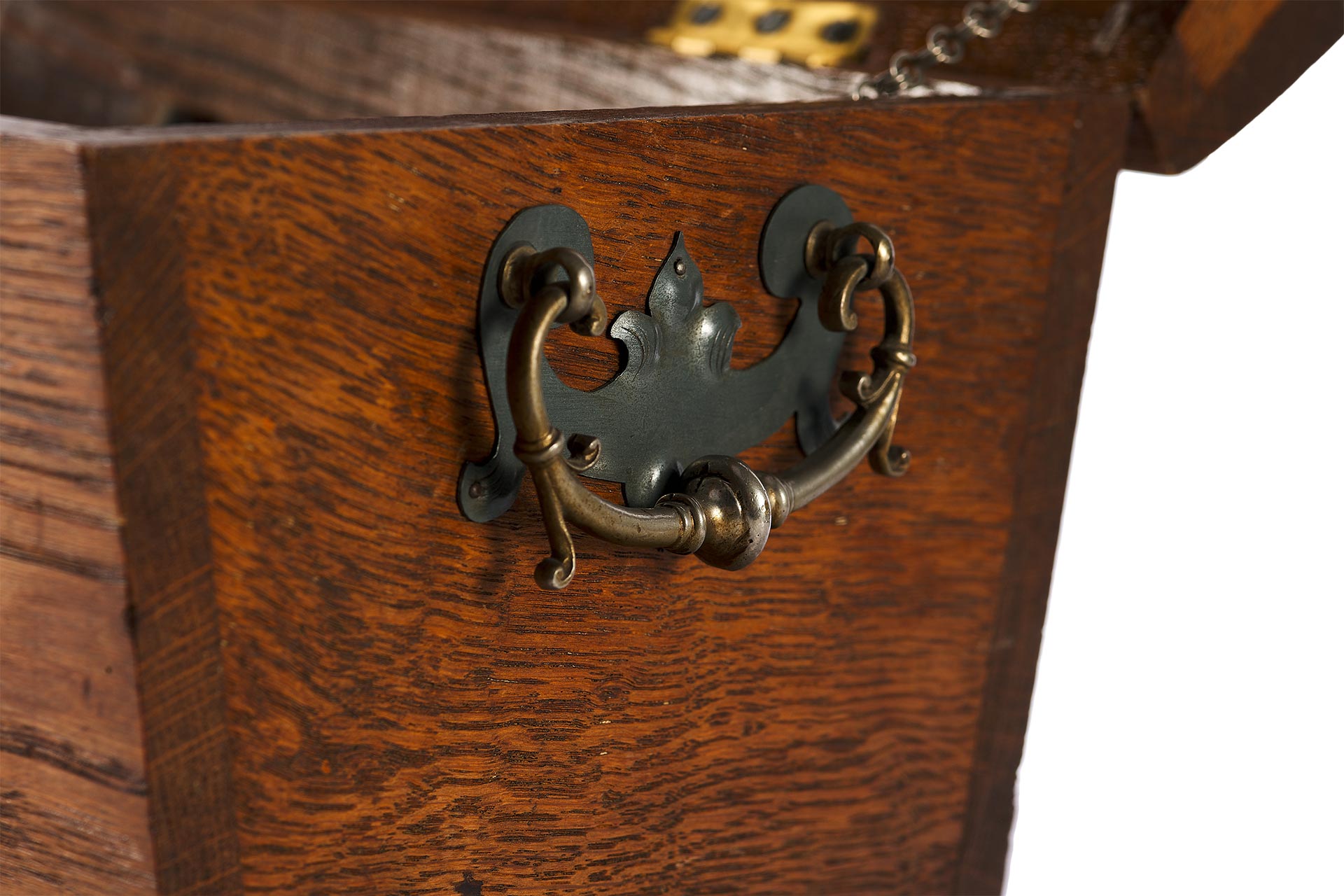 Шкатулка изготовлена вручную с использованием классических столярных приёмов и методов художественной отделки — вероятно, это морение, шлифовка и защитное масляное покрытие. Металлические элементы выполнены методом ковки и тиснения, что подчёркивает декоративность объекта. Орнамент в виде стилизованных растительных завитков отсылает к элементам неоготики и ар-нуво, придавая предмету историзирующее звучание. Исторически подобные сундуки служили для хранения ювелирных украшений, аксессуаров для волос, косметики и других ценных мелочей, и были важной частью меблировки женского будуара. Шкатулка с замком также играла роль показателя достатка и статуса владельца.