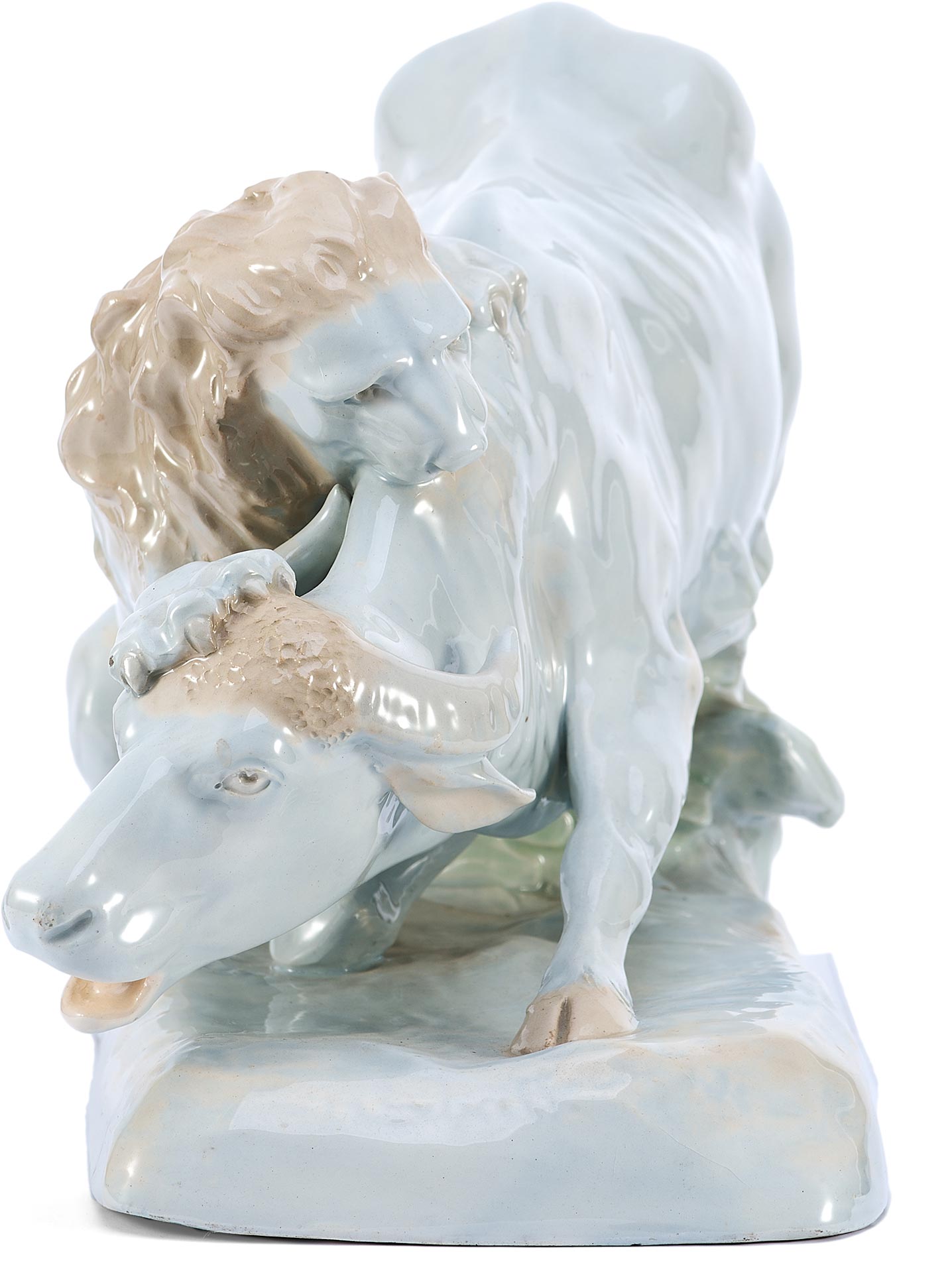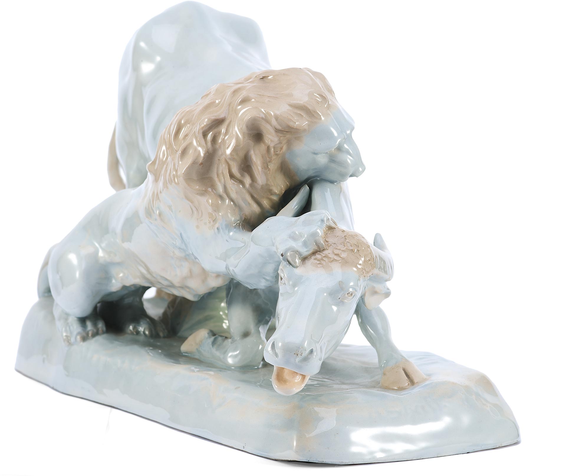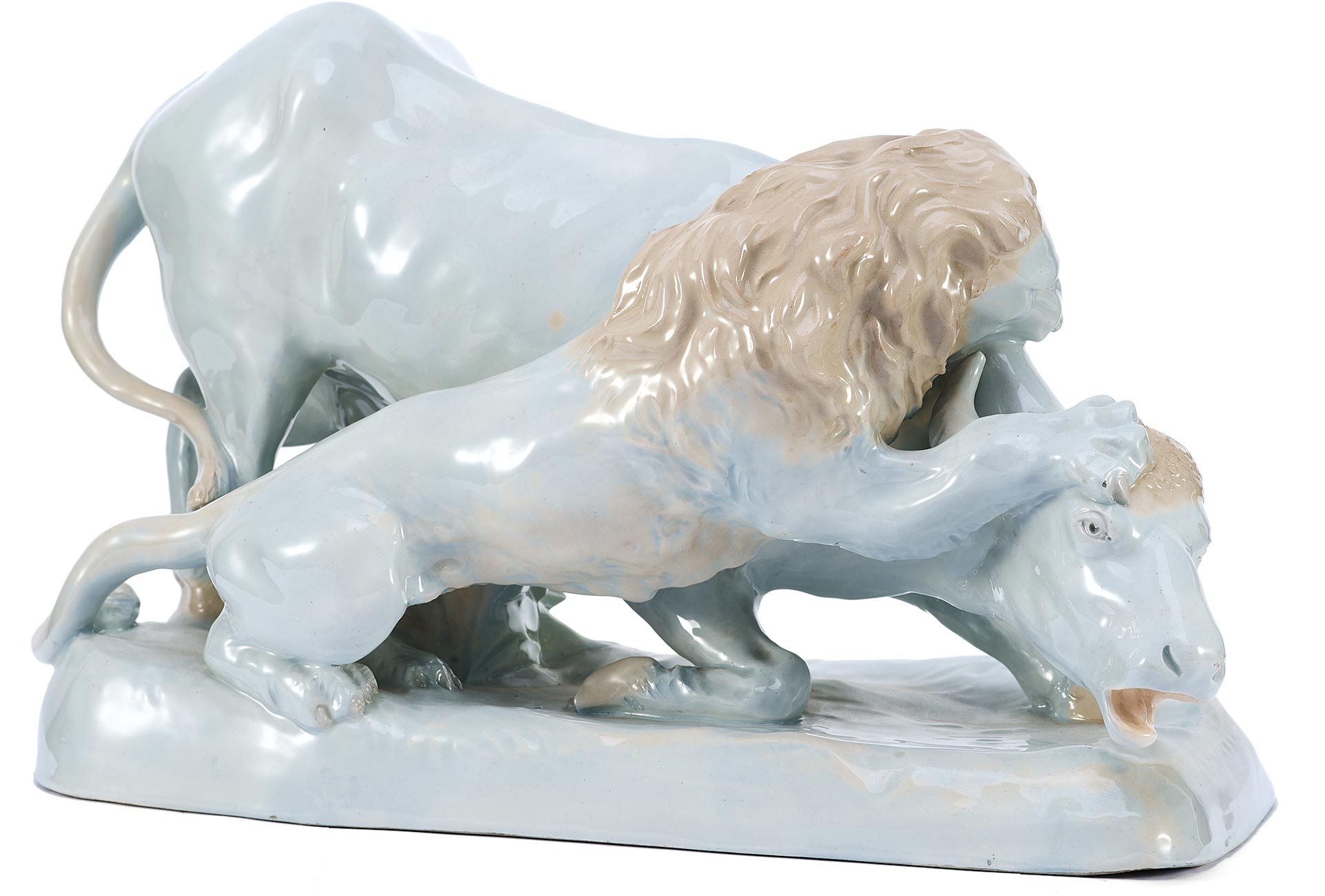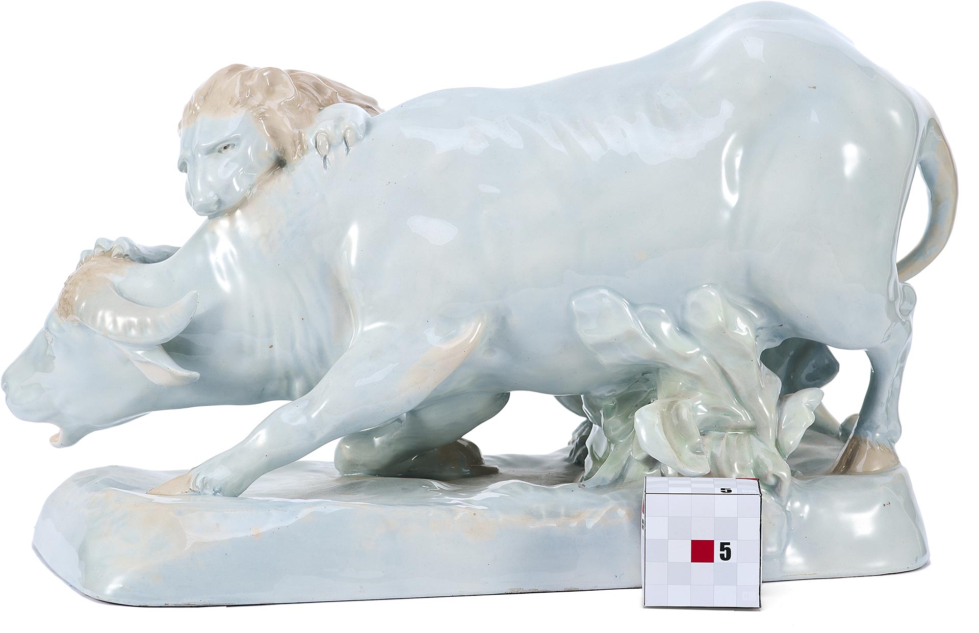 Предмет представляет собой скульптурную композицию «Схватка льва с буйволом», созданную в середине XX века в Европе, предположительно по модели Эриха Эме (Erich Oehme). Изделие выполнено из фаянса, что придаёт ему характерную глянцевую поверхность и позволяет достигнуть высокой детализации форм. Композиция изображает момент атаки: лев в прыжке вонзает когти в шею буйвола, создавая эффект напряжённого движения и борьбы за жизнь.