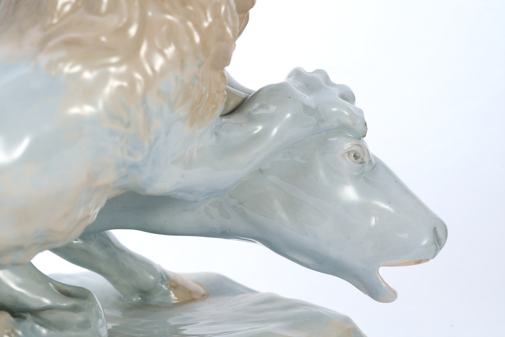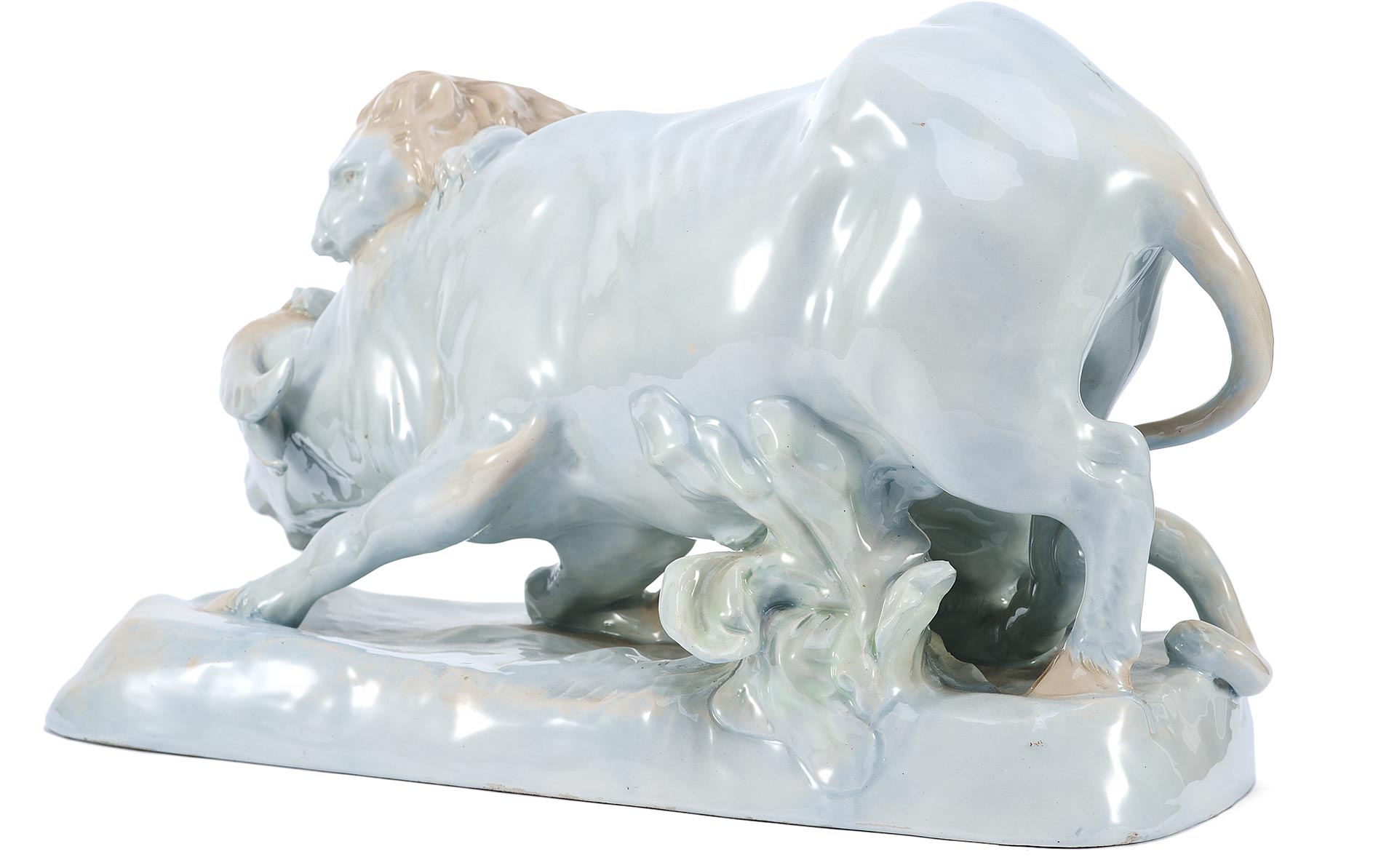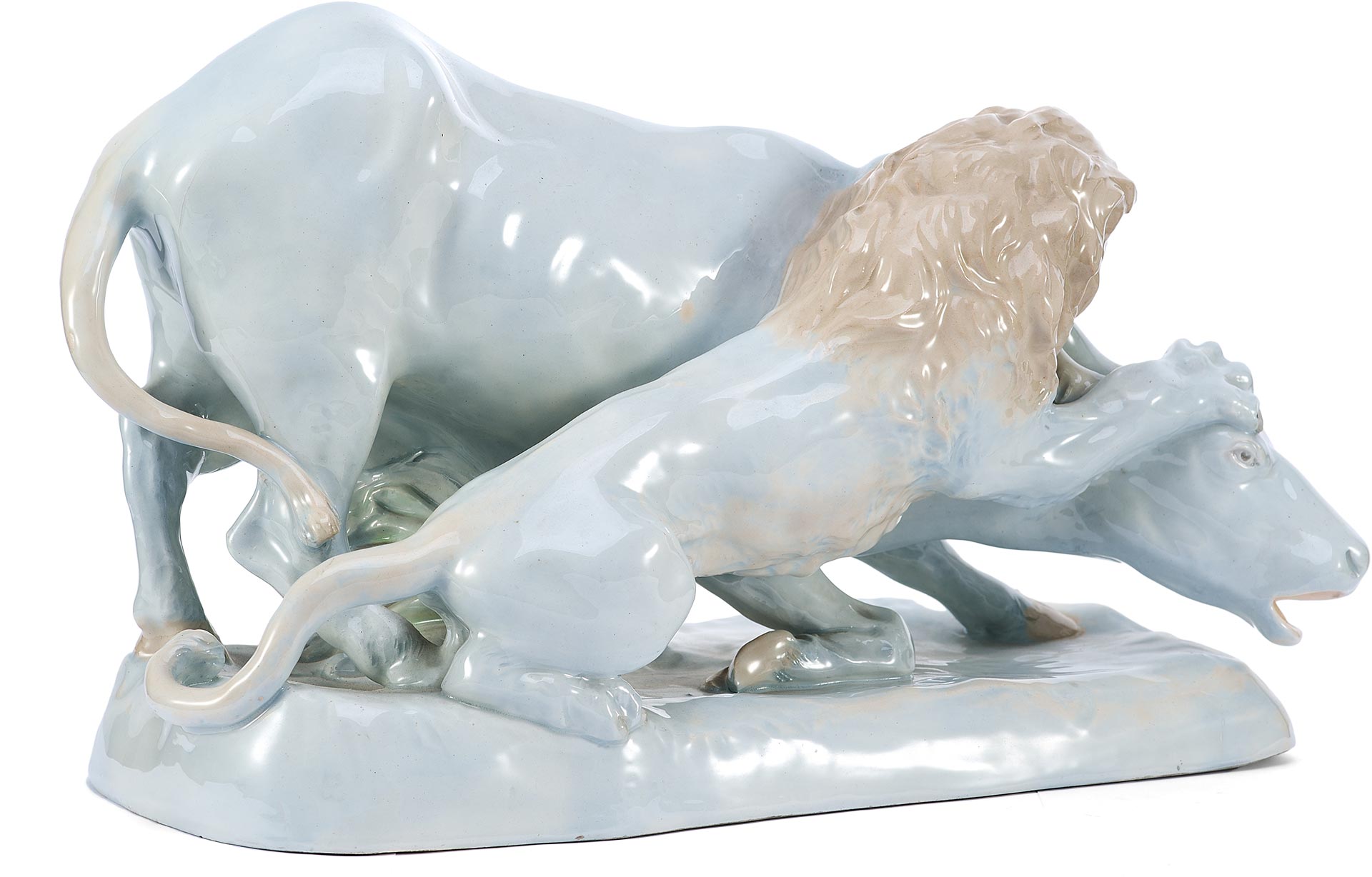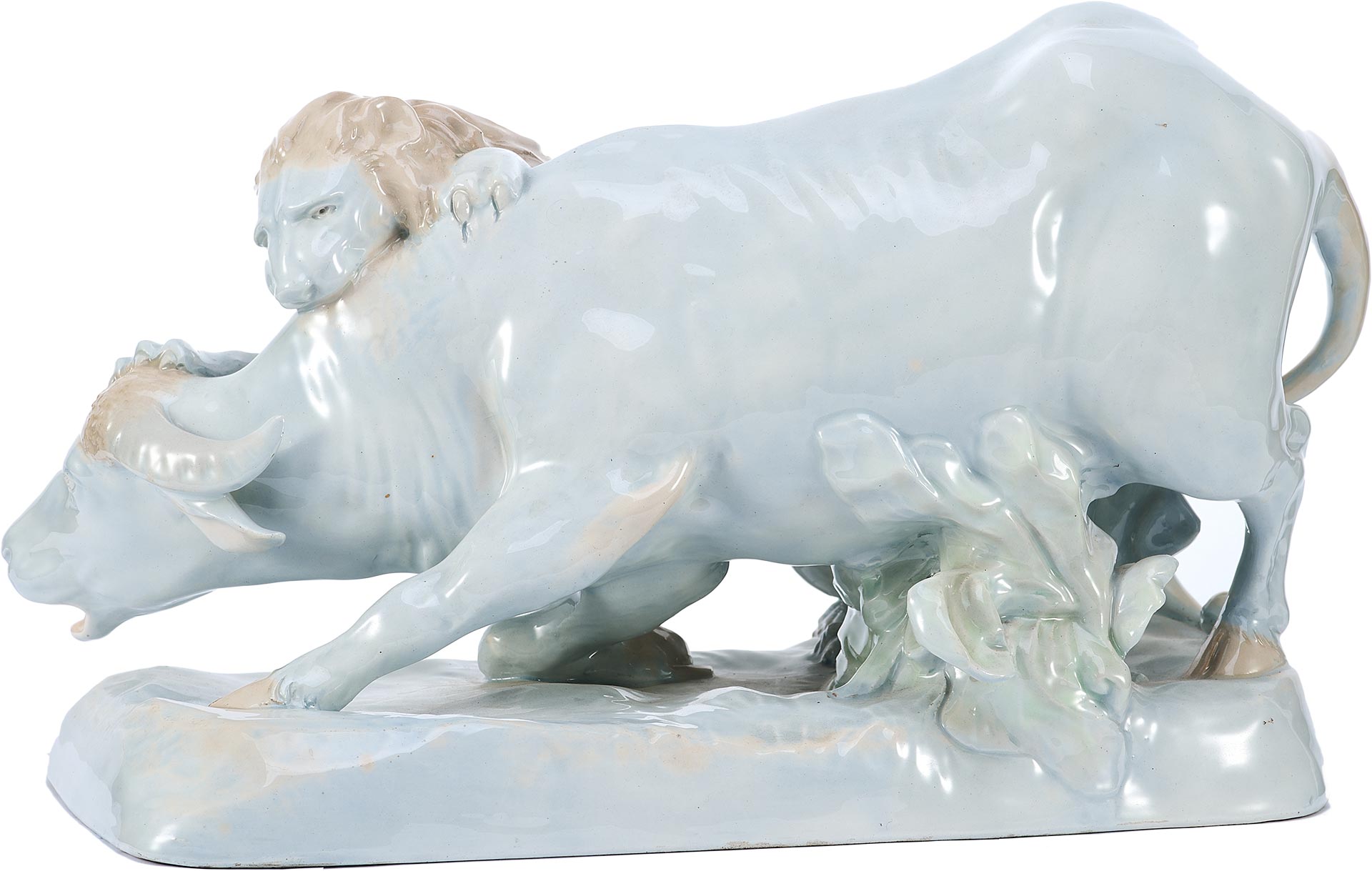 Предмет представляет собой скульптурную композицию «Схватка льва с буйволом», созданную в середине XX века в Европе, предположительно по модели Эриха Эме (Erich Oehme). Изделие выполнено из фаянса, что придаёт ему характерную глянцевую поверхность и позволяет достигнуть высокой детализации форм. Композиция изображает момент атаки: лев в прыжке вонзает когти в шею буйвола, создавая эффект напряжённого движения и борьбы за жизнь.