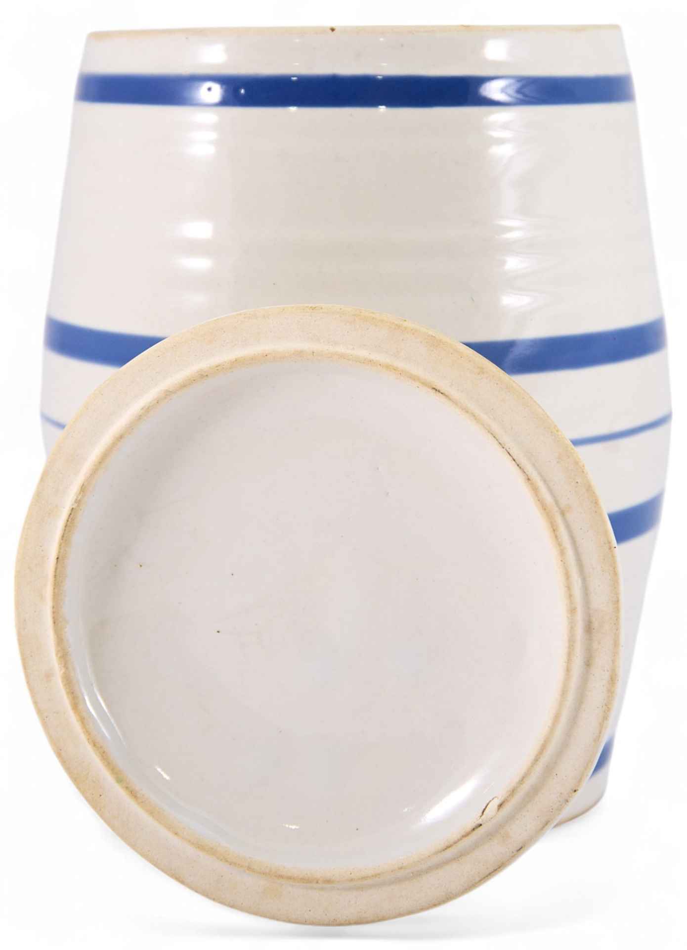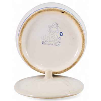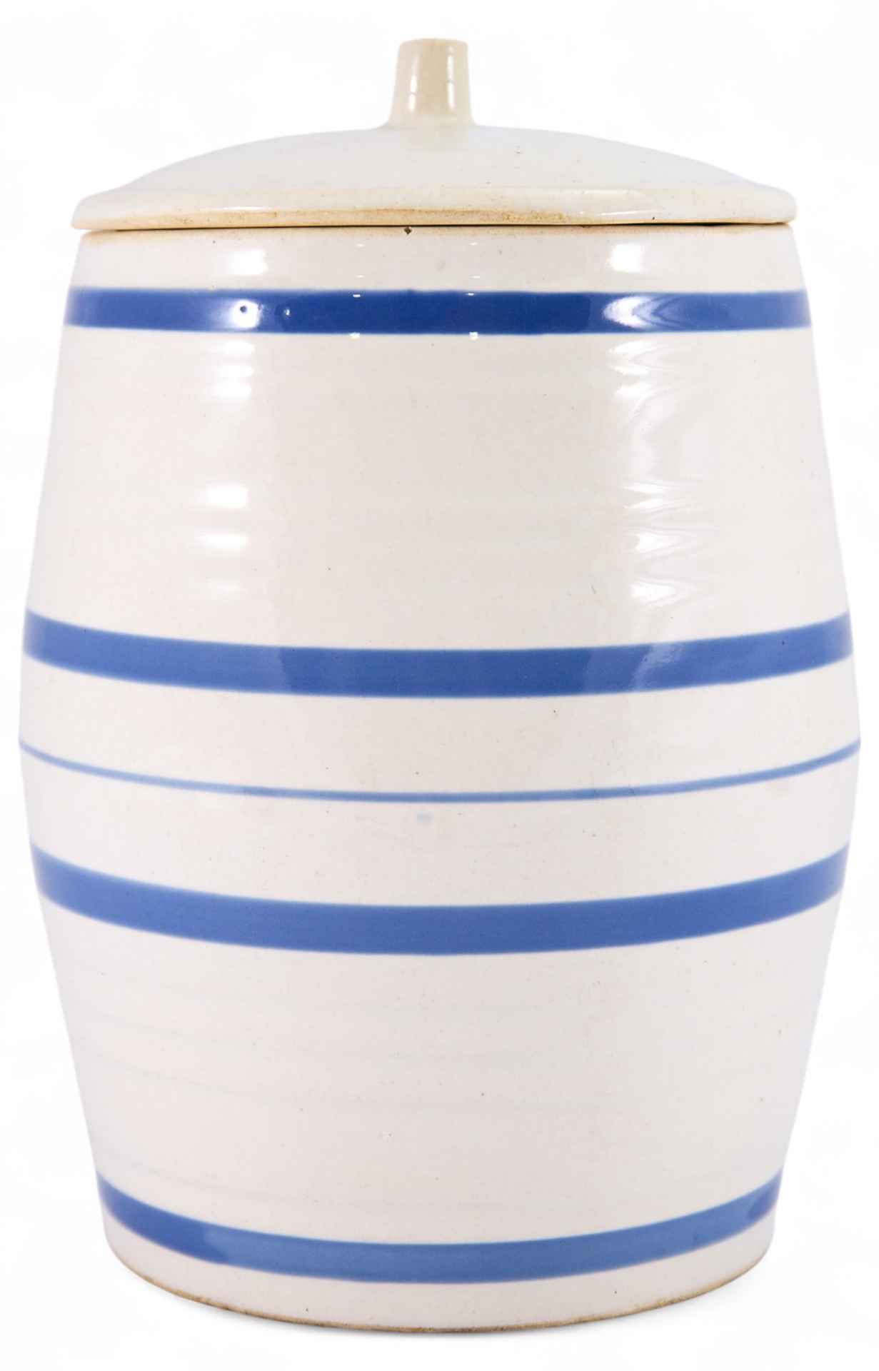Фаянсовый бочонок с крышкой. Бочонок предназначен для сыпучих тел (сахар, мука). Бочонки с таким оформлением были распространены на территории Украины. Возможно, предмет был изготовлен на дочернем предприятии или филиале