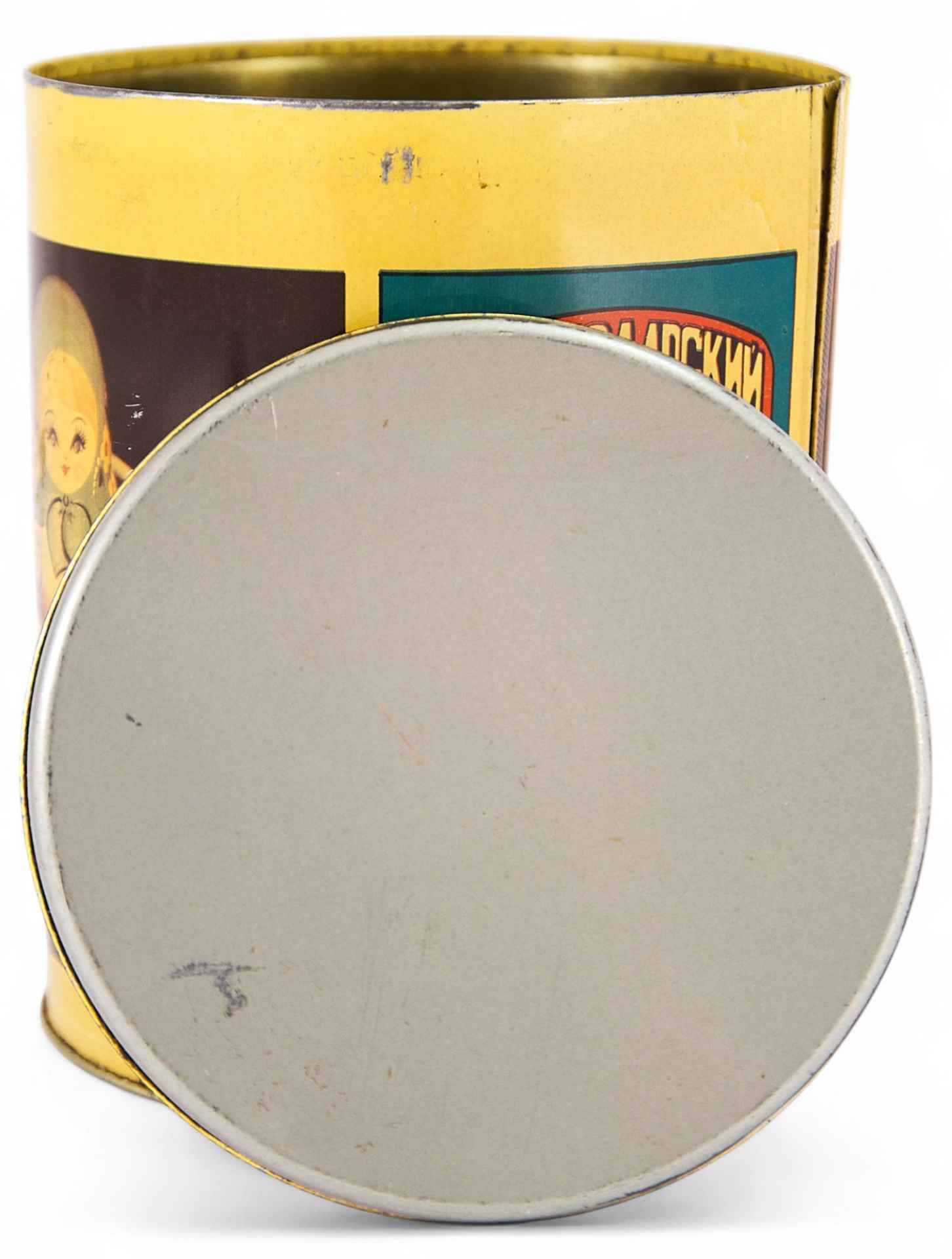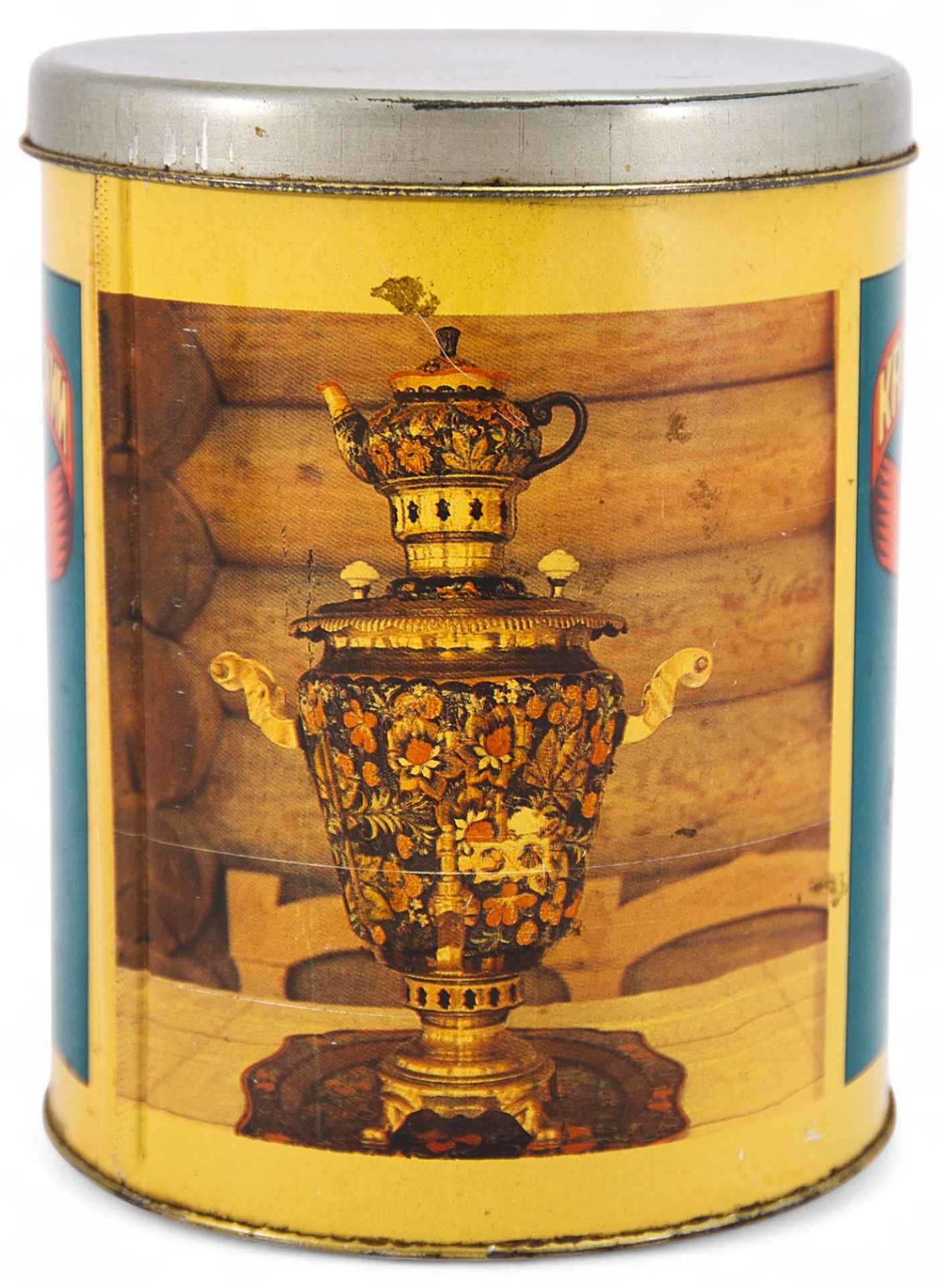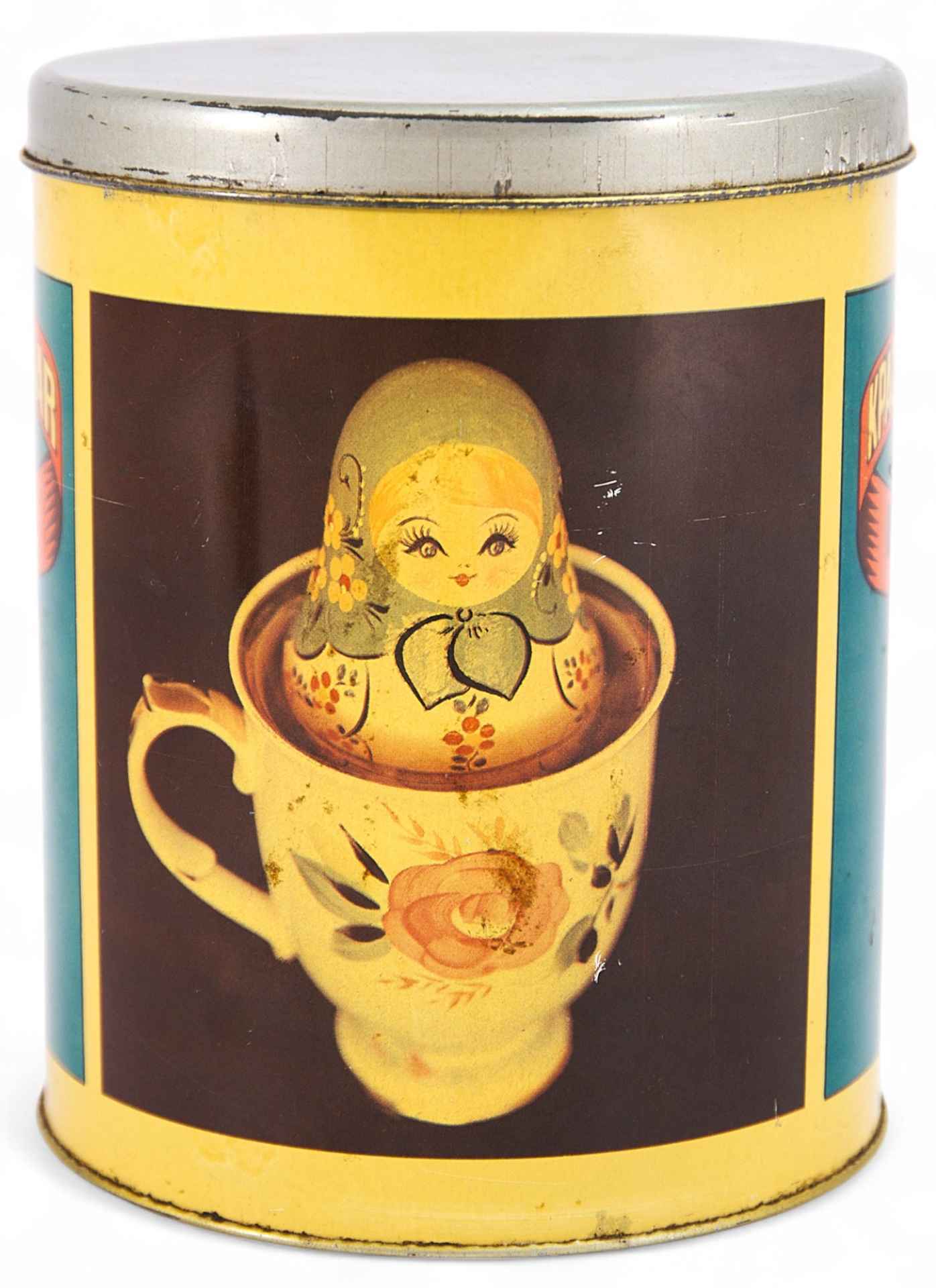 Тулово цилиндрической формы с крышкой. На гулове изображены чайная чашка с матрешкой и расписной самовар с чайником. Имеется надпись: “Краснодарский чай”. “АПК Кубань г.Сочи”. Выпускаемые на чайной фабрике металлические банки были долговечными и очень нарядными.