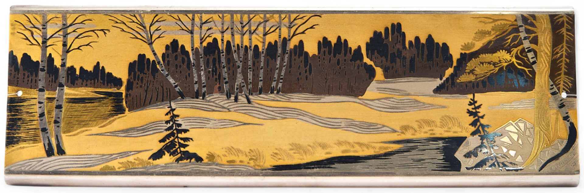 помощи этих полутонов картины, особенно пейзажи, наполнялись светом, приобретали рельеф. Появилась новая гравюра, непохожая на классическую, “златоустовская гравюра ручной работы”. На пластину наносился защитный слой, травление в кислоте, гравировка, серебрение, золочение, синение и чернение. Травление с рисунком могло применятся несколько раз.