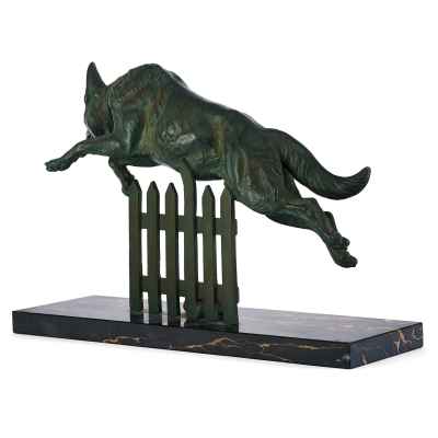 Скульптура «Овчарка, перепрыгивающая через забор» представляет собой характерный образец интерьерной пластики стиля ар-деко, созданный в Европе в 1920–1930-х годах. Композиция выполнена из шпиатра — сплава на основе цинка, широко использовавшегося в художественной промышленности того времени как имитация бронзы, и установлена на массивное мраморное основание.