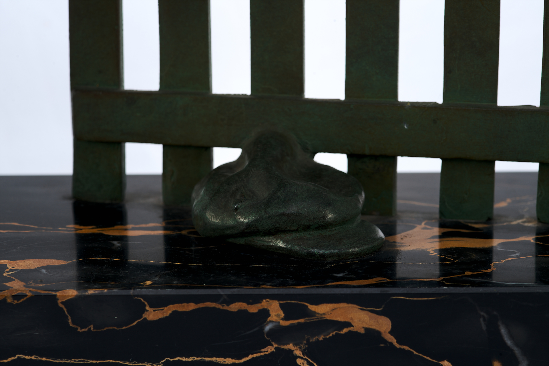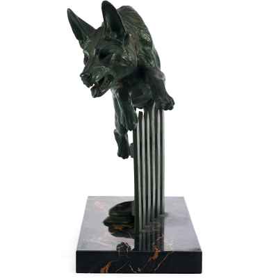 Фигура овчарки изображена в динамике: собака преодолевает деревянный забор, что создаёт ощущение стремительного движения. Проработка анатомических деталей, изгиб корпуса, вытянутые лапы и обострённое выражение головы свидетельствуют о высоком уровне мастерства автора. Композиция передаёт не только физическое усилие, но и внутреннюю собранность животного, что характерно для ар-деко, стремящегося к гармонии между стилизацией и выразительностью формы.