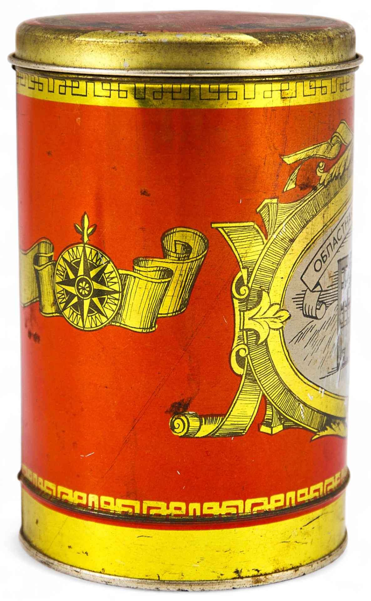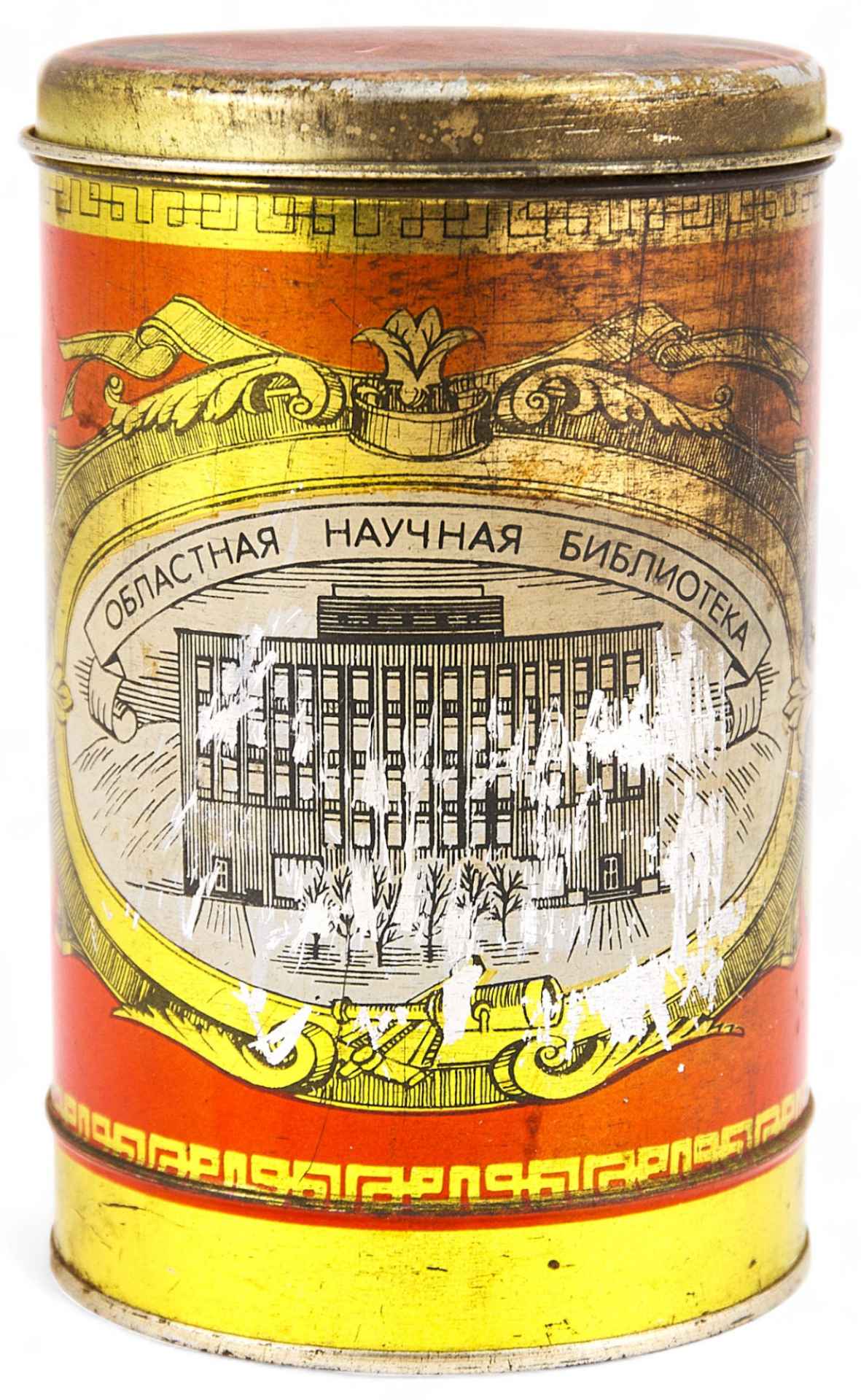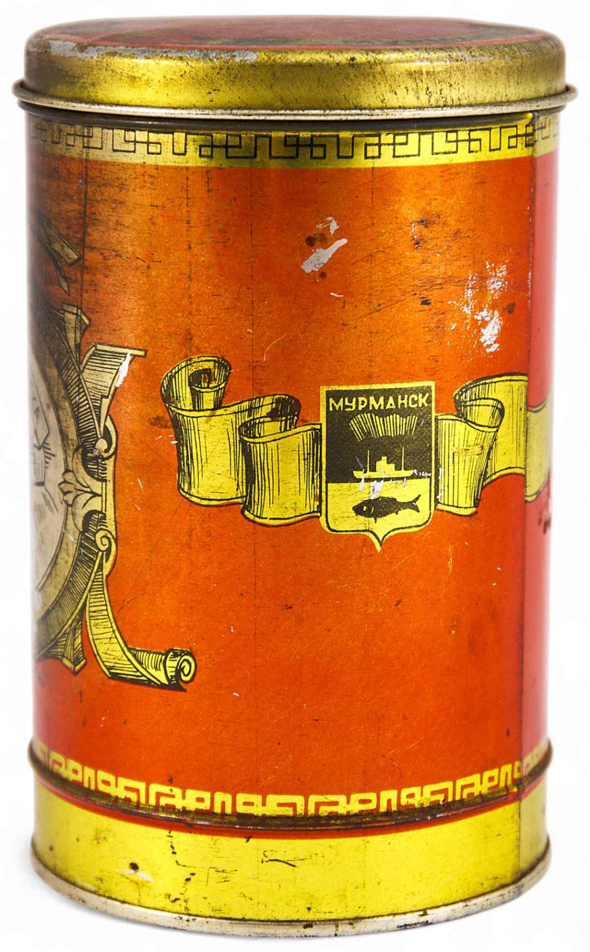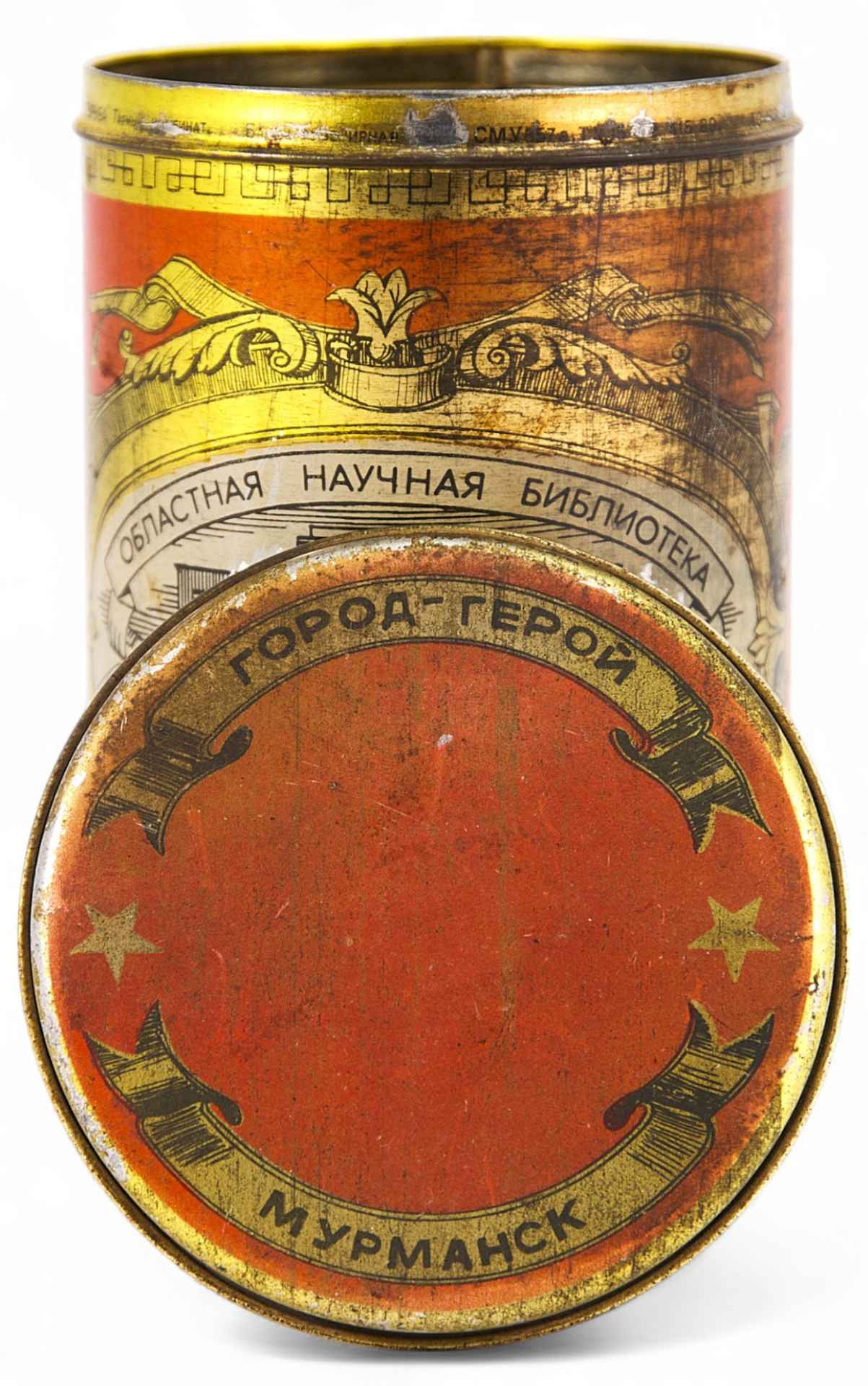Сувенирная жестяная банка Тулово цилиндрической формы с крышкой, предназначена для сыпучих продуктов. Имеется надпись на крышке: Город-герой Мурманск. На тулове изображение Мурманской областной научной библиотеки. На ободке под крышкой надпись: МРХ СССР “Севрыба” Тарный комбинат Банка сувенирная. APT СМУ 857а ТУ 15-02415- 89ТО107-02-86. Цена 1-15. В I960 году под Мурманском в поселке Верхнее Нагорное введена в эксплуатацию жестяно-баночная фабрика №1 мощностью 125 миллионов условных банок в год. В 1975 году была введена в эксплуатацию новая жестяно-баночная фабрика №2 в Южном районе рыбного порта с расчетной мощностью 100 млн в год.