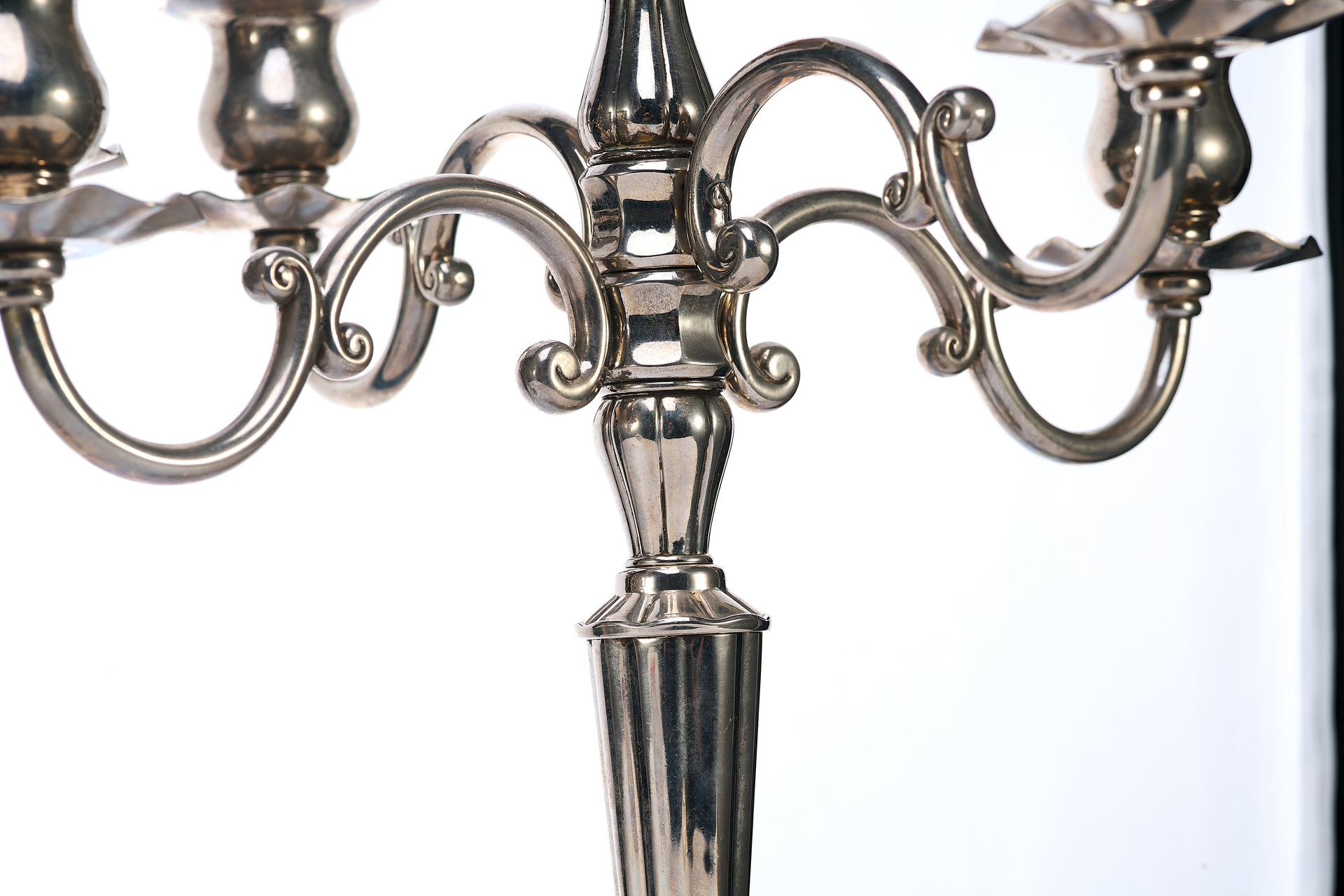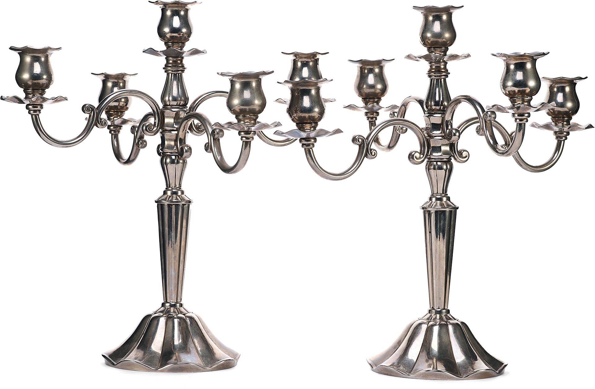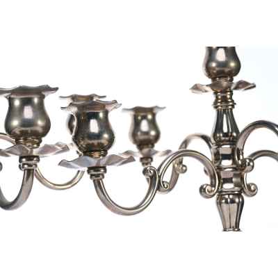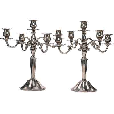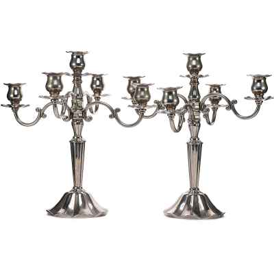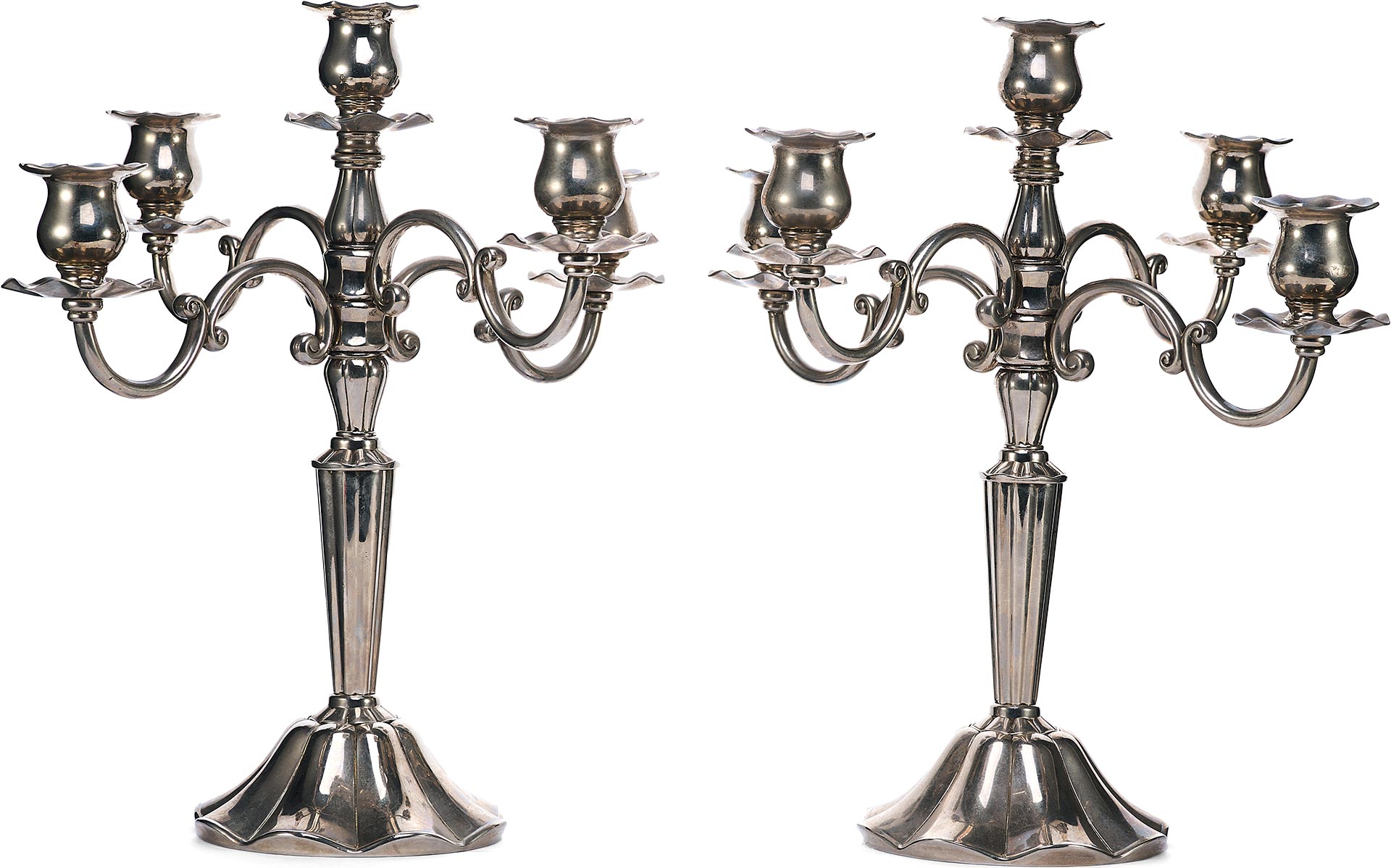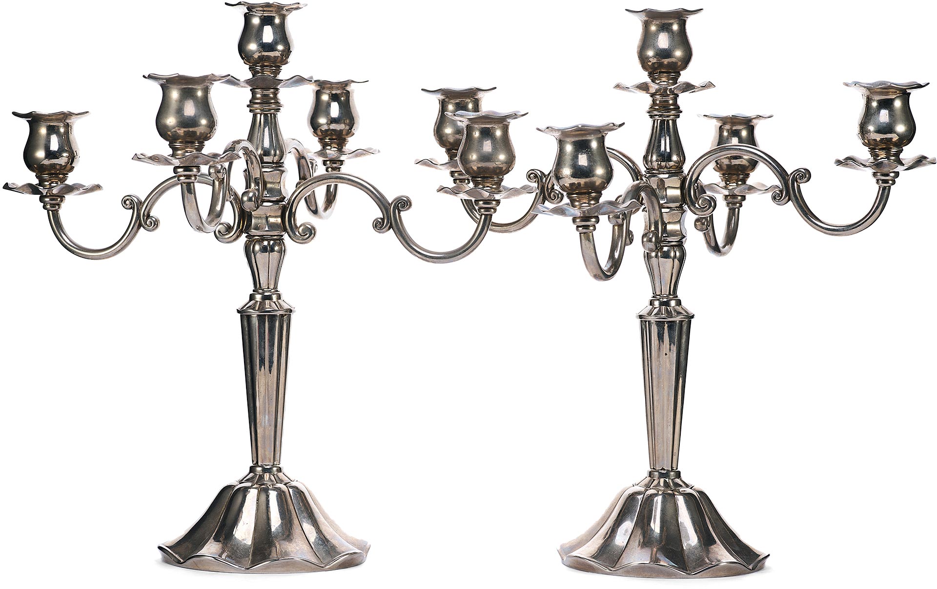 Парные канделябры, представленные на изображении, относятся к изысканным интерьерным осветительным приборам начала XX века, выполненным в классическом стиле, характерном для декоративно-прикладного искусства Европы. Эти изделия представляют собой настольные светильники с пятью рожками для свечей, расходящимися от центральной стойки, что делает композицию уравновешенной и декоративно выразительной.