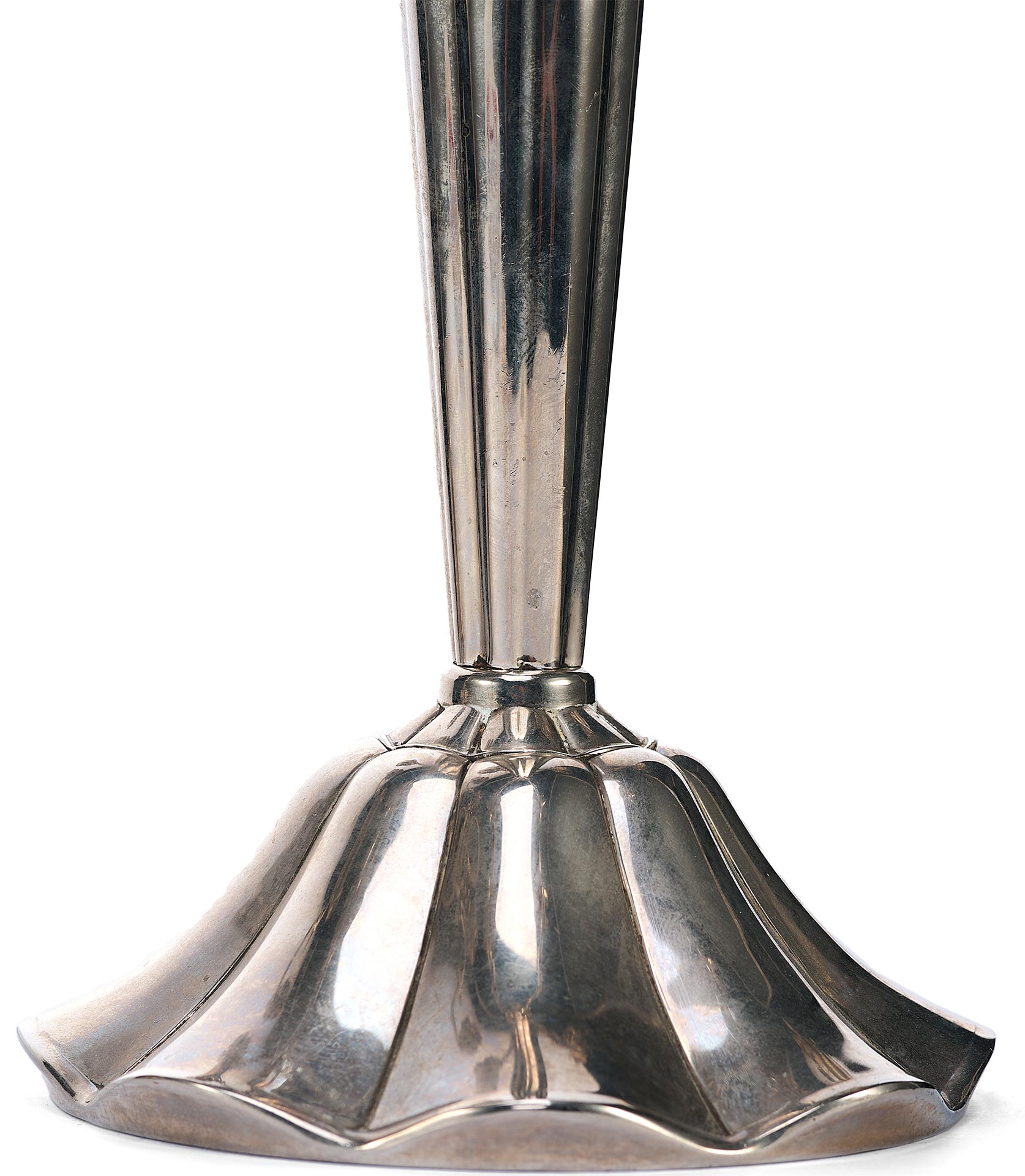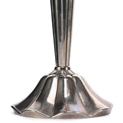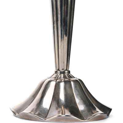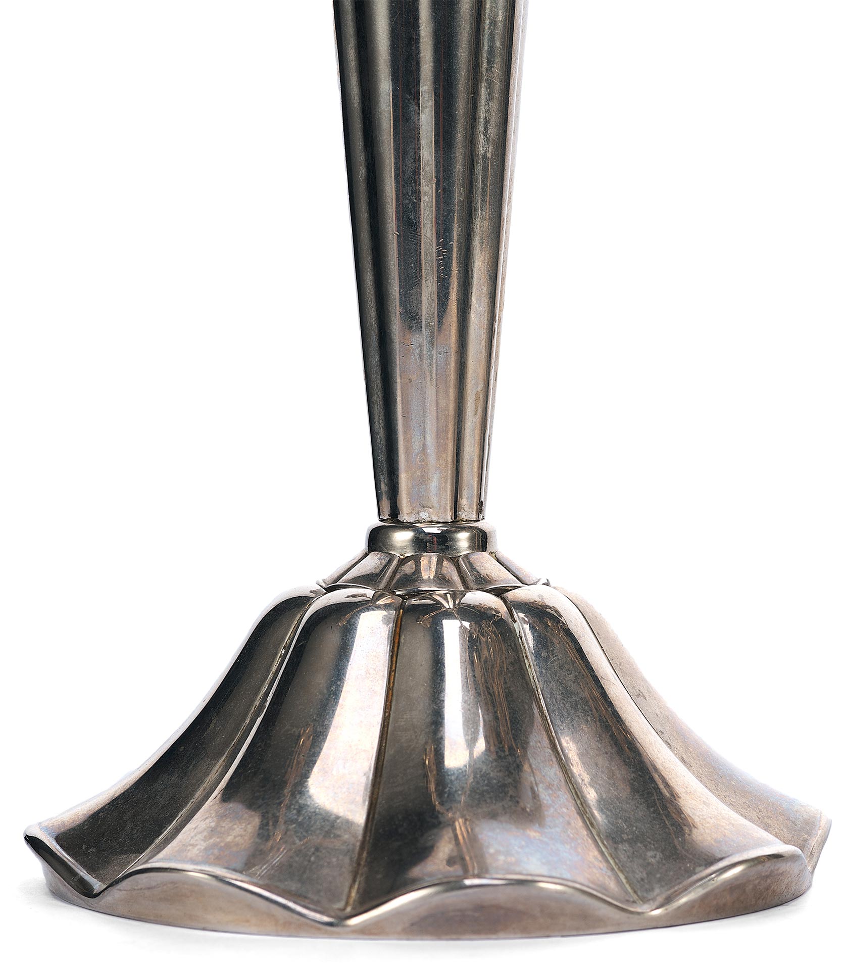 Декоративные особенности включают сложные изгибы плеч с акцентированными узлами, раструбы с волнистыми краями и гранёную ножку на основании. Такие элементы указывают на влияние неоклассицизма с характерным вниманием к пластике форм и архитектурной логике.