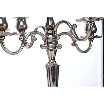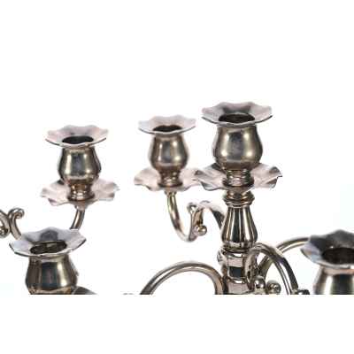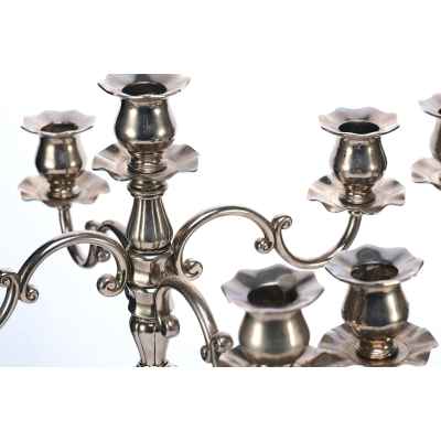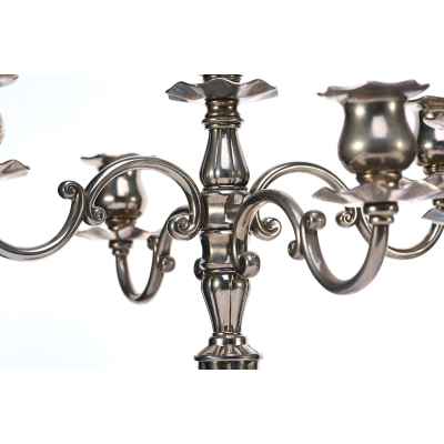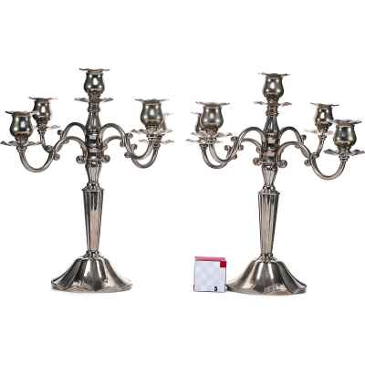 Канделябры изготовлены из металла методом штамповки и покрыты никелированием, что придаёт им благородный блеск и устойчивость к окислению. Их форма, сочетающая плавные изгибы держателей с чётко очерченным многогранным основанием, отражает утончённую работу мастеров, стремившихся к эстетике симметрии и гармонии.