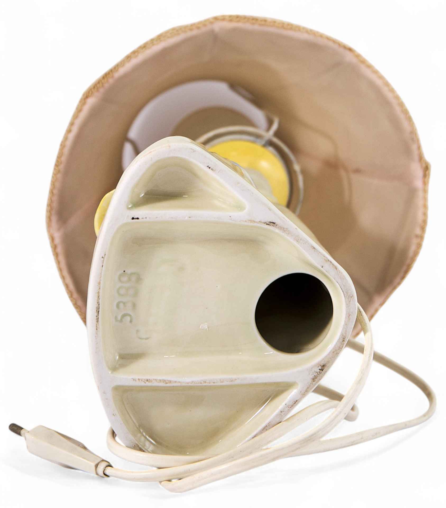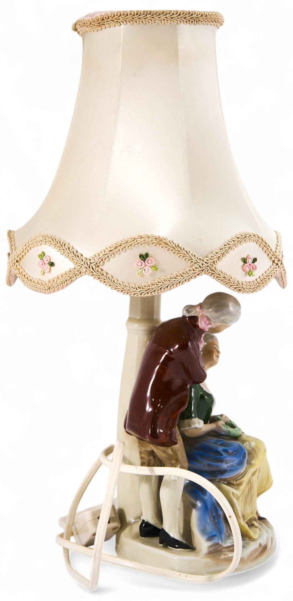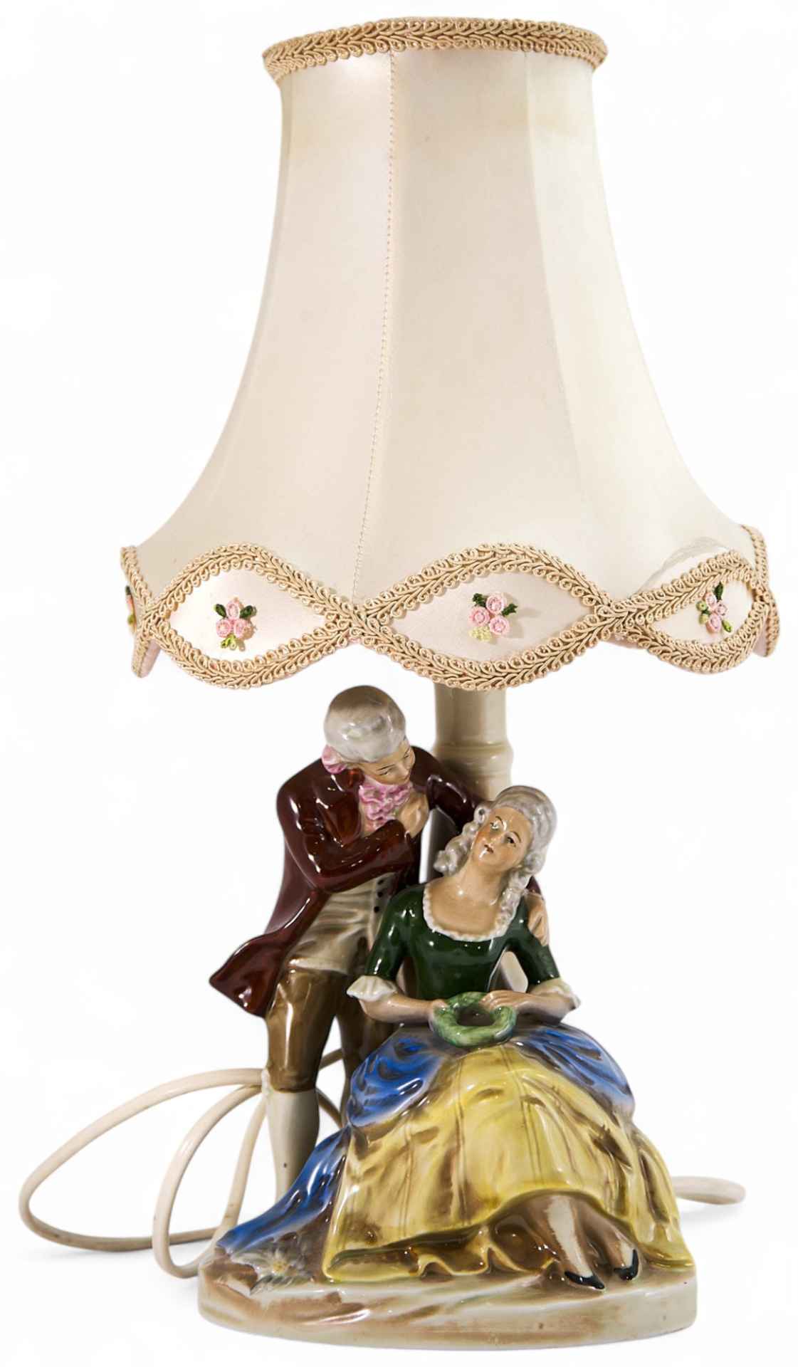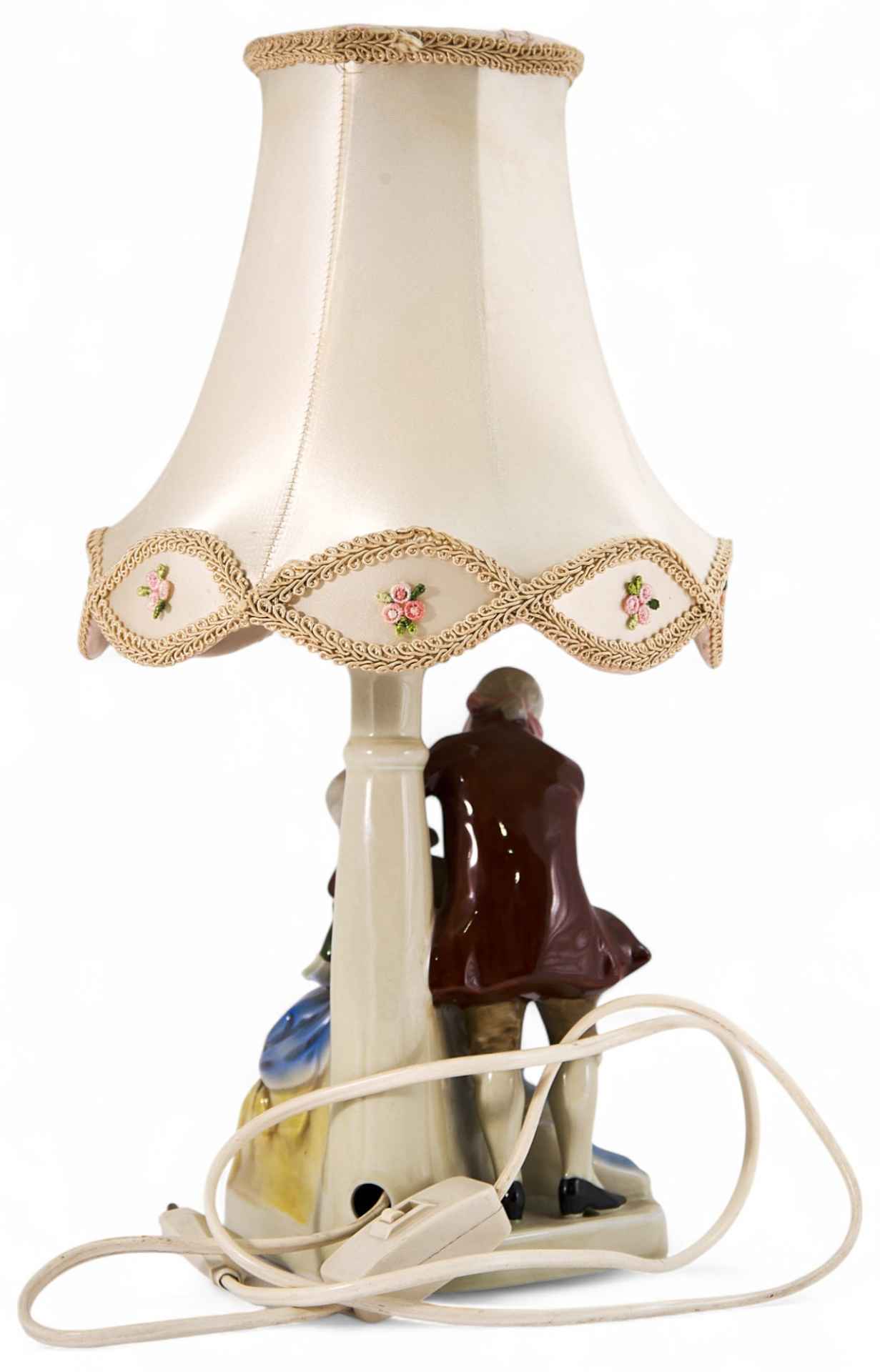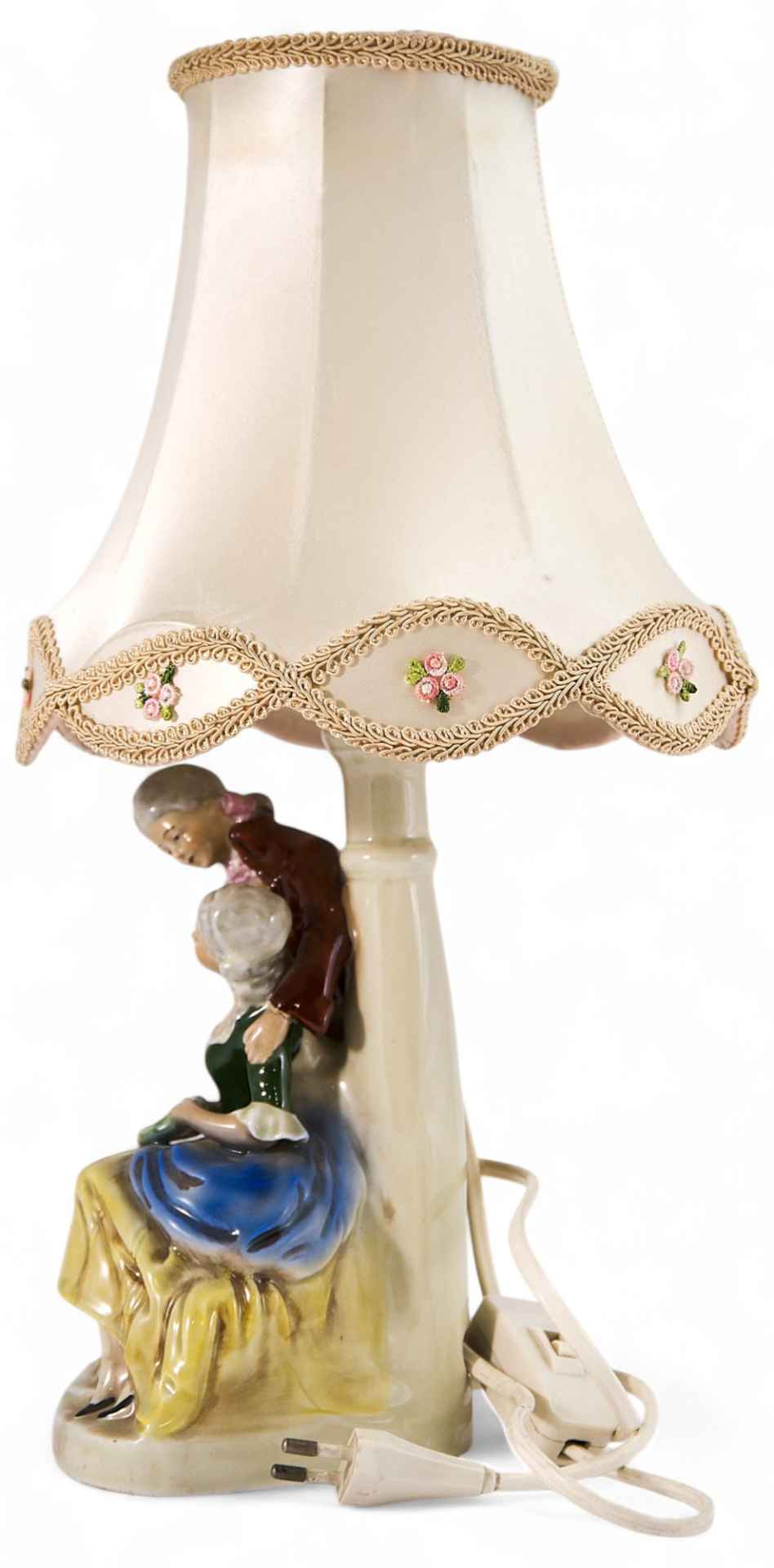 Настольная лампа со скульптурной подставкой в виде галантной пары XVIII в., оформлении характерном для фарфоровых фабрик Тюрингии. На основании пары клеймо фарфоровой мануфактуры Unger, Schneider & Сіе ставившееся после 1972 г. Внешний вид и состояние материалов изделий не противоречат указанной датировке. Фарфоровая фабрика Unger, Schneider & Сіе (Трафенталь). Основываясь на герцогский концессии, бизнесменКарл Шнайдер (который работал на