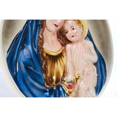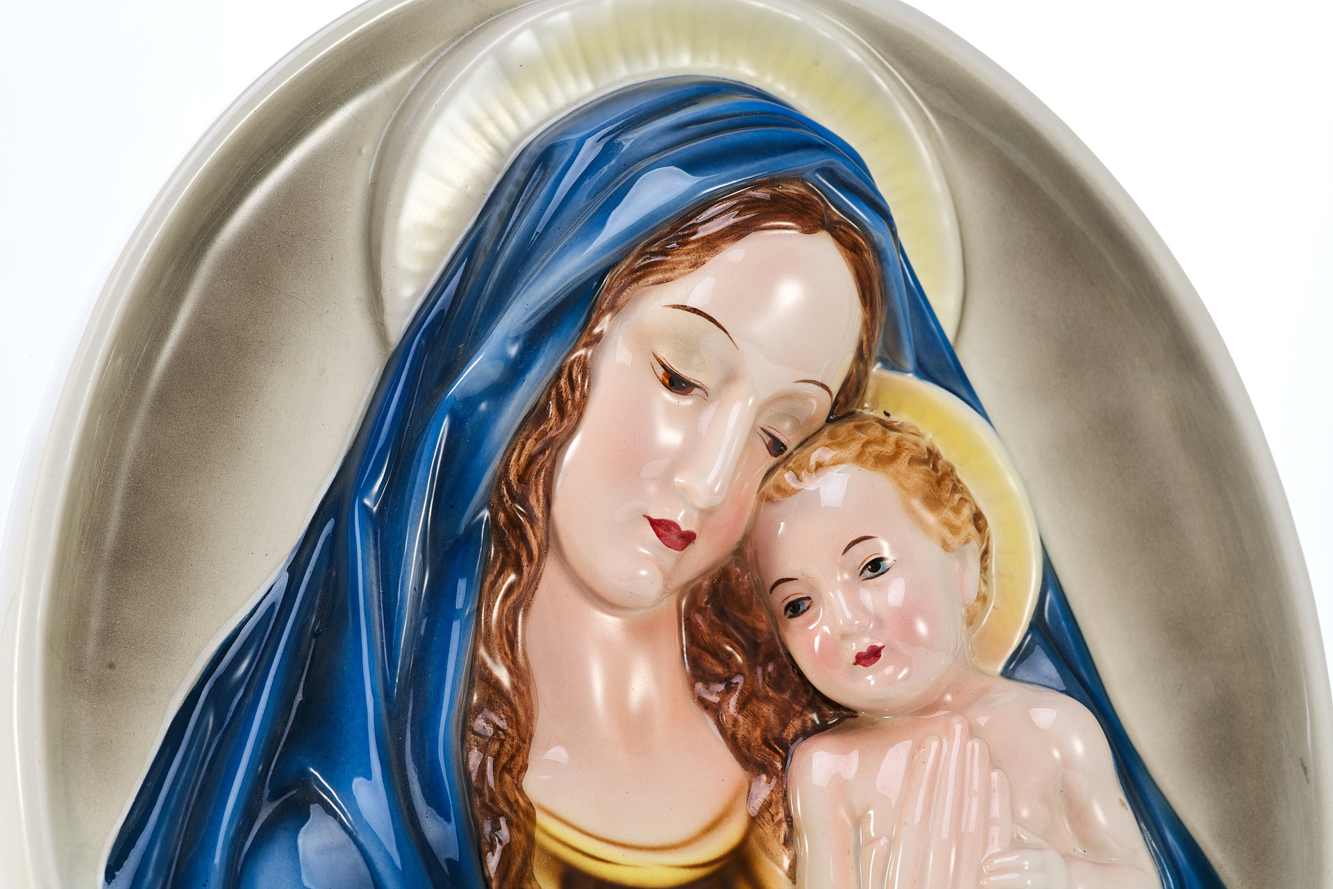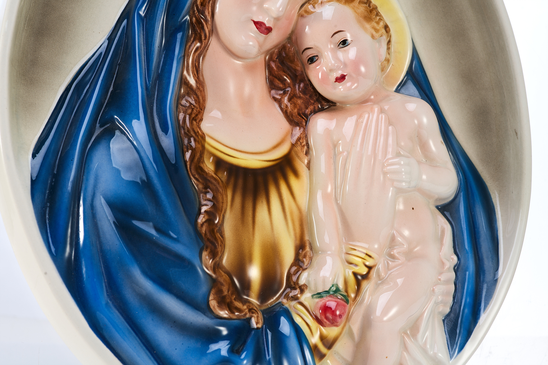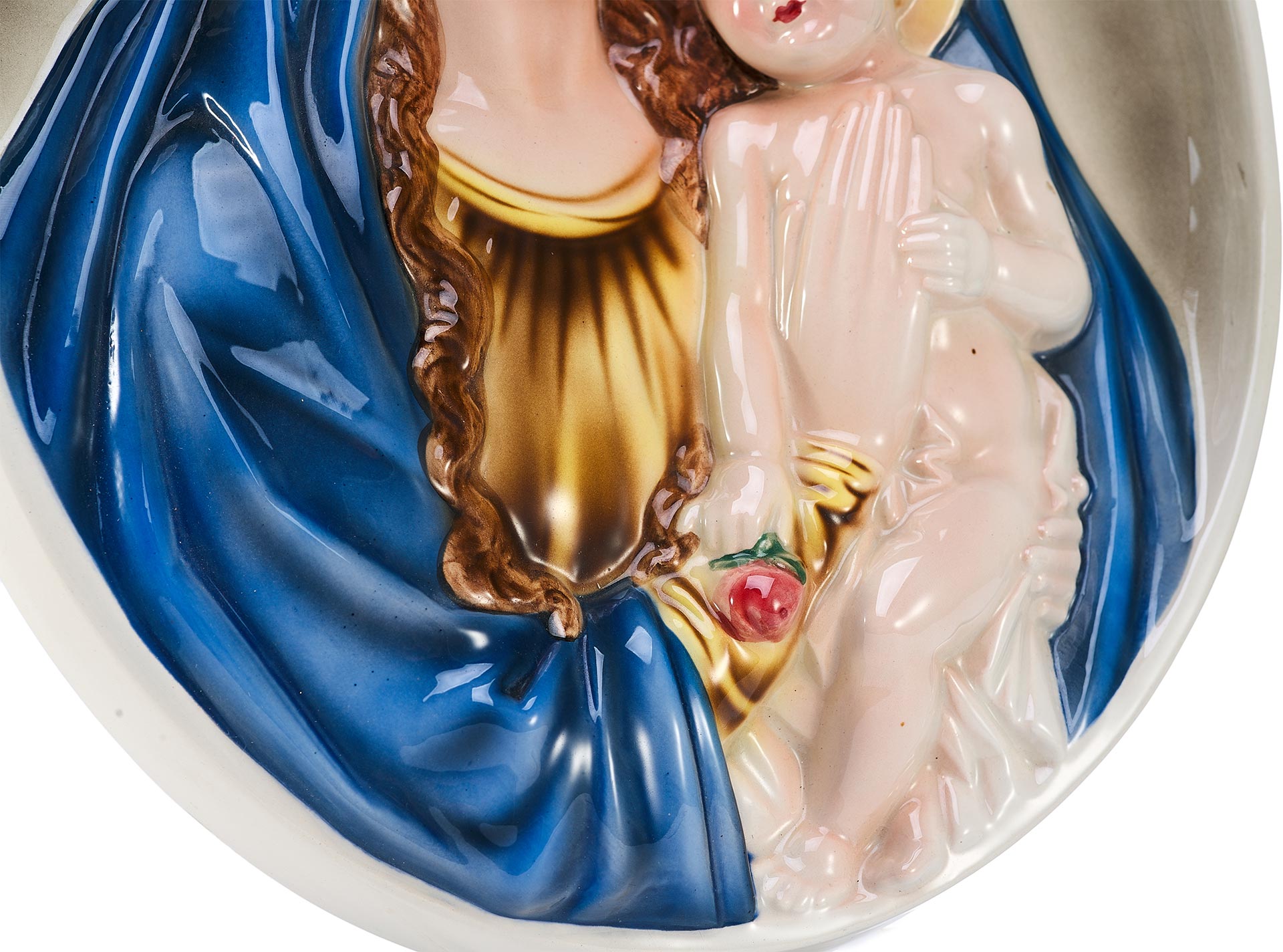 Рельефное панно «Богоматерь с младенцем» представляет собой выразительный образец сакральной декоративной пластики середины XX века. Изображение выполнено на овальной керамической пластине, где в центральной части возвышается фигура Девы Марии, нежно склонённой к младенцу Христу. Композиция пронизана одухотворённой гармонией, подчёркнутой мягкими линиями и тёплой цветовой гаммой. Этот тип религиозных изображений предназначался как для домашнего благочестия, так и для украшения частных часовен, отражая популярную в католической Европе традицию культовых настенных панно.