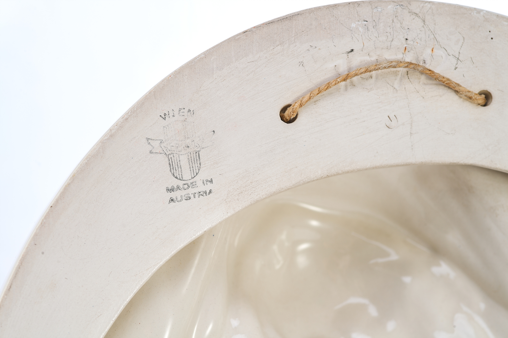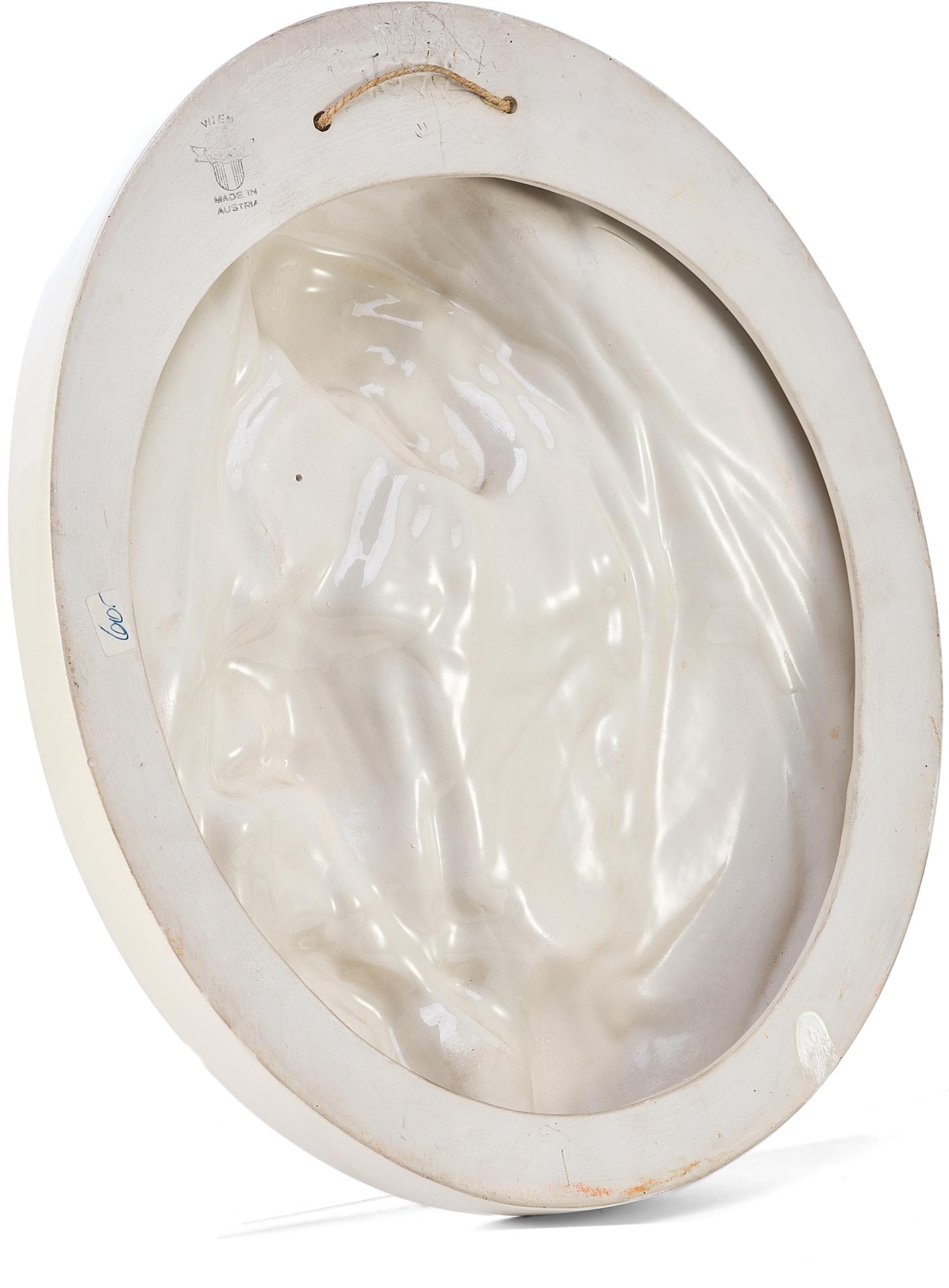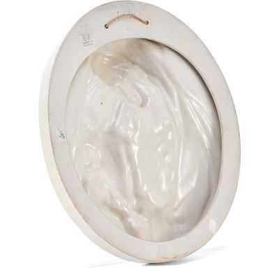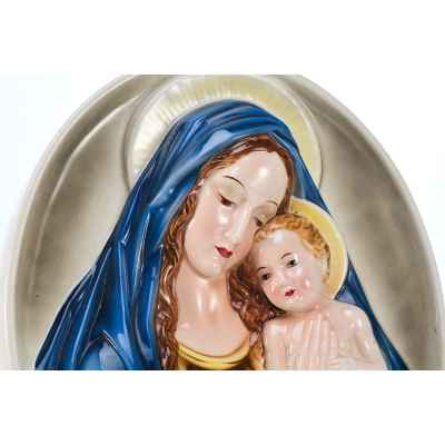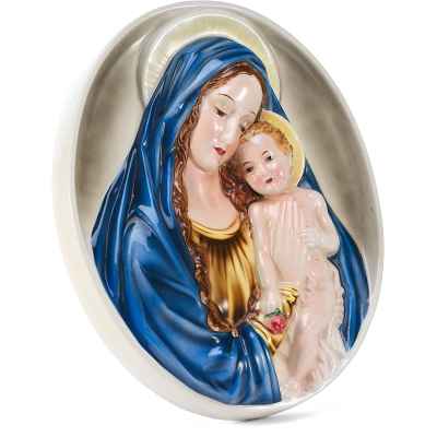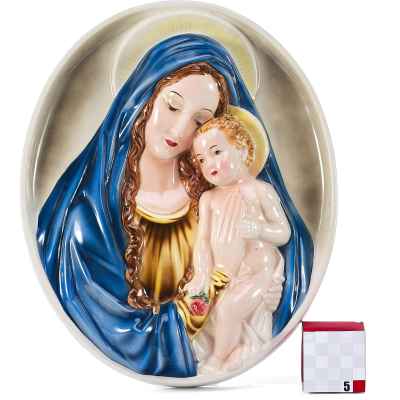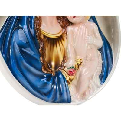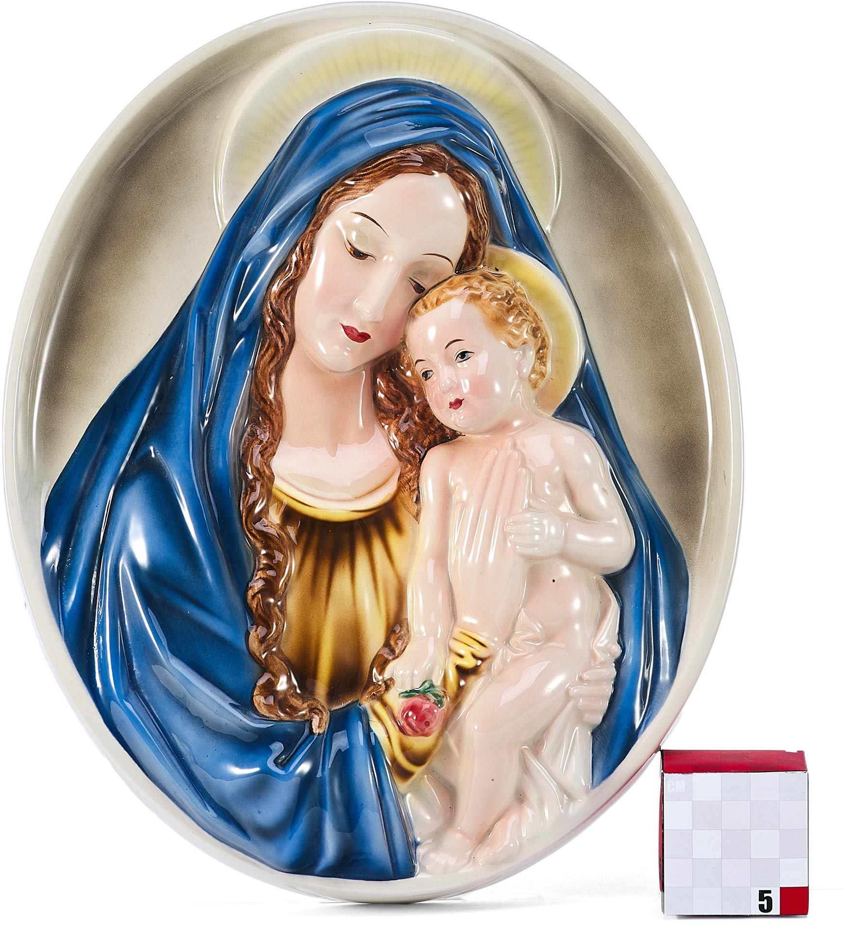 Рельефное панно «Богоматерь с младенцем» представляет собой выразительный образец сакральной декоративной пластики середины XX века. Изображение выполнено на овальной керамической пластине, где в центральной части возвышается фигура Девы Марии, нежно склонённой к младенцу Христу. Композиция пронизана одухотворённой гармонией, подчёркнутой мягкими линиями и тёплой цветовой гаммой. Этот тип религиозных изображений предназначался как для домашнего благочестия, так и для украшения частных часовен, отражая популярную в католической Европе традицию культовых настенных панно.