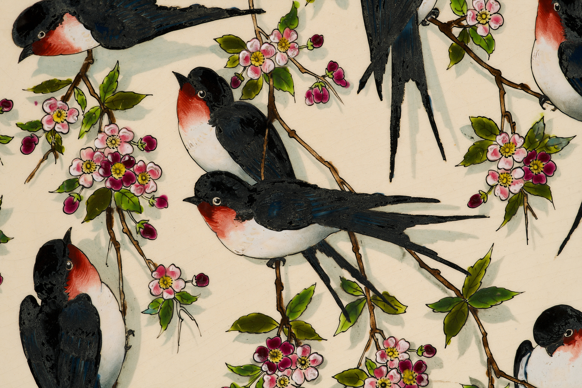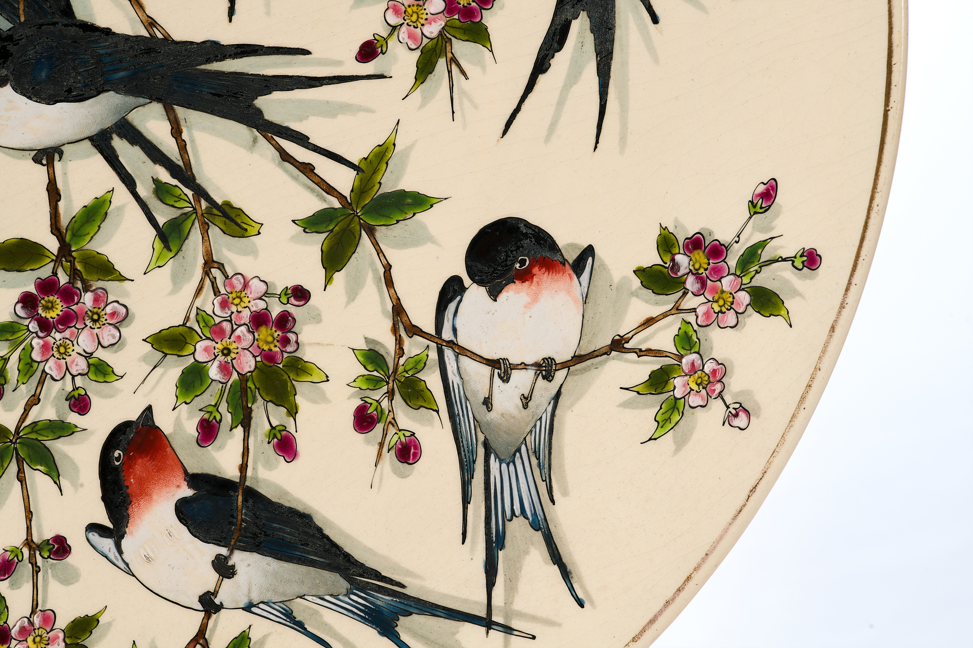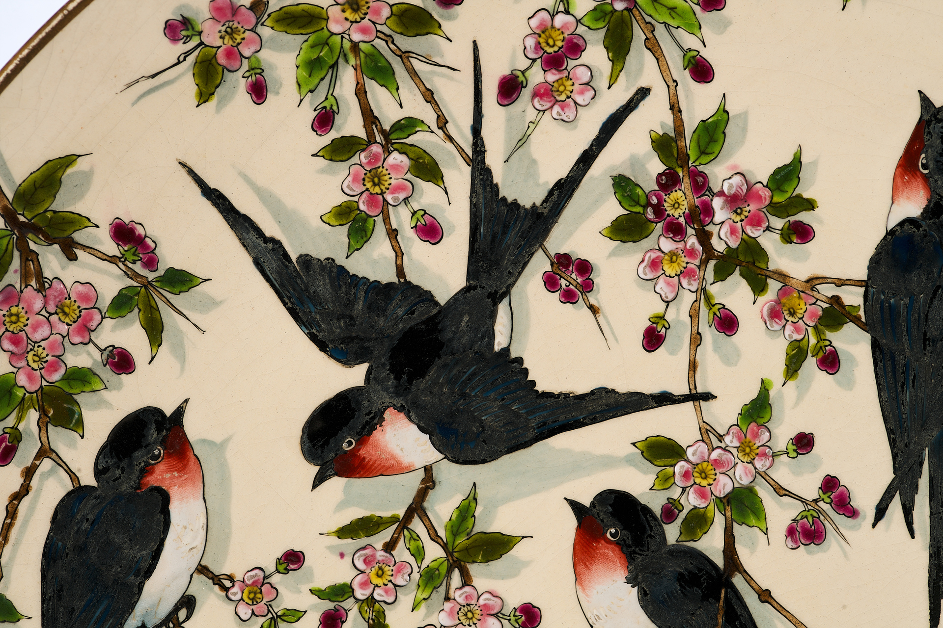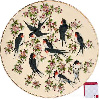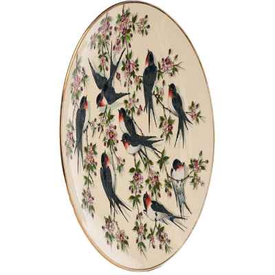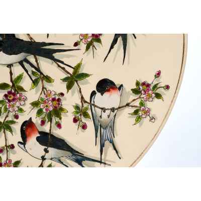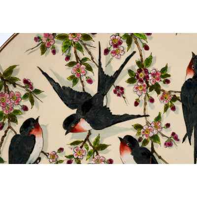 Перед нами антикварная фаянсовая декоративная тарелка, украшенная живописным изображением девяти ласточек на фоне цветущих ветвей. Композиция выстроена с особым вниманием к симметрии и ритму: птицы расположены по окружности, что придаёт изображению динамику и декоративную завершённость. Такая тарелка предназначалась преимущественно для украшения интерьера и, вероятно, являлась частью парадного убранства жилого помещения или общественного зала.