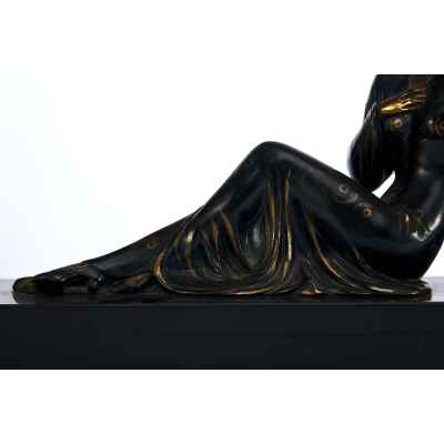 Декоративные особенности данного экземпляра заключаются в стилизованной интерпретации натурных форм, лаконичности жестов, вытянутых силуэтах и ритмичности линий. Позолоченные акценты на перьях павлина и одежде женщины добавляют изысканный блеск, подчёркивая принадлежность скульптуры к эстетике ар-деко.