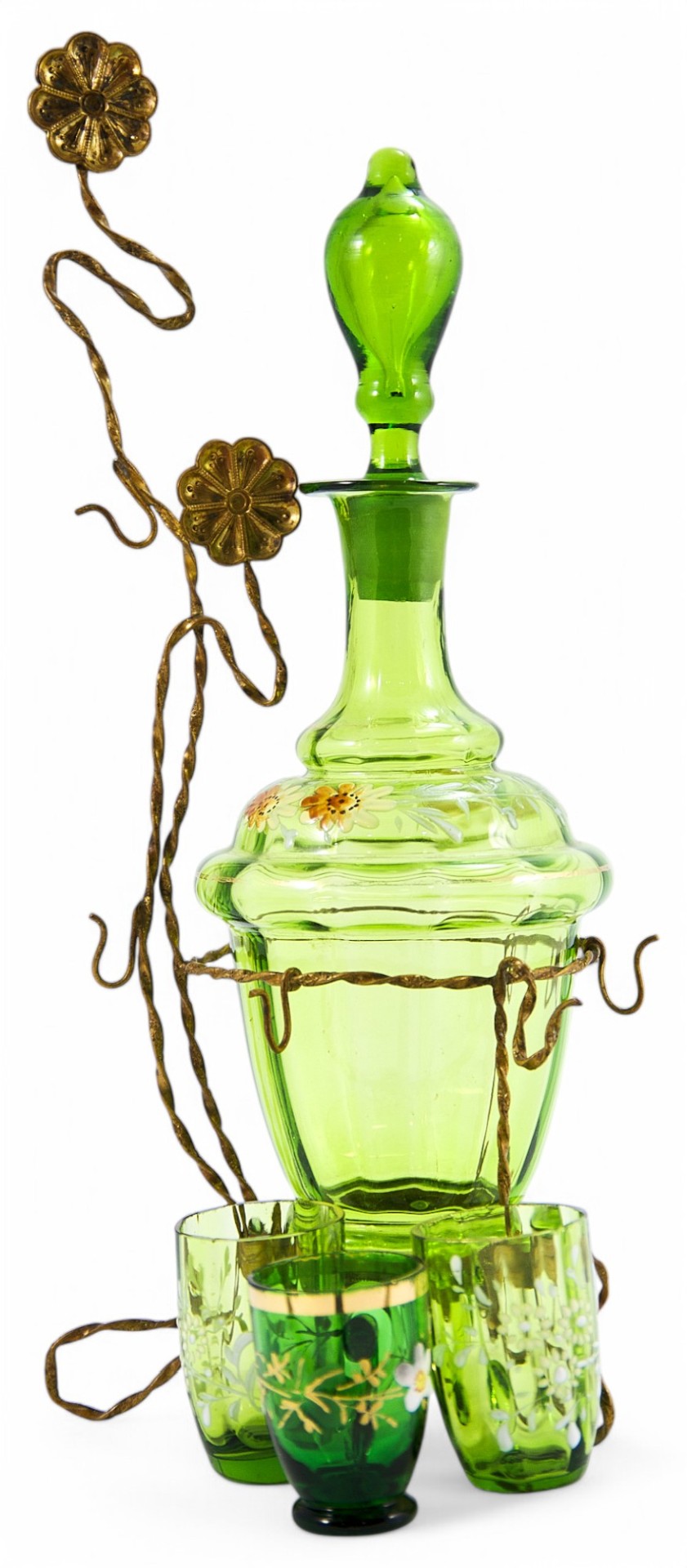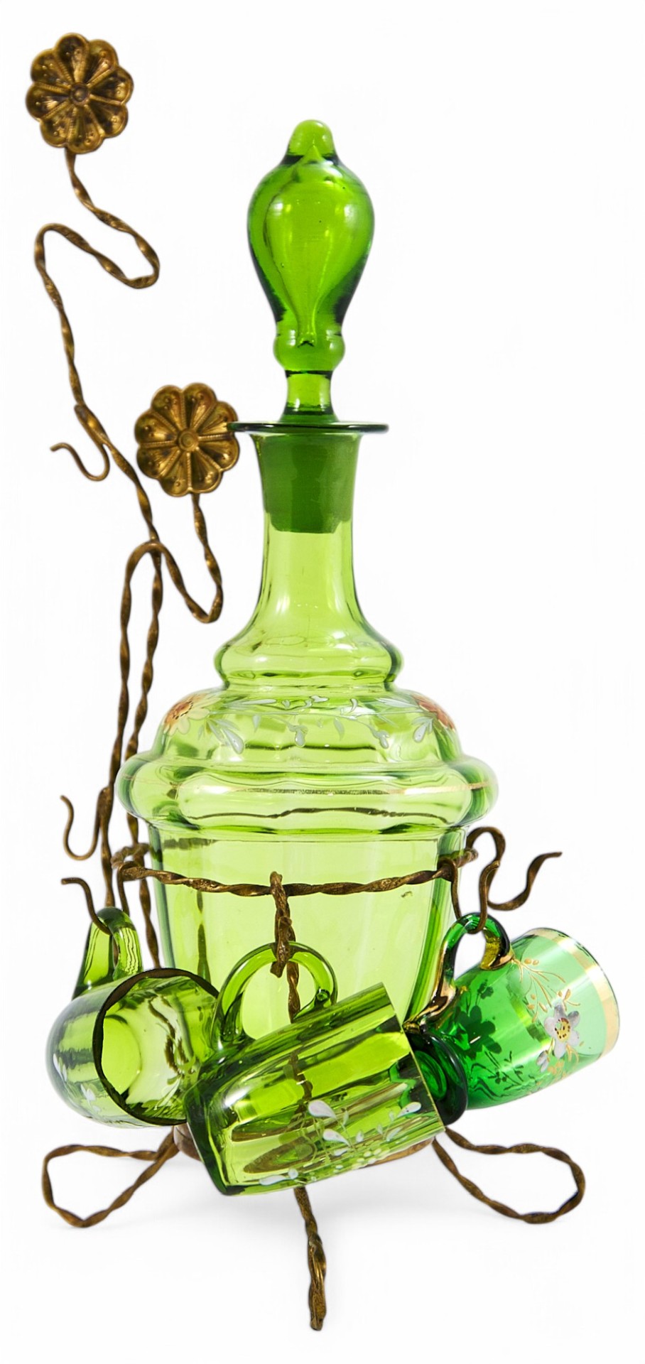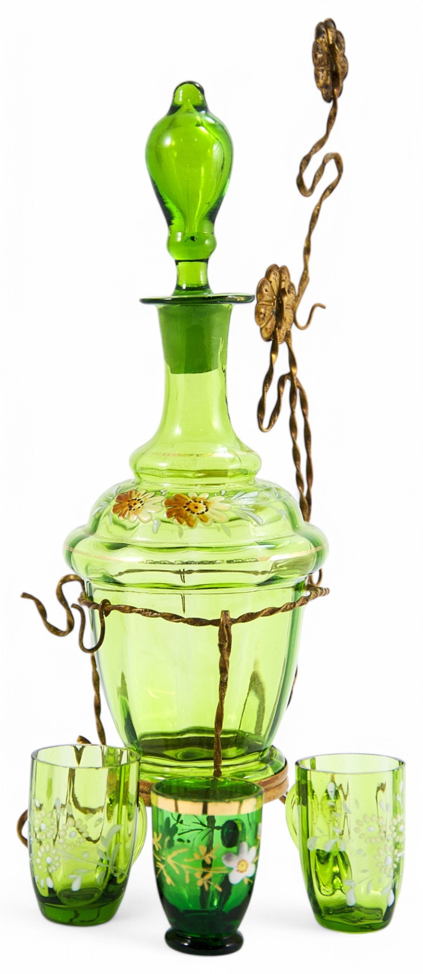 Набор для алкогольных напитков (рома, ликера, наливок и настоек) состоящий из: графина с пробкой, трех кружечек и латунной подставки. Стилистически пластика и динамика оформления предметов соответствуют принципам стиля модерн. В конце XIX века, в связи с нарастающим влиянием широкораспространенного французского варианта стиля модерн в