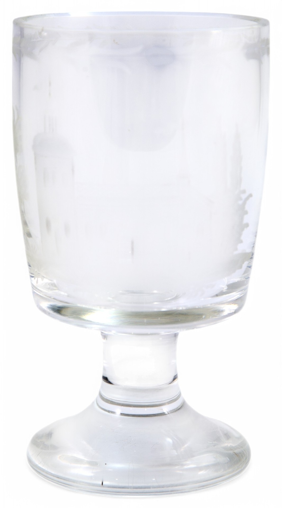 Изготовленный из бесцветного стекла, этот кубок выполнен с применением гравировки и травления, что добавляет его поверхности утончённый декоративный эффект. Богемское стекло конца XIX века славилось своей исключительной прозрачностью и блеском, благодаря низкому содержанию оксидов свинца. Такие изделия считались роскошными и нередко использовались в качестве подарочных кубков, поддерживая высокую репутацию богемского стекла как элитного сувенирного продукта.