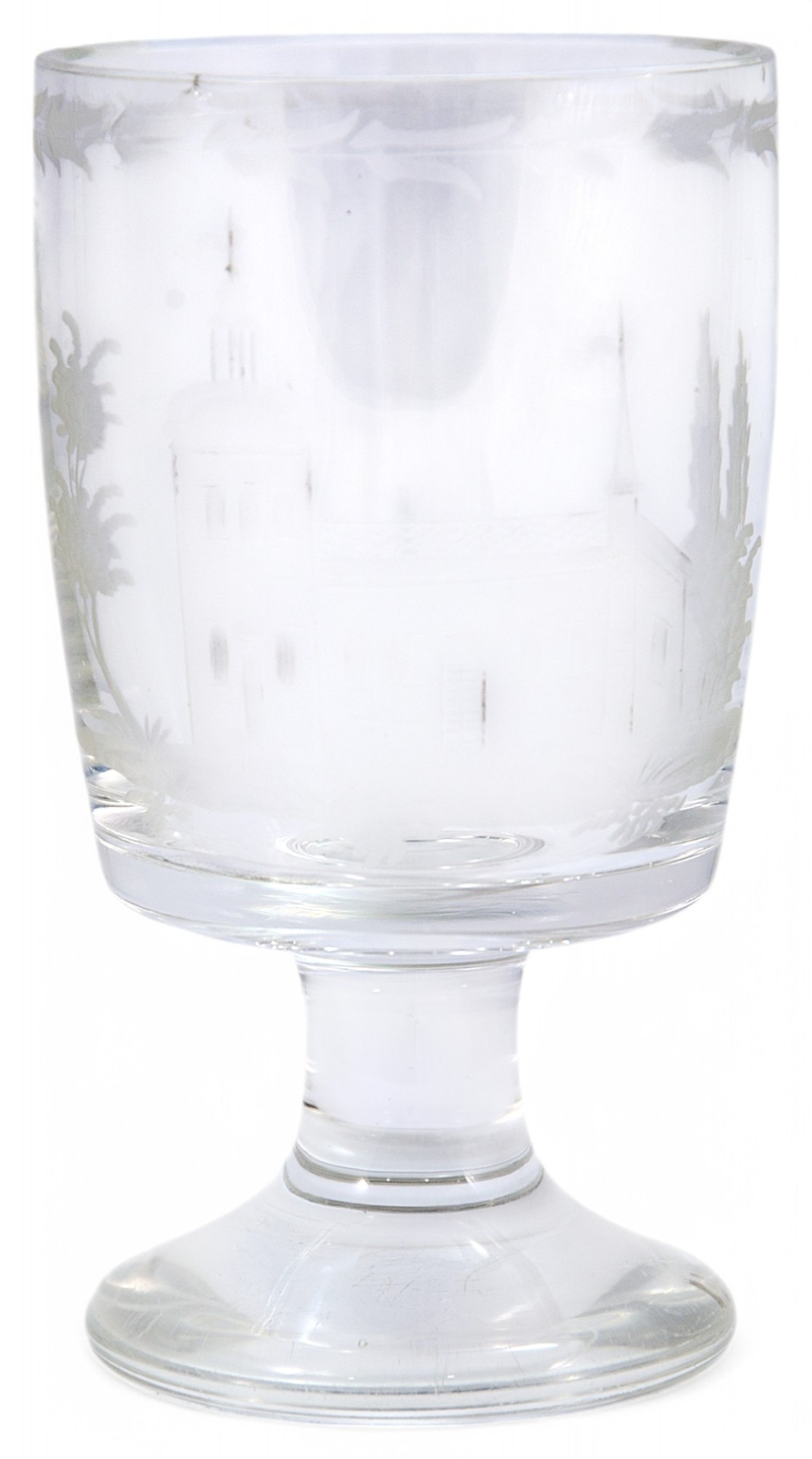Этот стеклянный кубок конца XIX века, выполненный в Богемии, является прекрасным примером высокого качества богемского стекла. Он имеет классическую форму с толстой, невысокой ножкой и украшен фризом в виде стилизованного растительного орнамента с дубовыми веточками.
