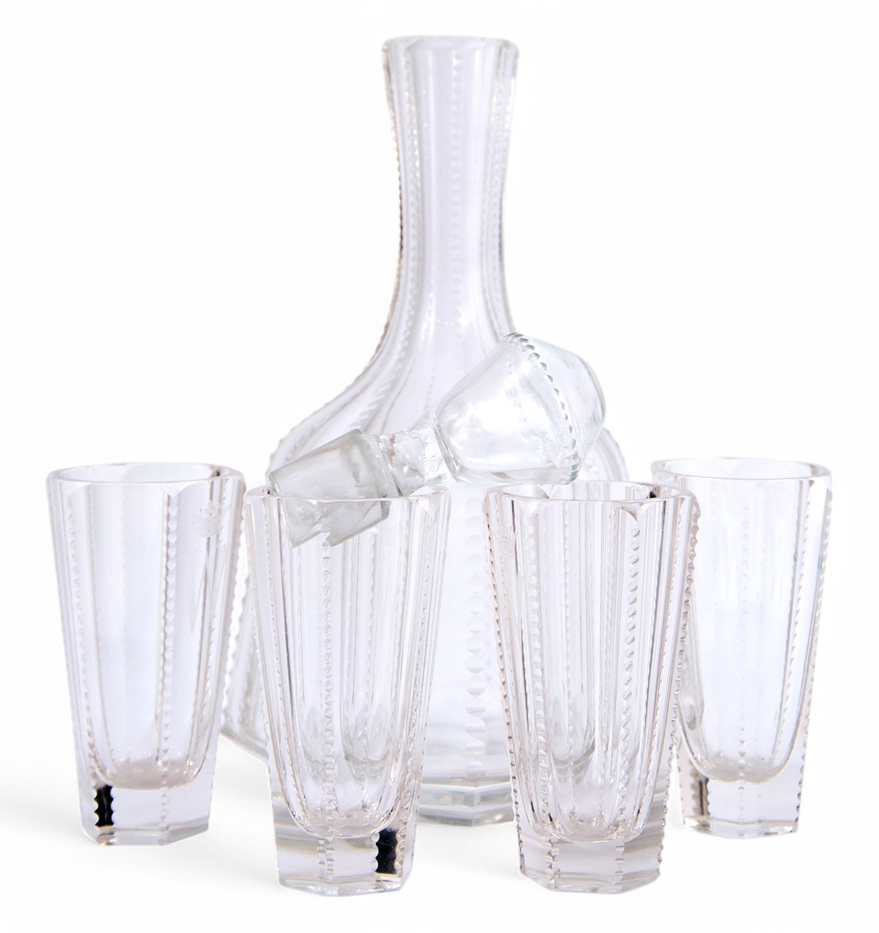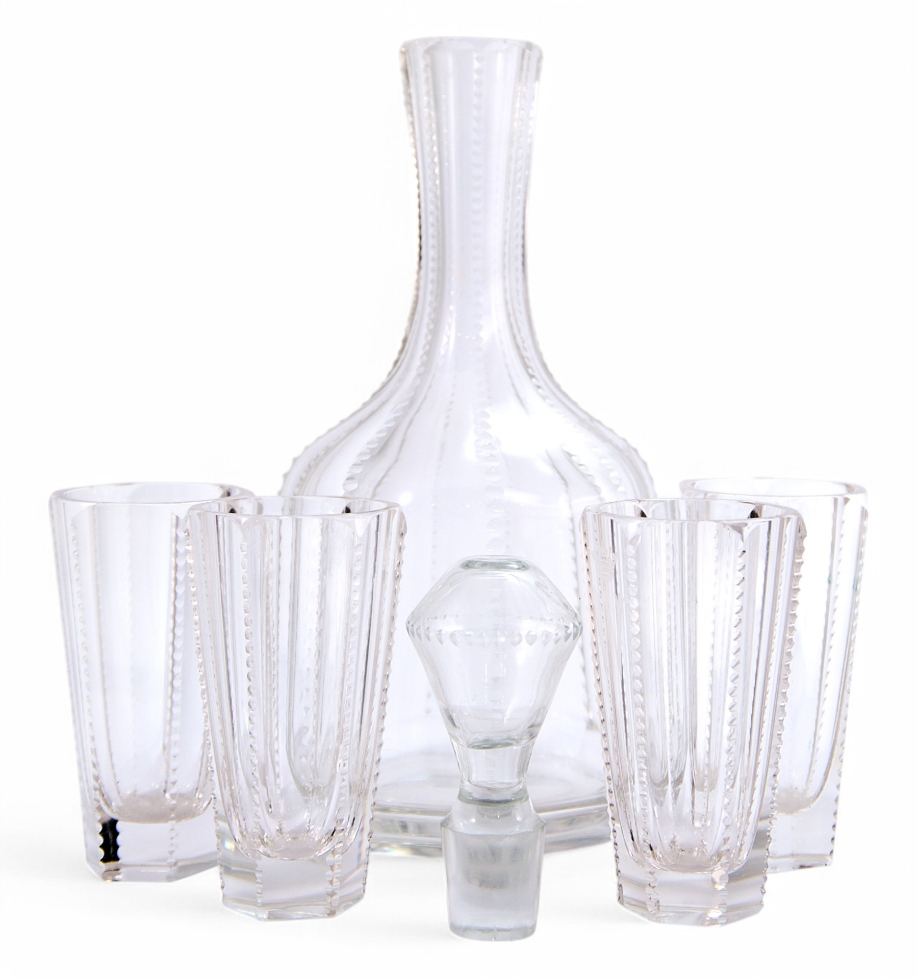 Изысканный набор для бара, изготовленный в первой четверти XX века в Европе, выполнен из высококачественного прозрачного стекла и представляет собой образец утончённого стеклоделия того времени. Он состоит из графина с пробкой и двух стаканов, оформленных в едином лаконичном стиле.