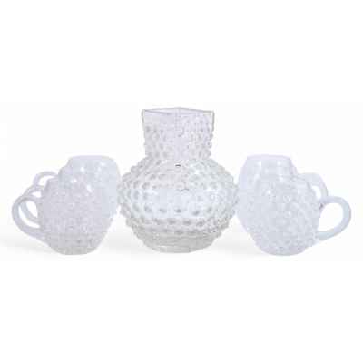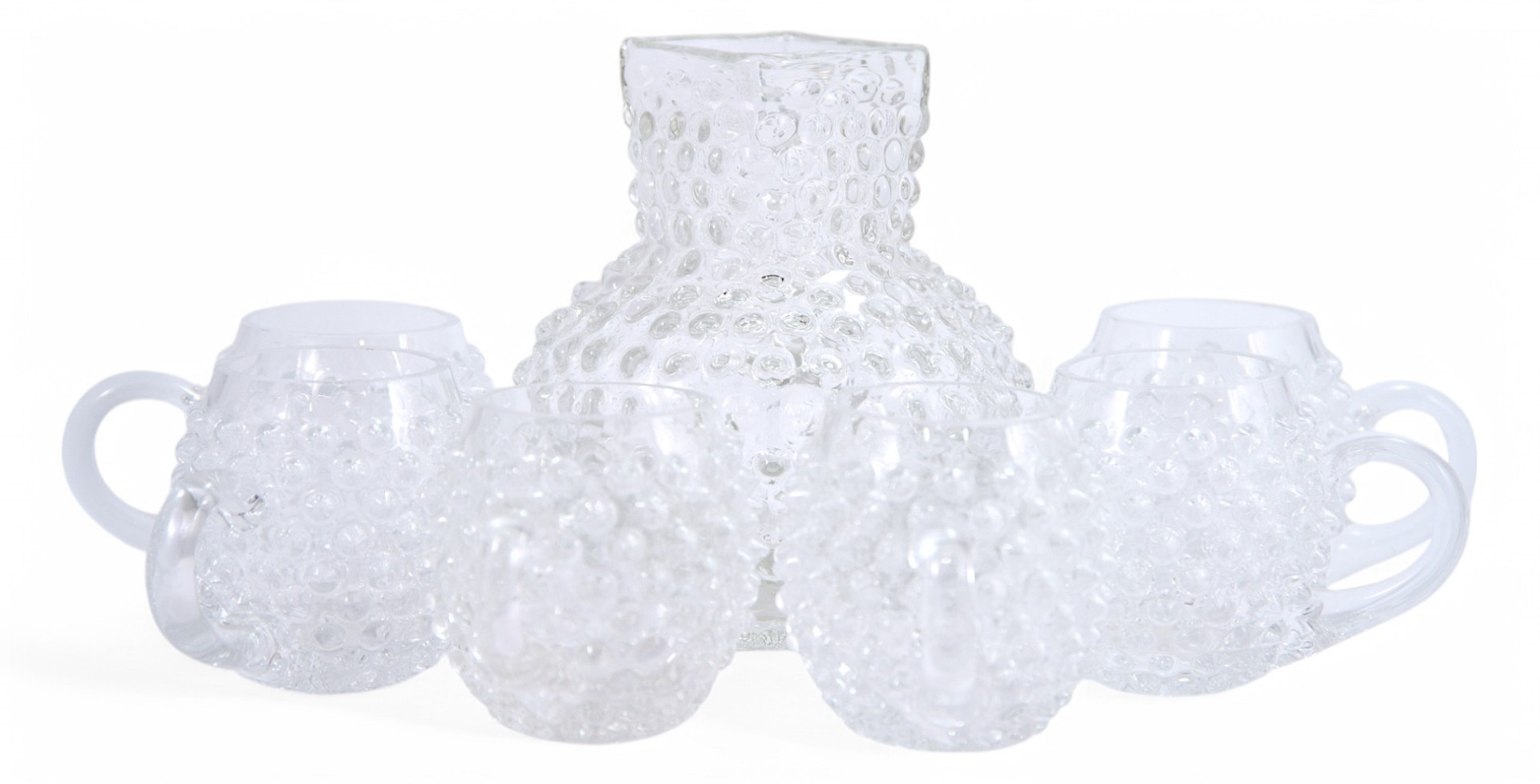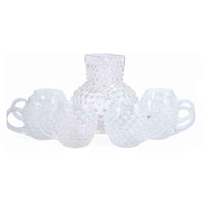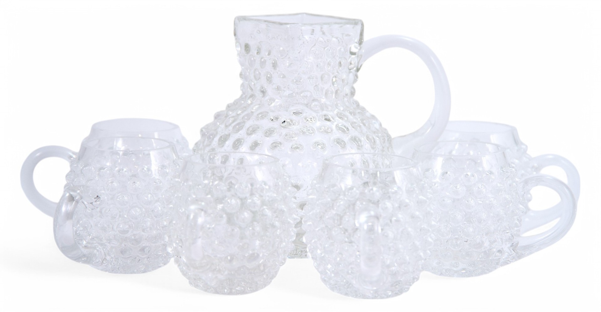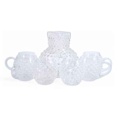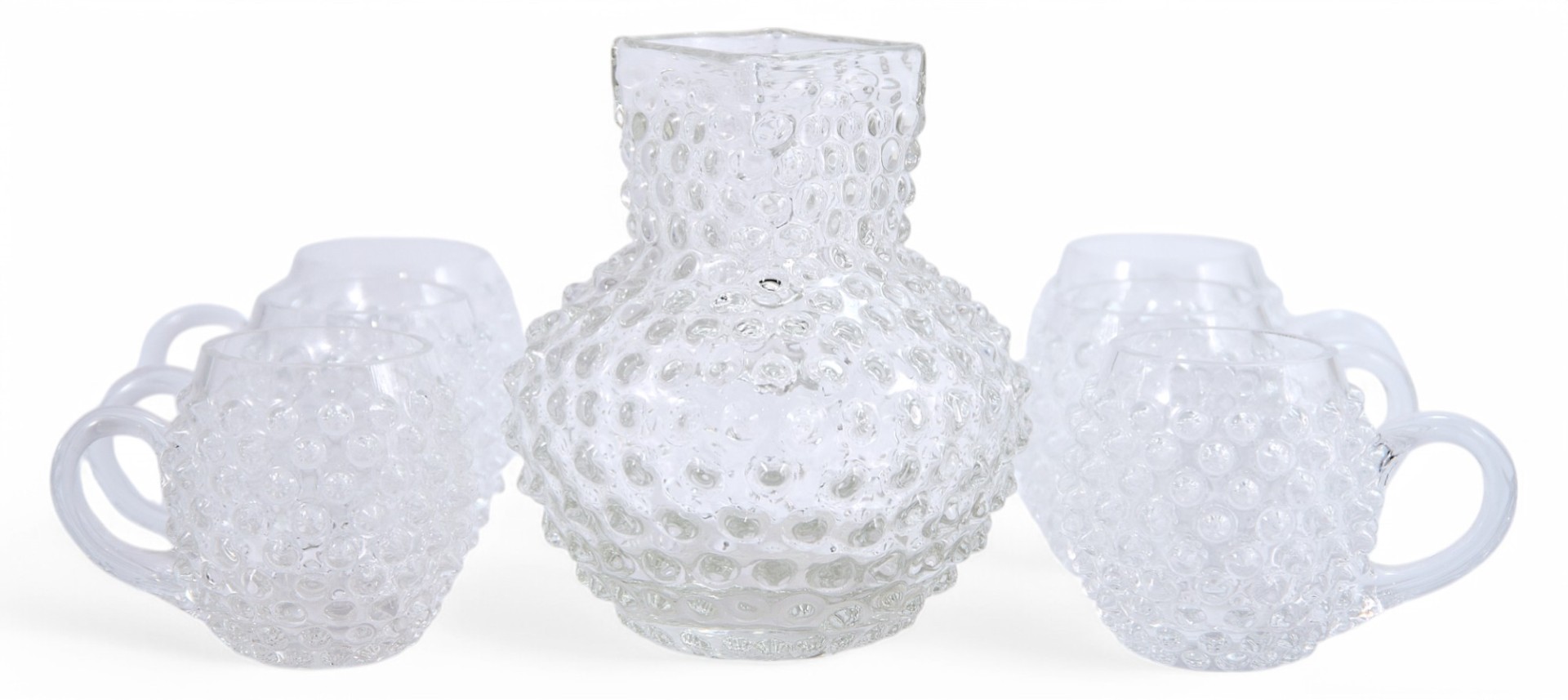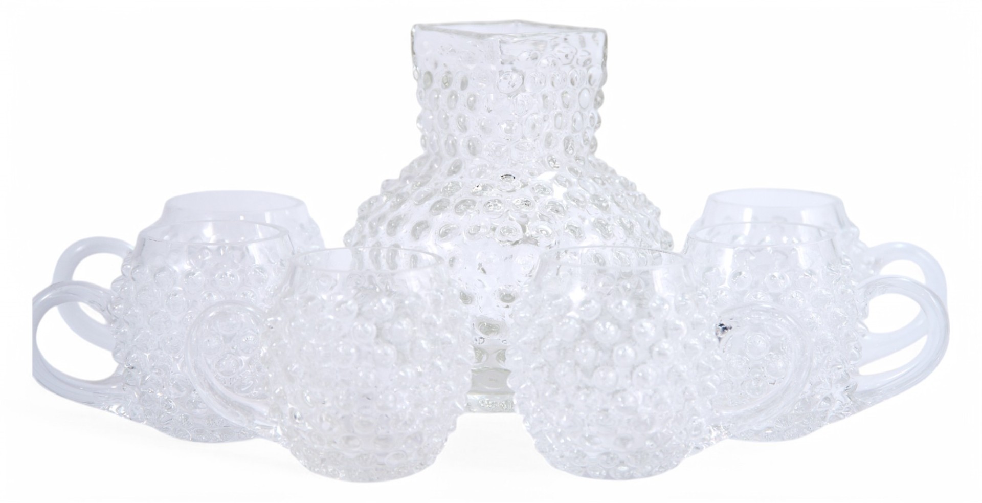 Этот антикварный набор для холодных напитков, состоящий из кувшина и шести кружек, был изготовлен в Европе в первой половине XX века. Выполненный из прессованного стекла, он представляет собой интересный образец массового стекольного производства того времени.