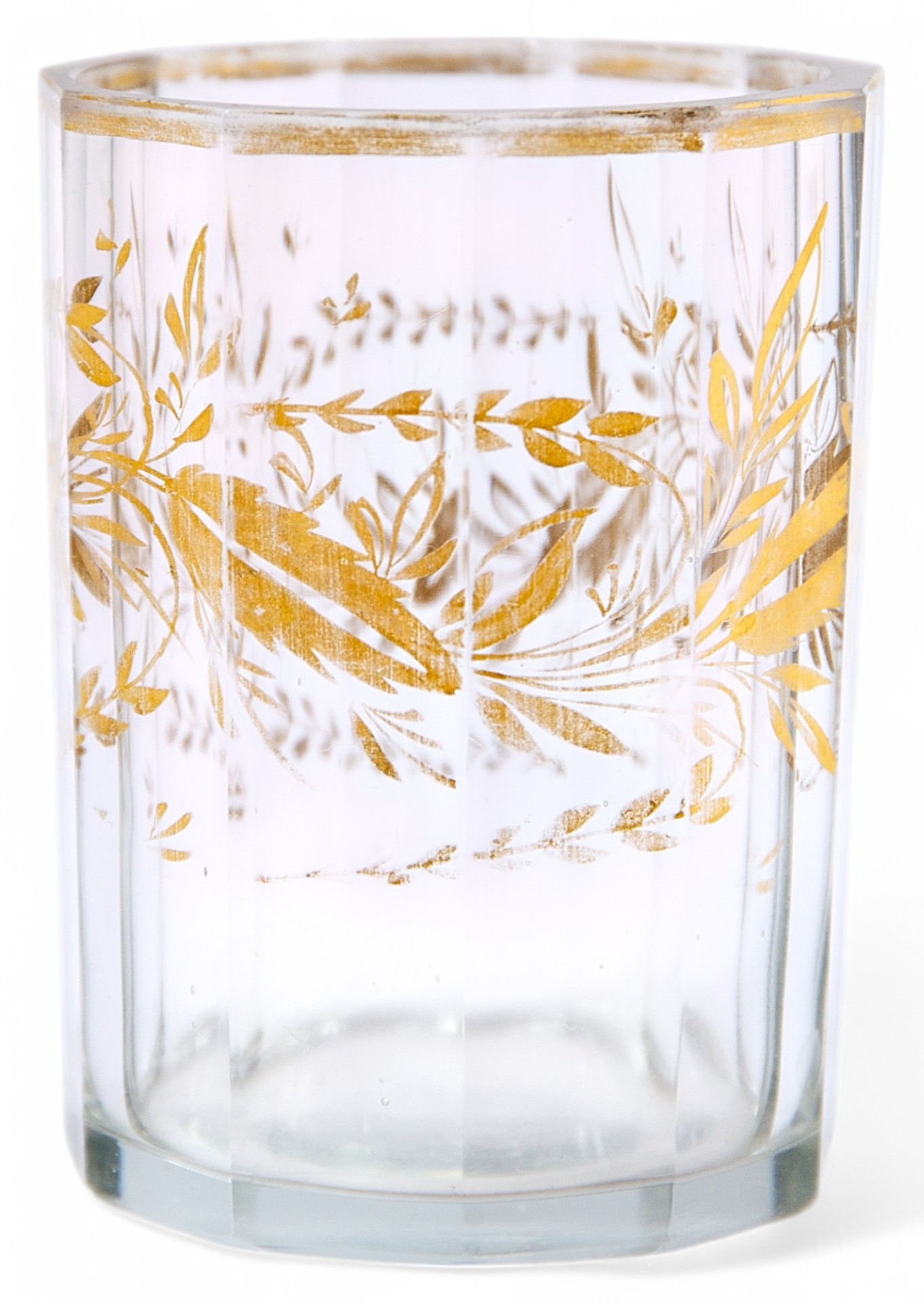 Этот гранёный стеклянный стакан, выполненный в Богемии в 1780-е годы, представляет собой изысканный образец раннего стеклодувного искусства региона. Он демонстрирует характерные черты богемского стекла XVIII века – прозрачность, аккуратность обработки и использование декоративных элементов.