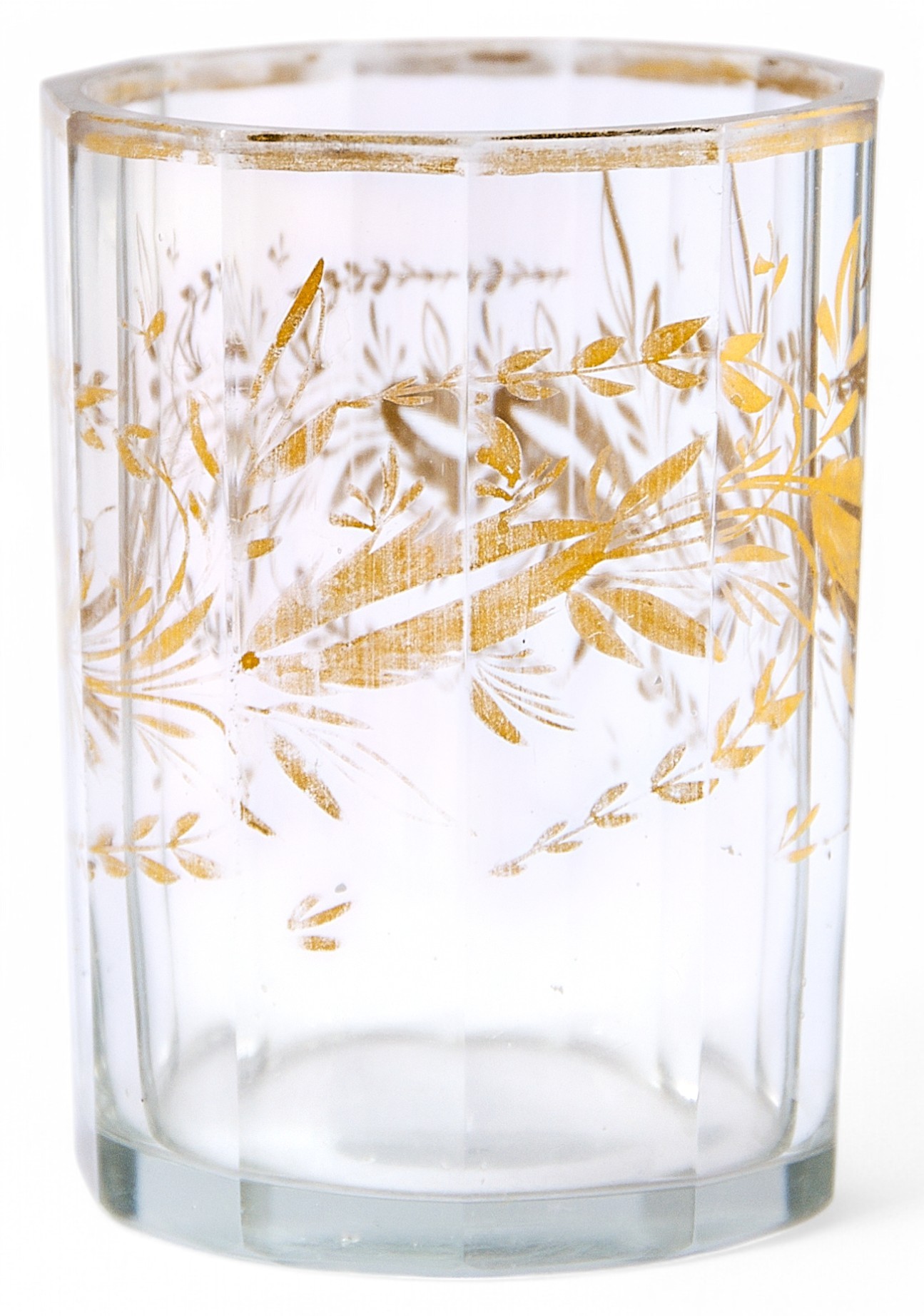 В конце XVIII века богемские стеклодувы славились своими технологическими инновациями, включая многослойное стекло, резьбу и позолоту. Золотая роспись, выполненная по шлифованному стеклу, требовала высокой точности: сусальное золото наносилось на подготовленную поверхность, а затем запекалось при высокой температуре, обеспечивая прочность покрытия.