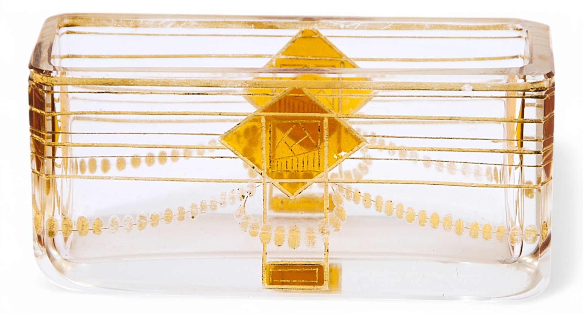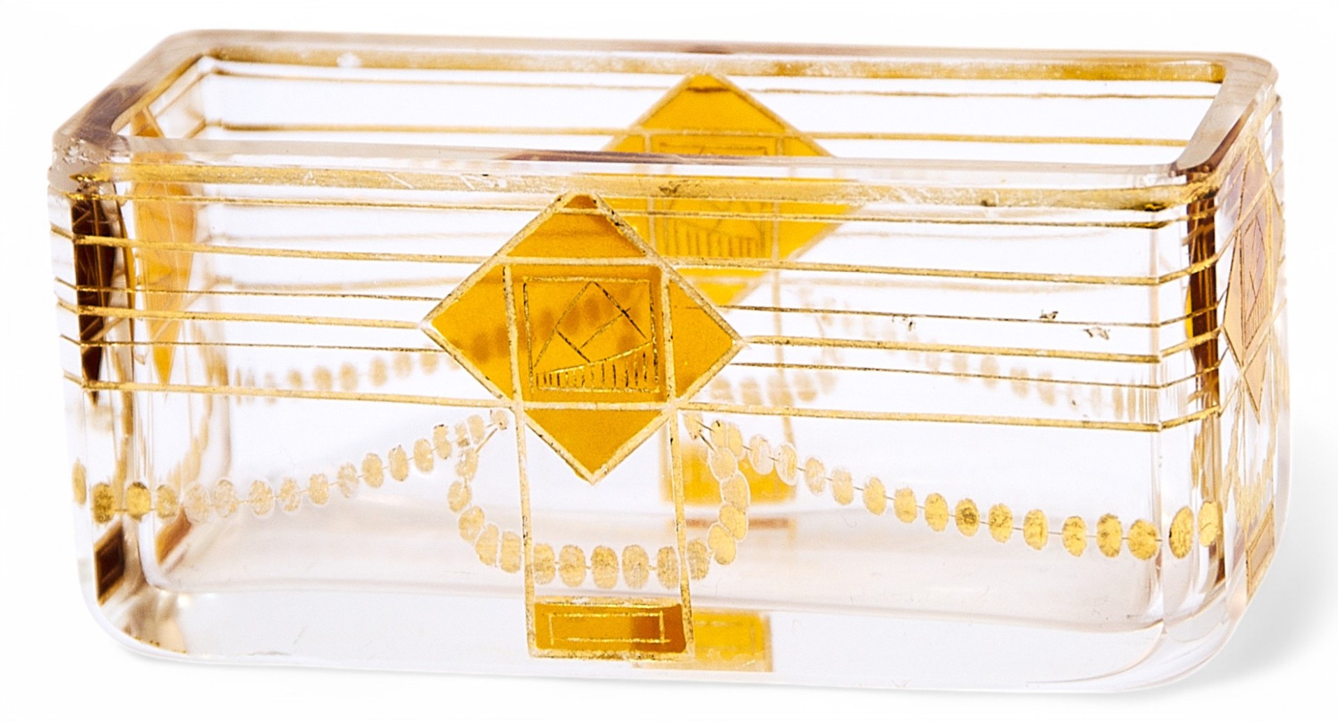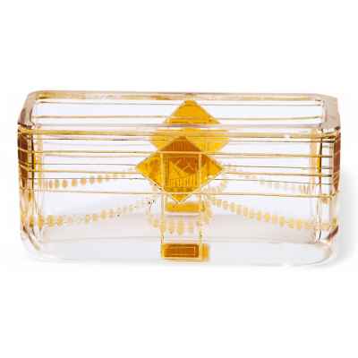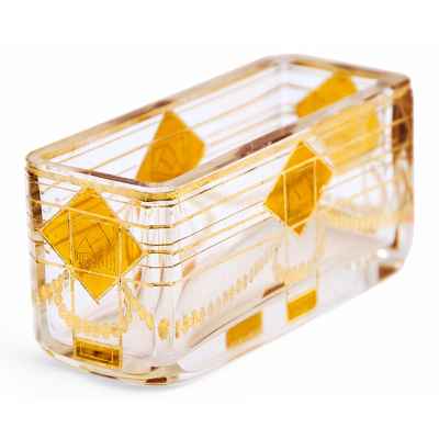 Эта изысканная стеклянная ваза, созданная в Богемии в 1910–1920-е годы, является выразительным примером перехода от модерна к ар-деко. Её лаконичная прямоугольная форма и строгая геометрия декора отражают влияние нового стиля, который постепенно заменял изогнутые, природные линии модерна более чёткими и симметричными композициями.