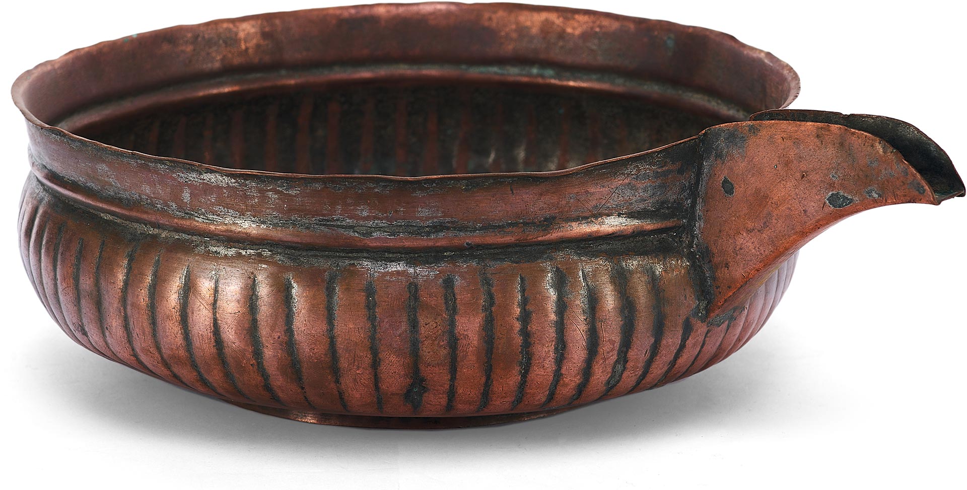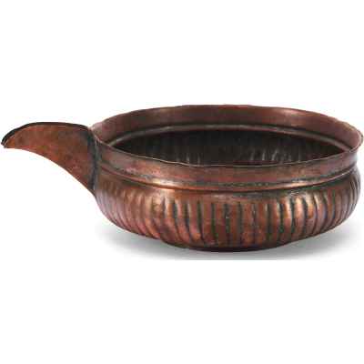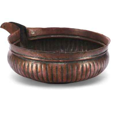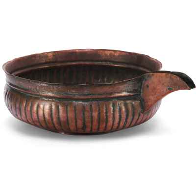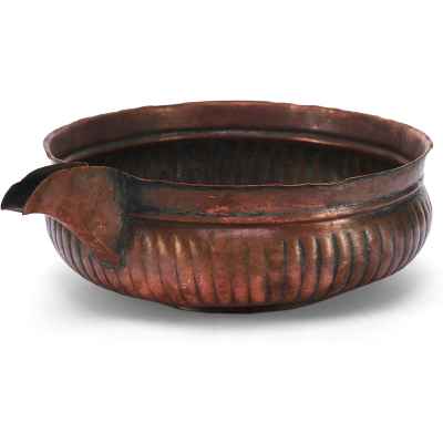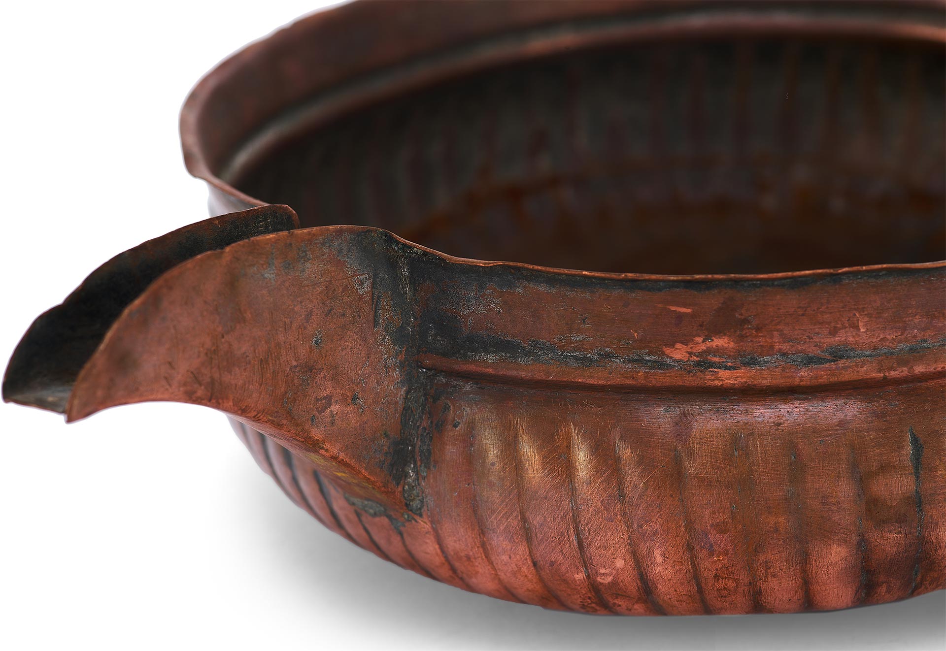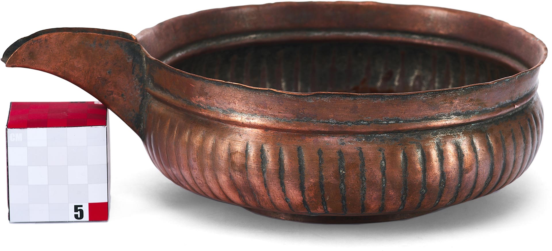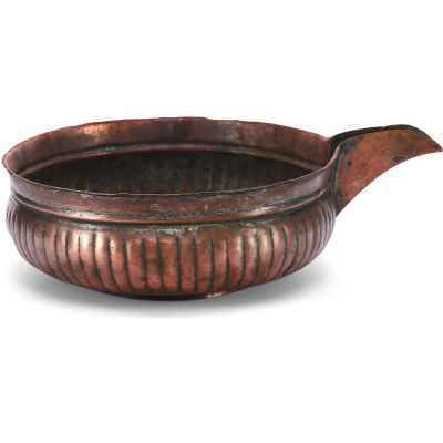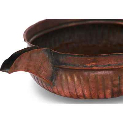 Ендова — традиционный русский сосуд округлой формы с широким горлом и носиком, служивший для разлива напитков во время пиршеств. Представленный экземпляр относится к XVIII веку и выполнен из медного сплава с применением техники штамповки. Характерной особенностью формы является оформление чаши с так называемой «разделкой ложками» — декоративным приёмом, характерным для древнерусского декоративно-прикладного искусства. Подобное оформление создавало ритмичную фактуру поверхности и свидетельствовало о мастерстве изготовителя.