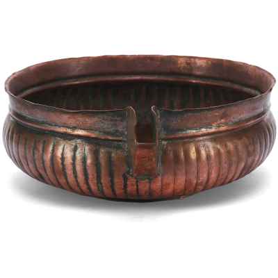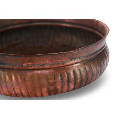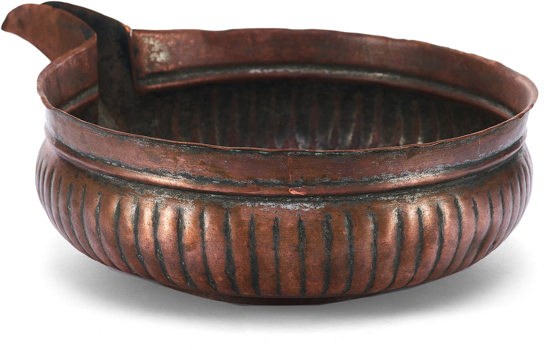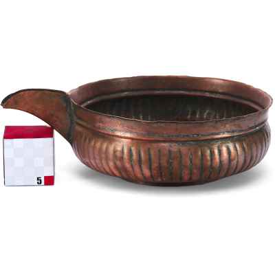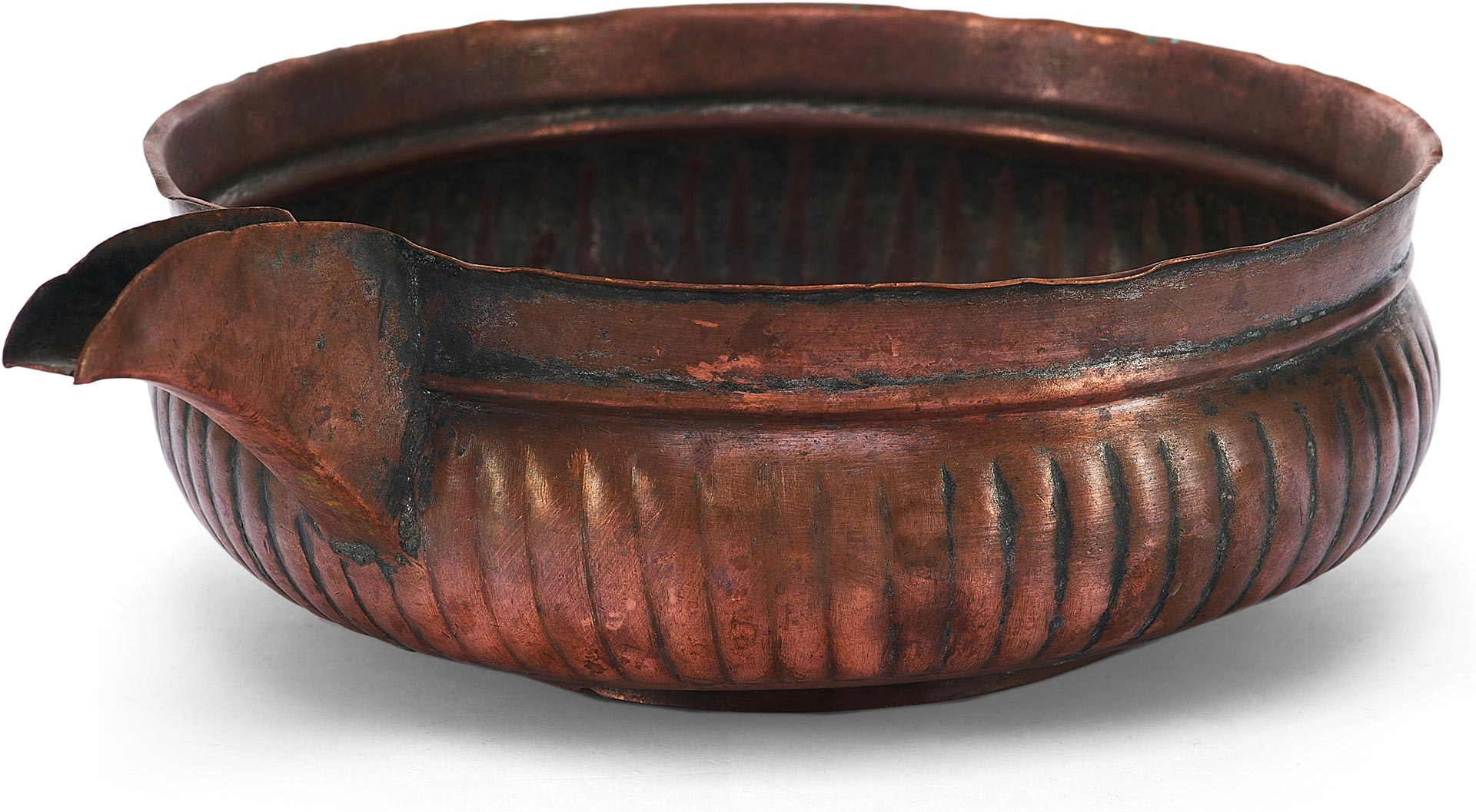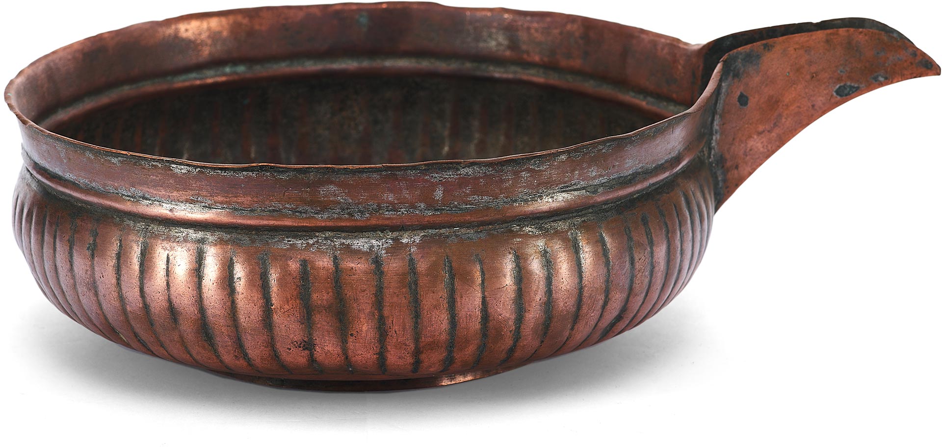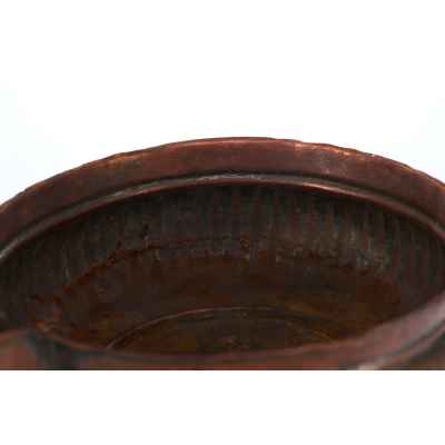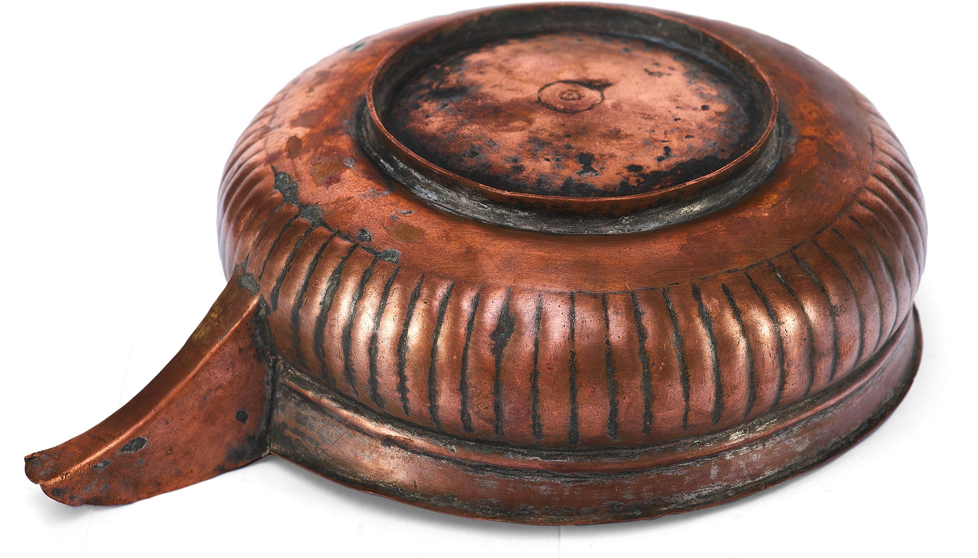 Ендова — традиционный русский сосуд округлой формы с широким горлом и носиком, служивший для разлива напитков во время пиршеств. Представленный экземпляр относится к XVIII веку и выполнен из медного сплава с применением техники штамповки. Характерной особенностью формы является оформление чаши с так называемой «разделкой ложками» — декоративным приёмом, характерным для древнерусского декоративно-прикладного искусства. Подобное оформление создавало ритмичную фактуру поверхности и свидетельствовало о мастерстве изготовителя.