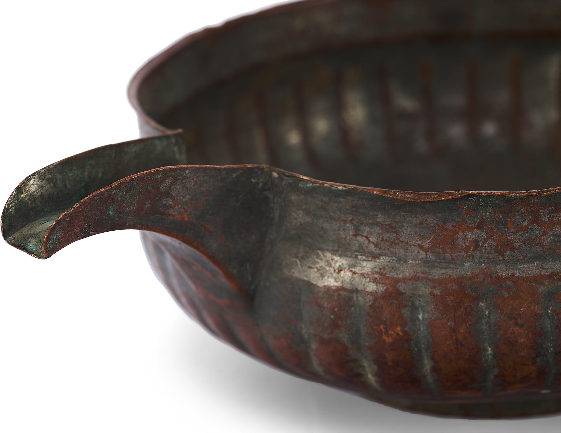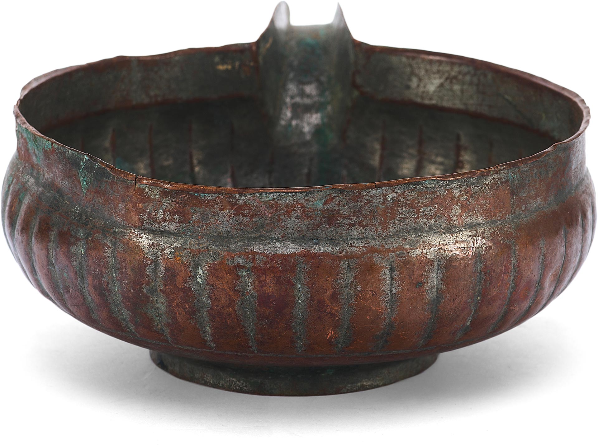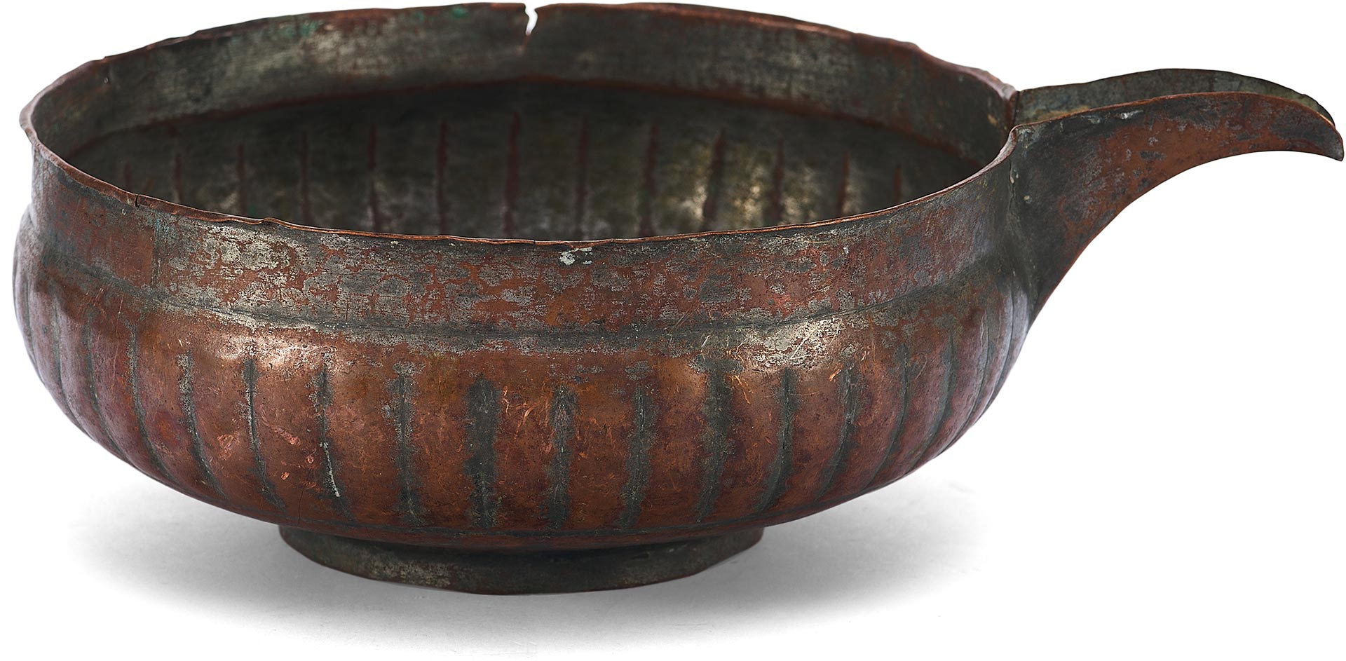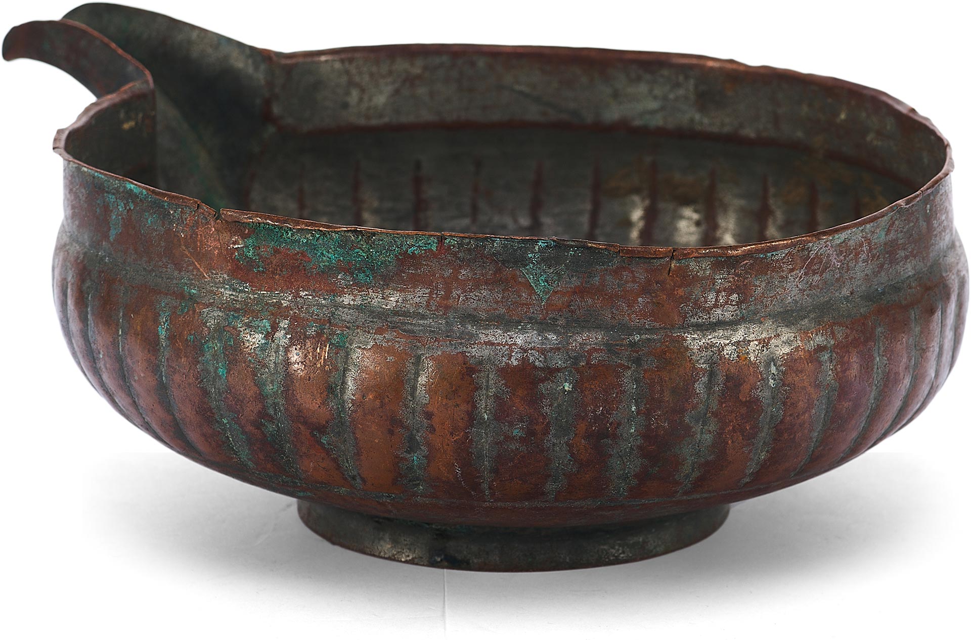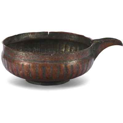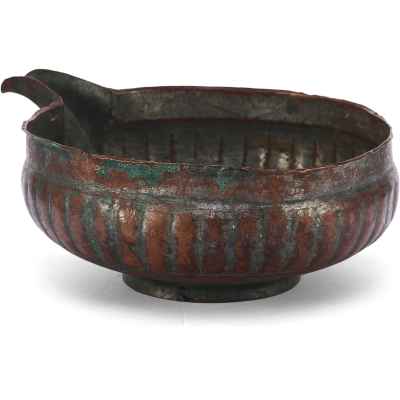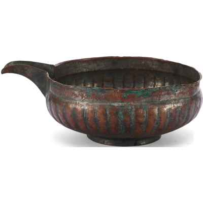 Перед нами редкий пример медной ендовы с характерным носиком и глубоким, округлым корпусом, украшенным рельефными вертикальными бороздами – приемом, известным как «разделка ложками». Этот декоративный элемент был распространён в декоративно-прикладном искусстве Древней Руси, придавая предмету объемность и визуальную пластичность.