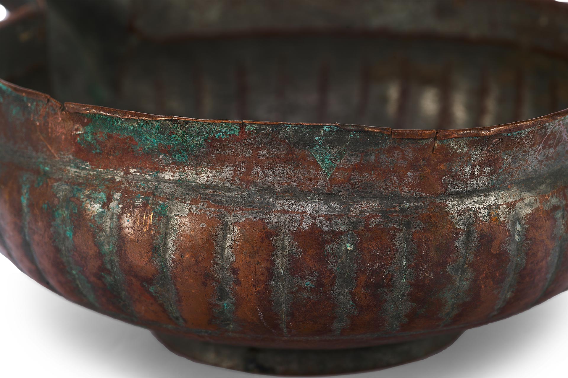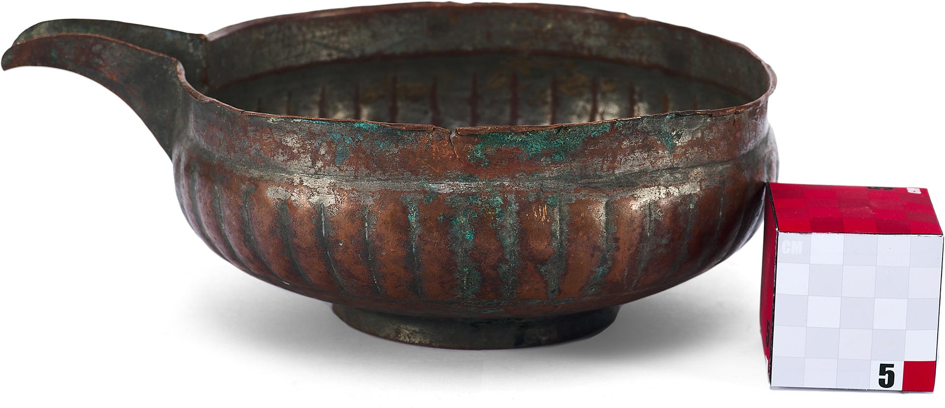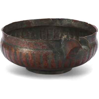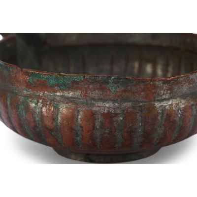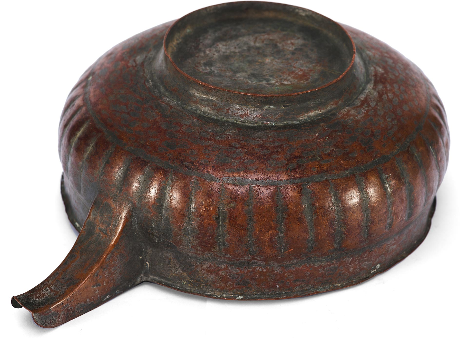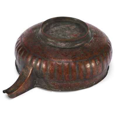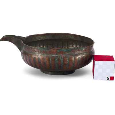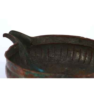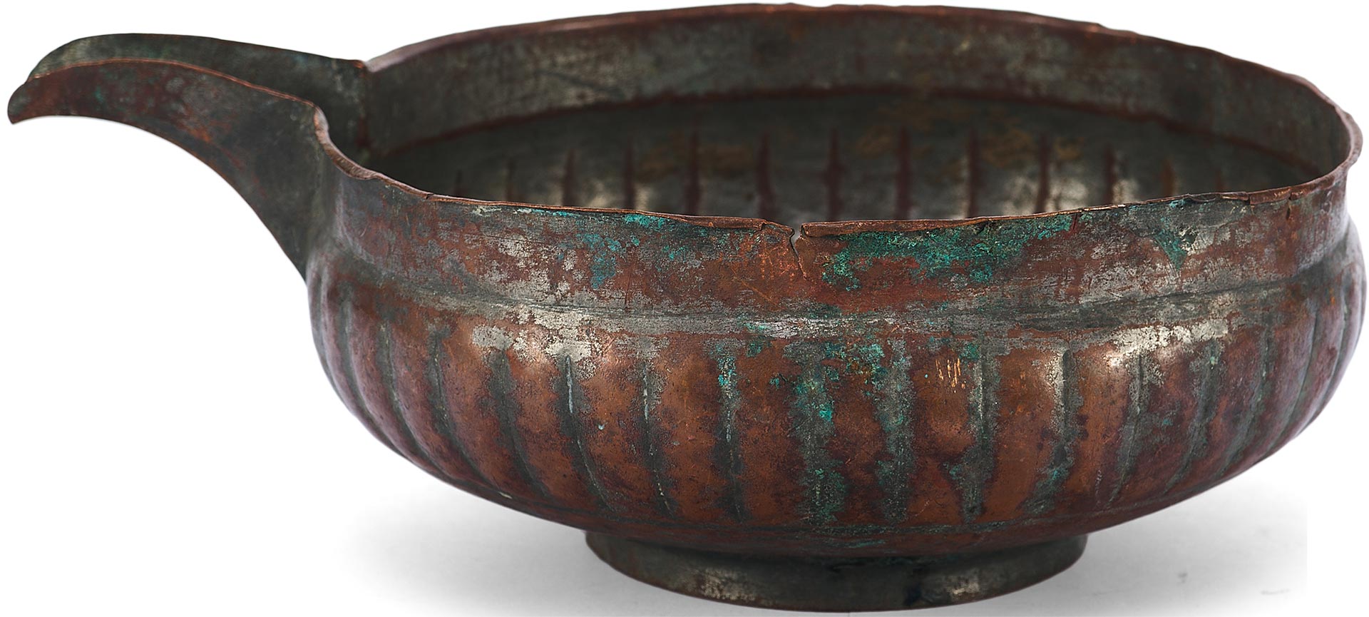 Перед нами редкий пример медной ендовы с характерным носиком и глубоким, округлым корпусом, украшенным рельефными вертикальными бороздами – приемом, известным как «разделка ложками». Этот декоративный элемент был распространён в декоративно-прикладном искусстве Древней Руси, придавая предмету объемность и визуальную пластичность.