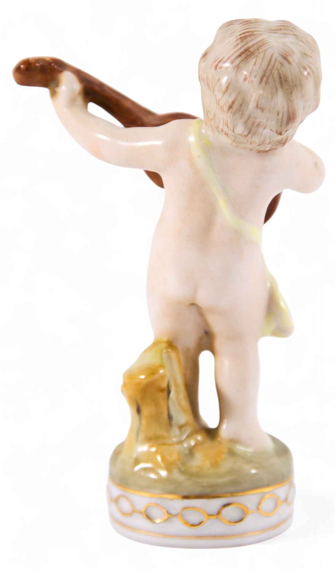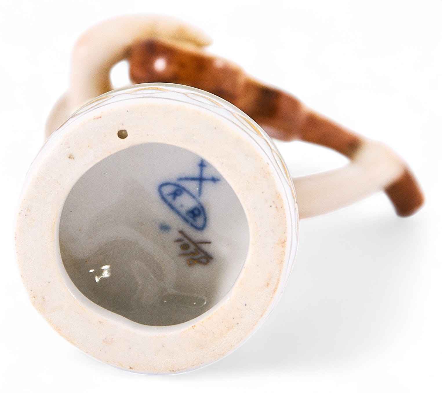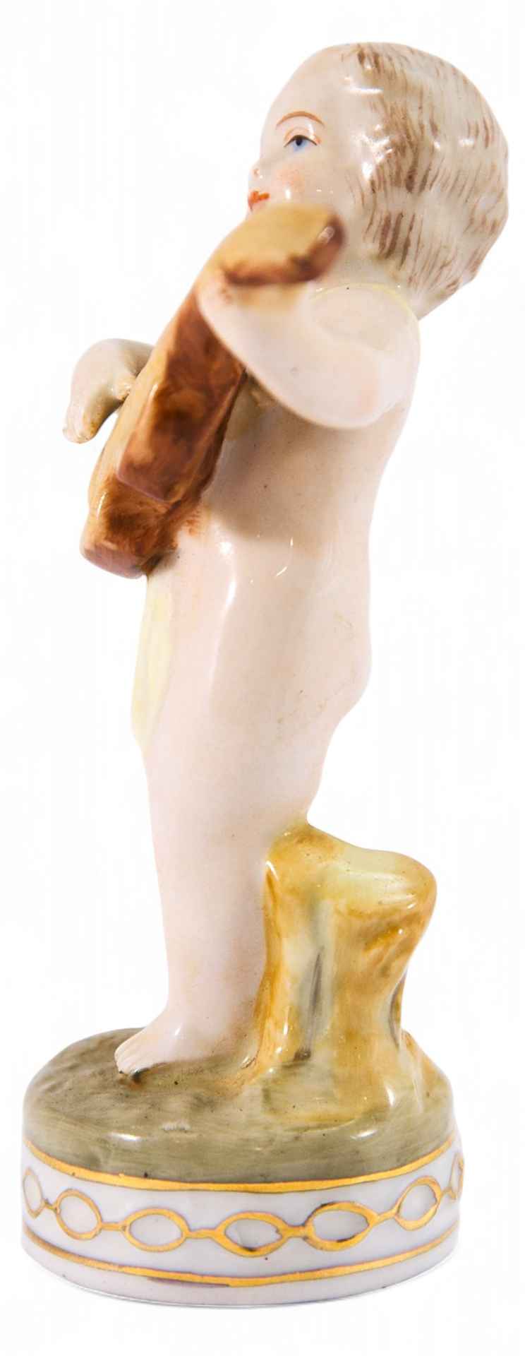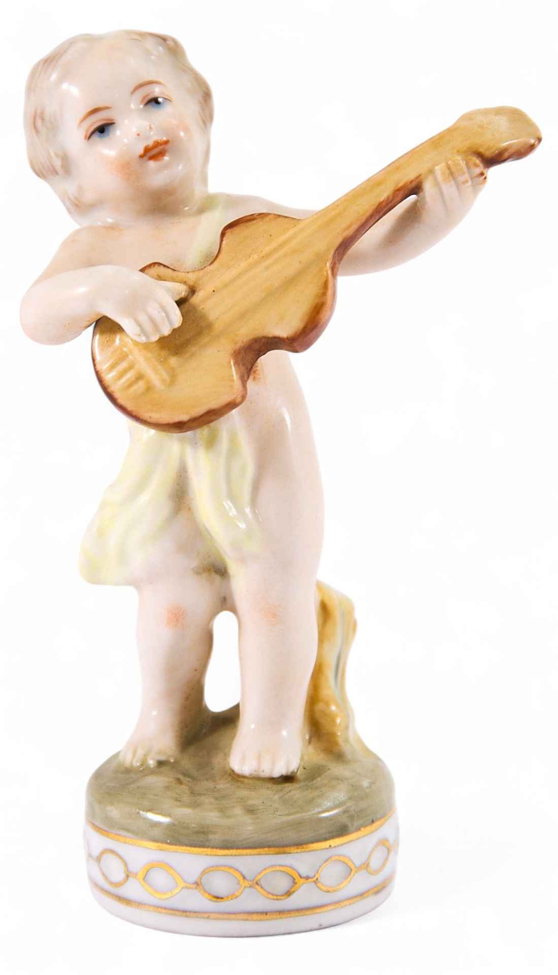 Скульптура представляющая девочку играющую на гитаре. Данная фигура относится к серии скульптур под общим названием «Детский оркестр». Судя по клейму скульптуру можно отнести имитации изделий фабрики «Фридрих Кристиан Грайнер