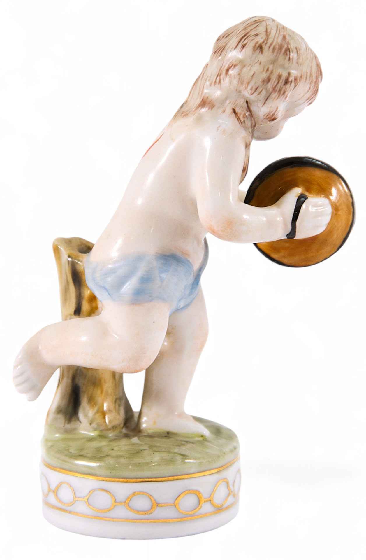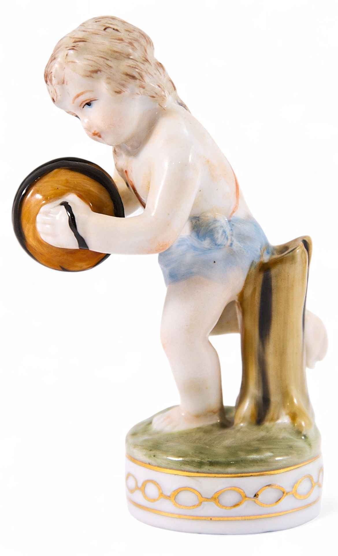 Скульптура представляющая мальчика бьющего в тарелки. Данная фигура относится к серии скульптур под общим названием «Детский оркестр». Судя по клейму скульптуру можно отнести имитации изделий фабрики «Фридрих Кристиан